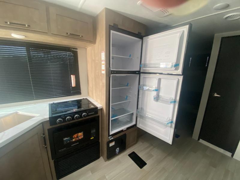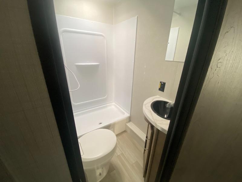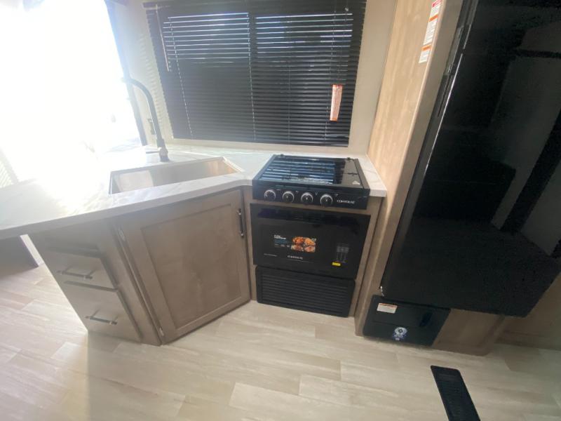What could be better than camping with double-size bunks for guests? How about a front private bedroom for you, a full bath to clean up in, and a large slide out for maximum space! The chef of your group can prepare breakfast on the cooktop in the morning or use the microwave if you're on the go. There is a U-shaped dinette to dine at, or you can take your plate outdoors to sit under the power awning.