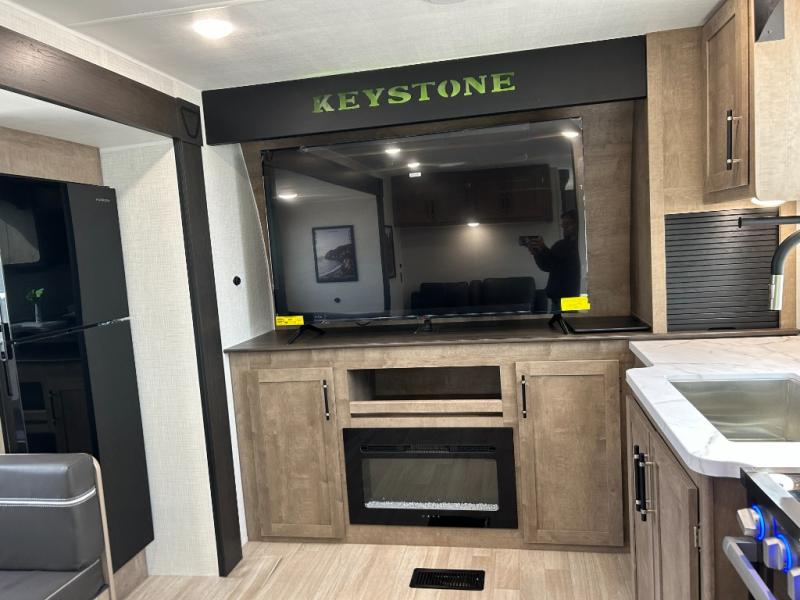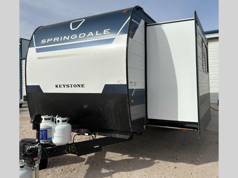 The Springdale MAX travel trailers by Keystone make extended stays easier than ever! Each one is built with an 8' wide construction, along with a flat front metal with tough coat, a fully walkable roof, and XL tinted safety glass windows. The I-beam frame with stamped steel cross-members and outriggers provides added durability, and you'll also appreciate the Tru-Fit slide construction that minimizes functional motor stress and resists leaking. A power tongue jack and power stabilizer jacks are included outside, along with SolidStep entry steps, a power awning with LED lights, and a helpful exterior convenience center. Inside, you'll find generous storage spaces, blackout night shades, USB A and C connections throughout, a hi-rise kitchen faucet, and an upgraded Oxygenics Fury showerhead to name a few comforts!