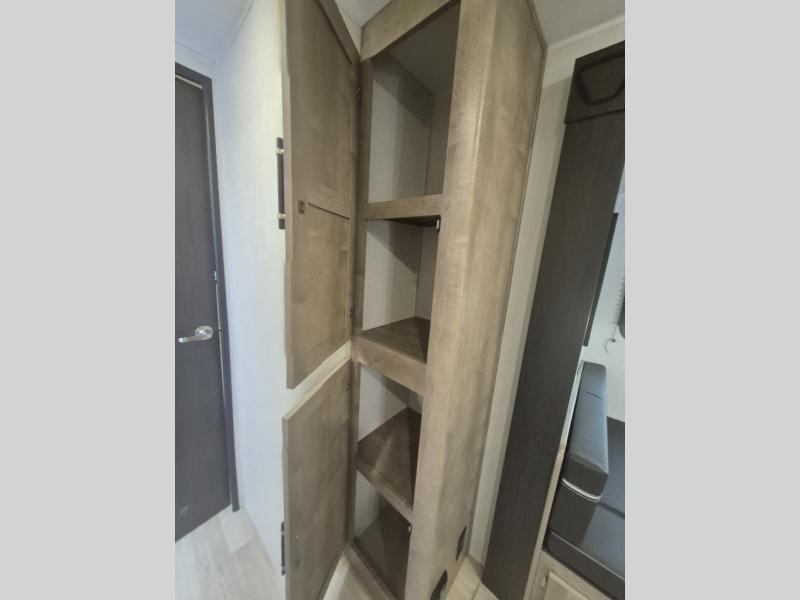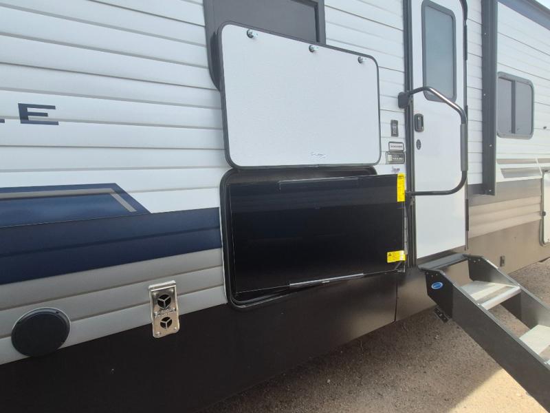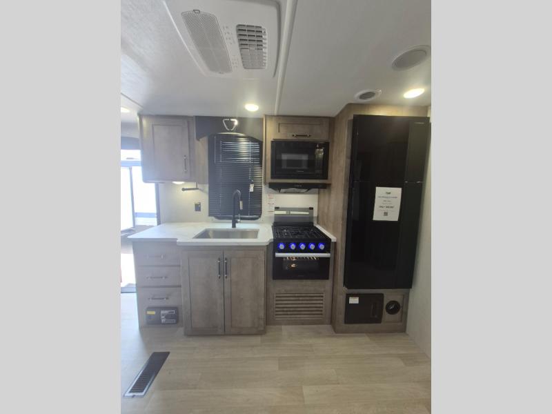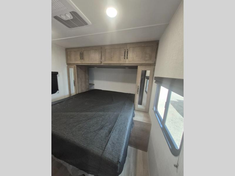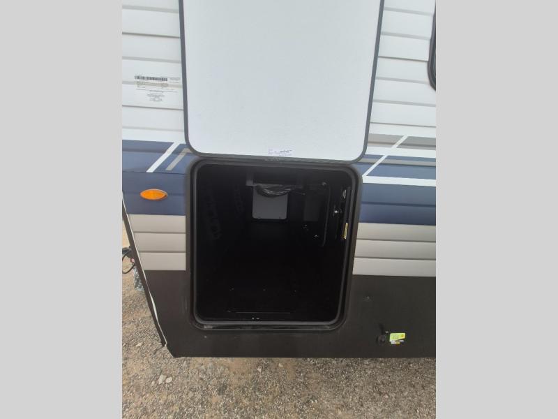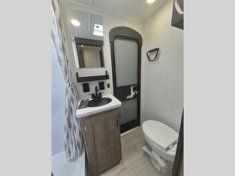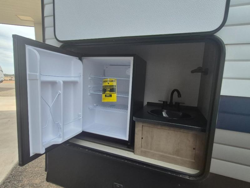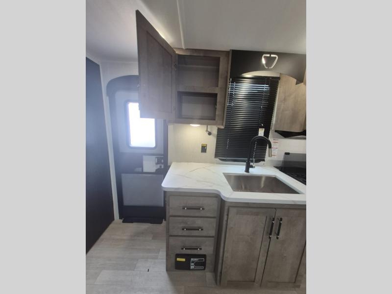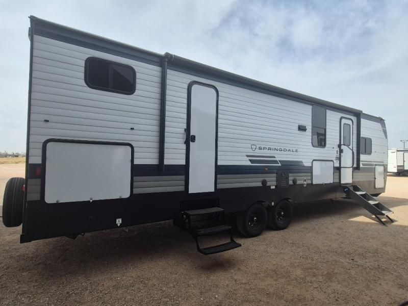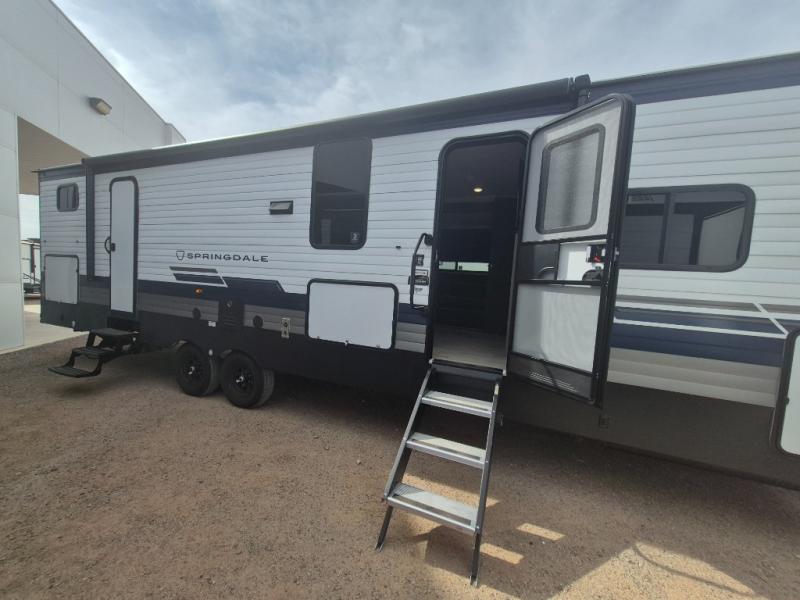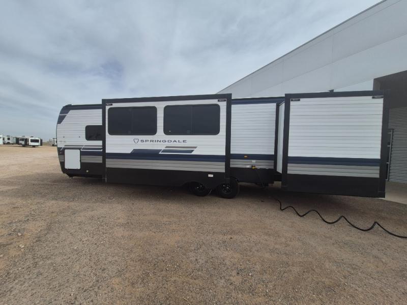 The Springdale MAX travel trailers by Keystone make extended stays easier than ever! Each one is built with an 8' wide construction, along with a flat front metal with tough coat, a fully walkable roof, and XL tinted safety glass windows. The I-beam frame with stamped steel cross-members and outriggers provides added durability, and you'll also appreciate the Tru-Fit slide construction that minimizes functional motor stress and resists leaking. A power tongue jack and power stabilizer jacks are included outside, along with SolidStep entry steps, a power awning with LED lights, and a helpful exterior convenience center. Inside, you'll find generous storage spaces, blackout night shades, USB A and C connections throughout, a hi-rise kitchen faucet, and an upgraded Oxygenics Fury showerhead to name a few comforts!