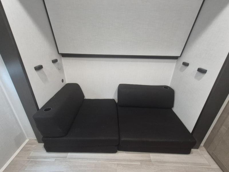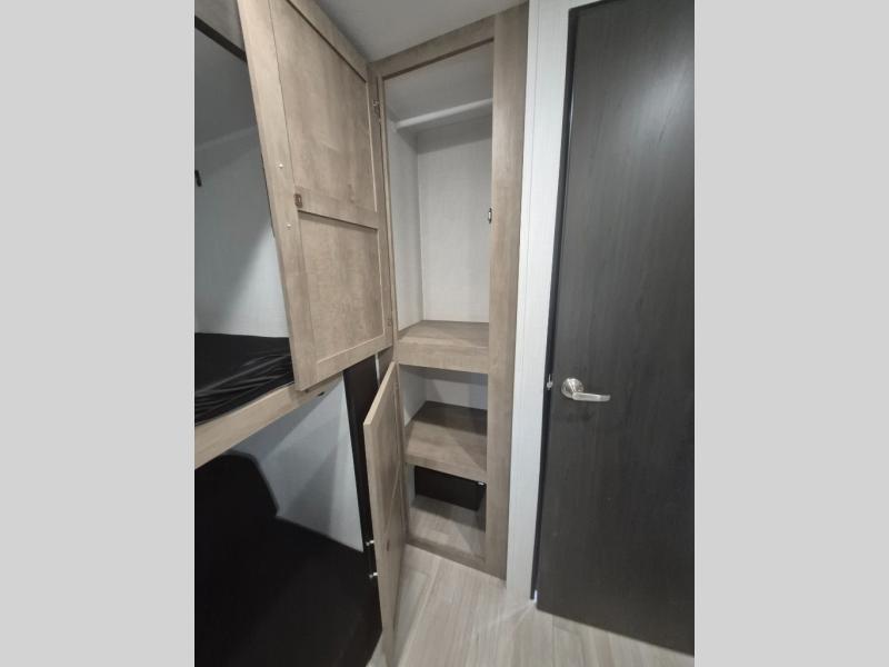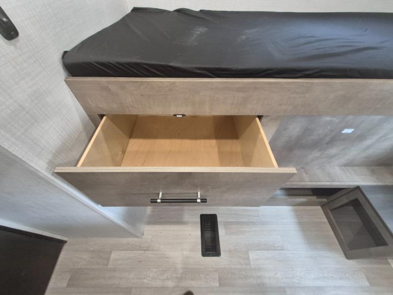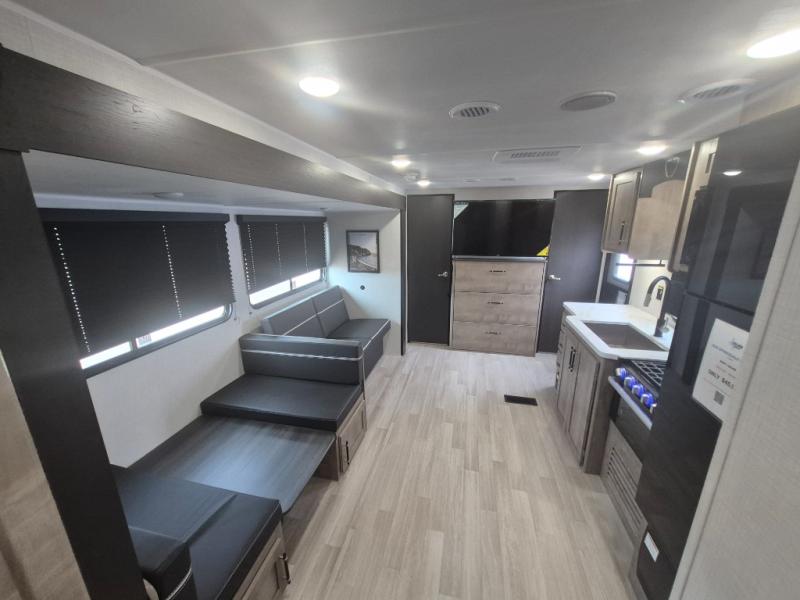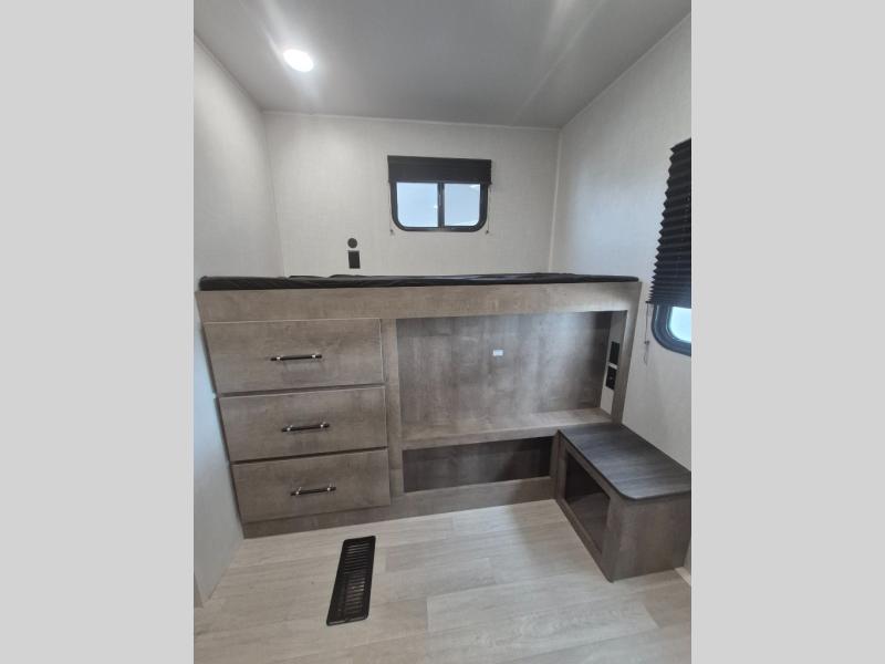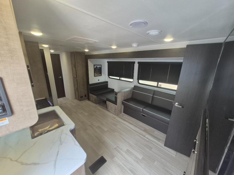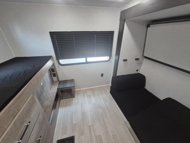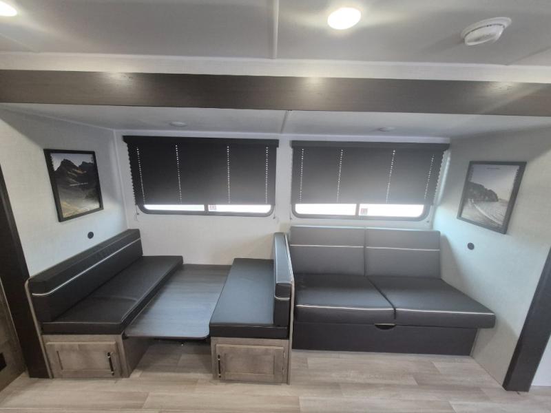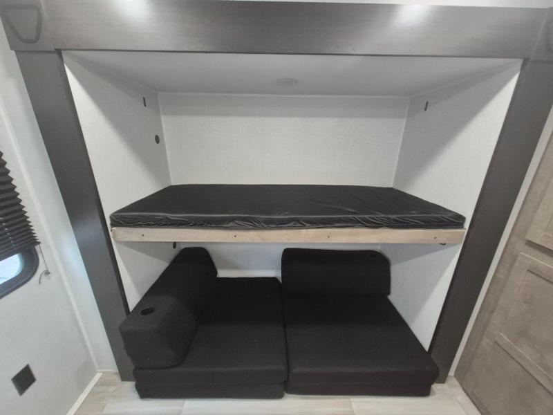 This bunkhouse travel trailer is a great choice for families who want extra sleeping space and a comfy hangout zone. The rear bunkhouse gives the kids or guests their own retreat, with a bunk and a flip-up bunk that opens up the floor for playing or stashing gear when it’s time to travel. Dual entry doors make life easier at the campsite, including an entrance that leads directly into the full bathroom so muddy feet and late-night trips don’t track through the whole trailer. In the main living area, a sofa and booth dinette within the slide out creates a roomy spot to relax, eat, play games, or convert to extra sleeping space as needed, and up front you’ll find an Olympic queen bed that gives you more room to stretch out than a standard queen.