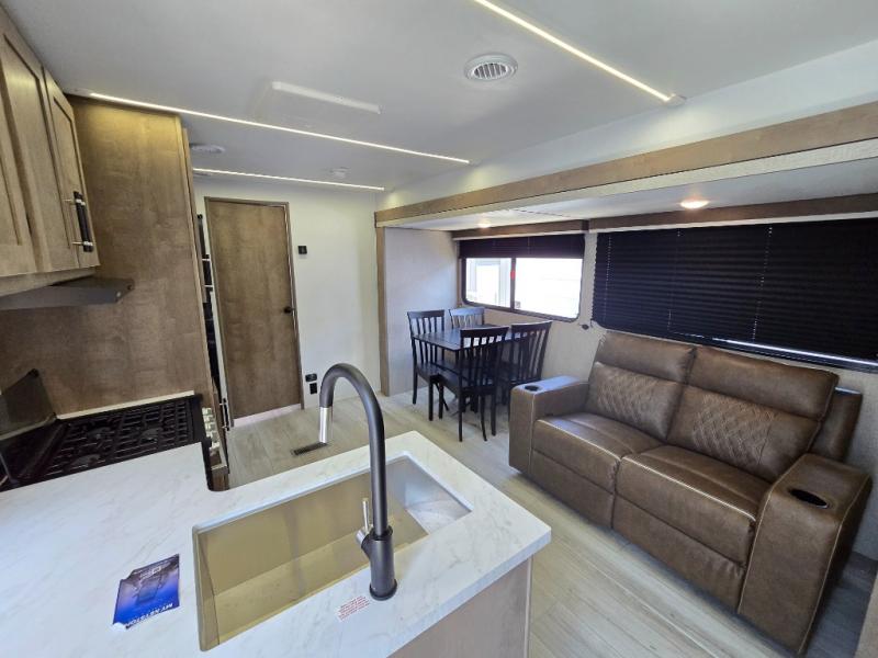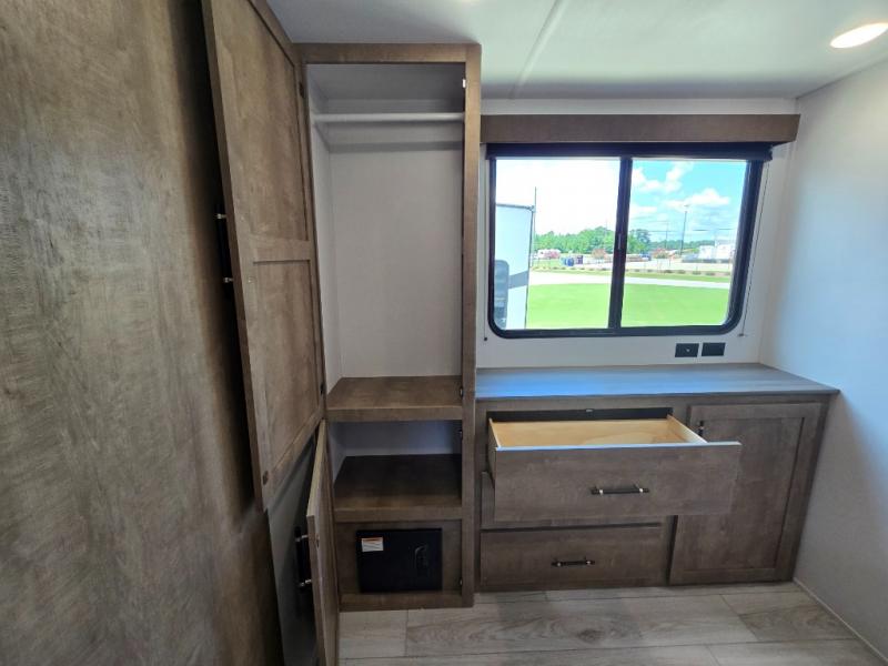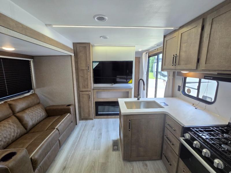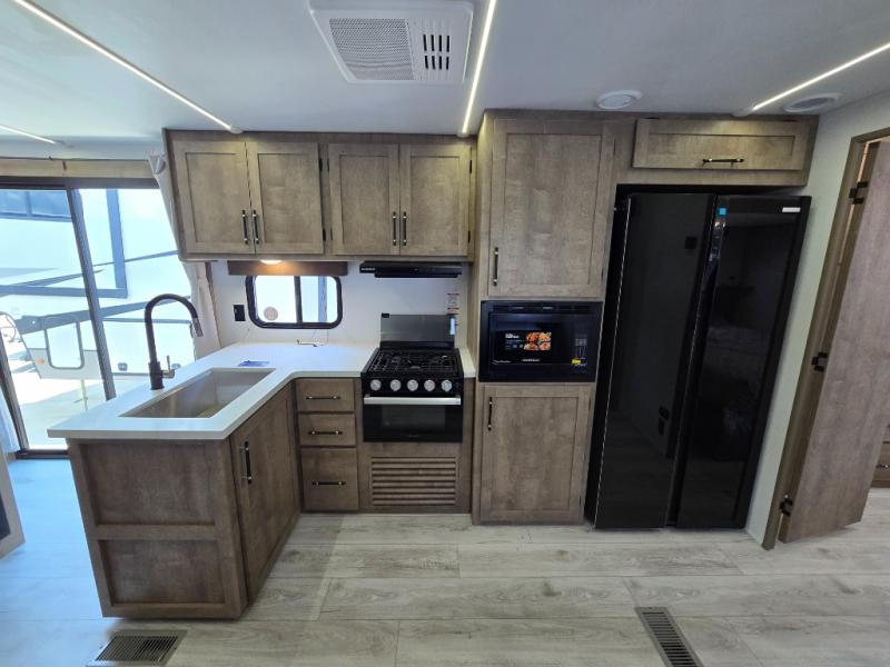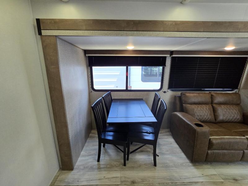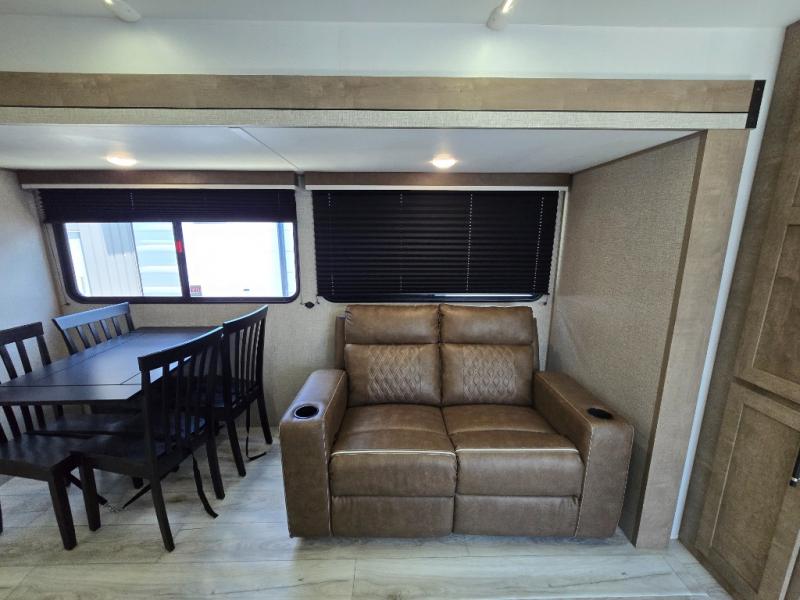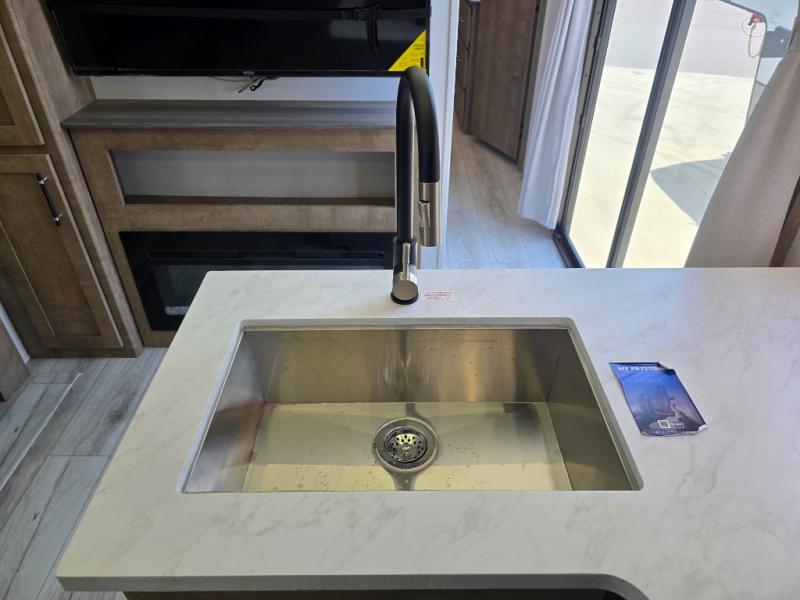 You can't go wrong with this spacious destination travel trailer in tow! Once you arrive at your destination, you can put out the 20' power awning and relax with a cold drink. The full kitchen includes all the appliances needed to make lunch, and you can dine at the flex lounge or relax on the tri-fold sofa. An entertainment center with a fireplace will make this space feel more like home, and the large slide gives the dog space to nap on the floor. The master bedroom towards the back includes a queen bed slide, dual closets and a TV, plus a full rear bath for added convenience. You'll find the second full bath up front by the second bedroom, along with a king bed slide, a spacious closet, plus washer and dryer prep if you choose to add these appliances.