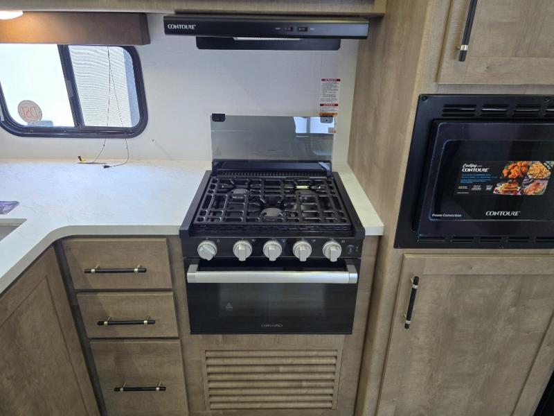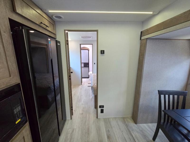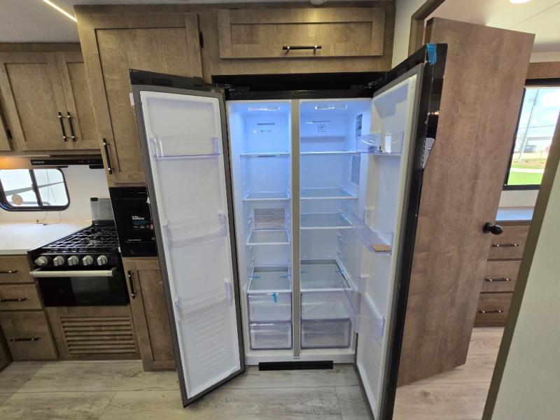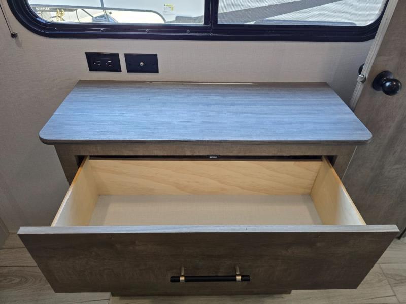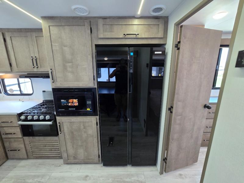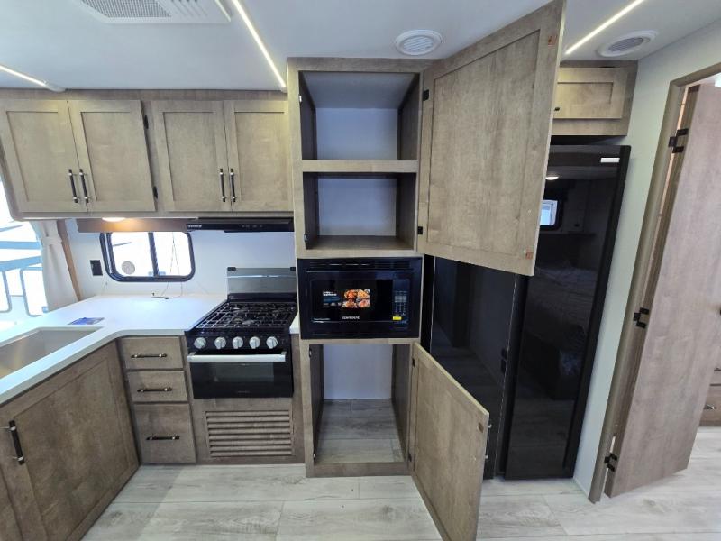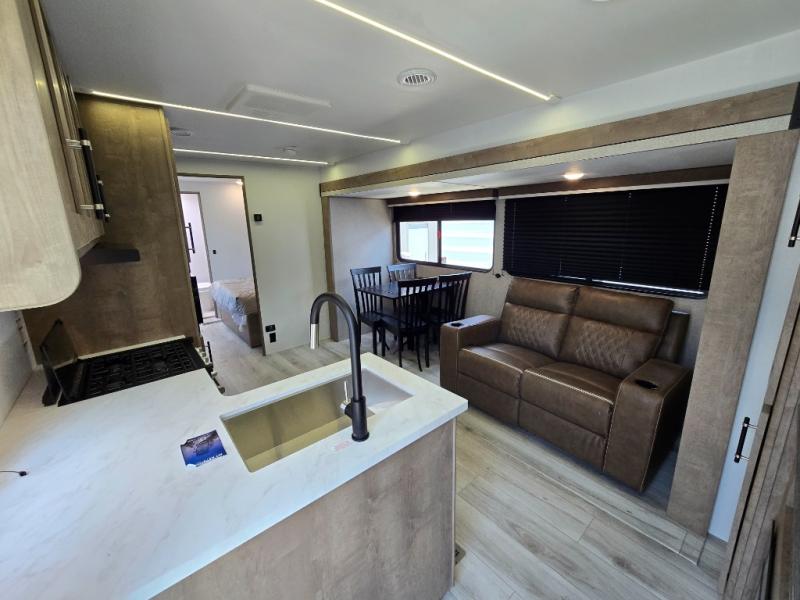 You can't go wrong with this spacious destination travel trailer in tow! Once you arrive at your destination, you can put out the 20' power awning and relax with a cold drink. The full kitchen includes all the appliances needed to make lunch, and you can dine at the flex lounge or relax on the tri-fold sofa. An entertainment center with a fireplace will make this space feel more like home, and the large slide gives the dog space to nap on the floor. The master bedroom towards the back includes a queen bed slide, dual closets and a TV, plus a full rear bath for added convenience. You'll find the second full bath up front by the second bedroom, along with a king bed slide, a spacious closet, plus washer and dryer prep if you choose to add these appliances.
