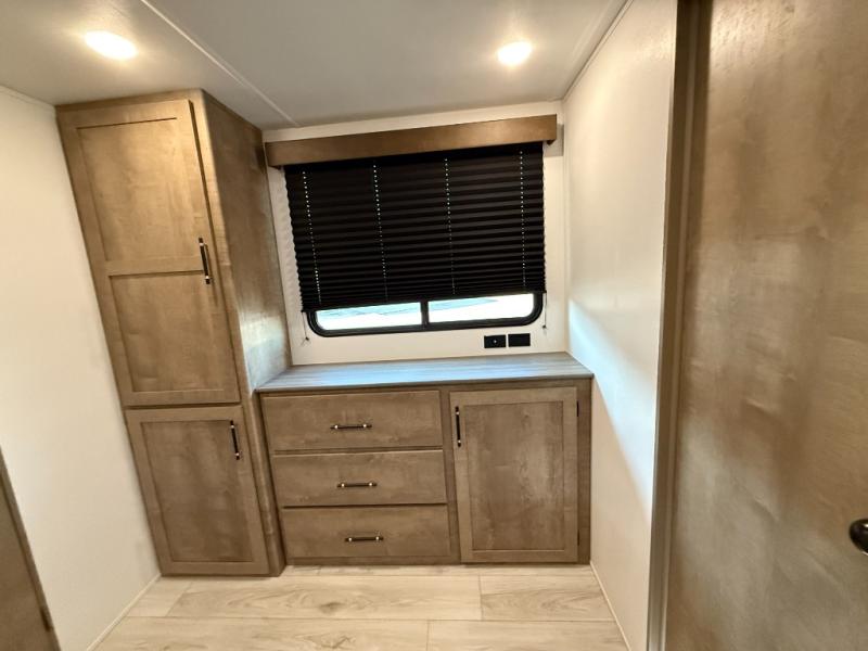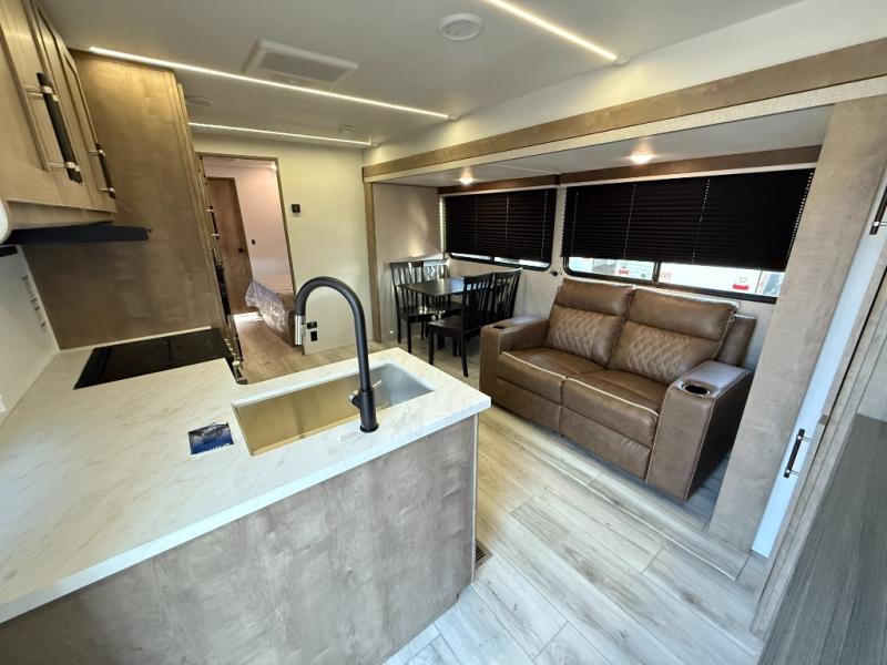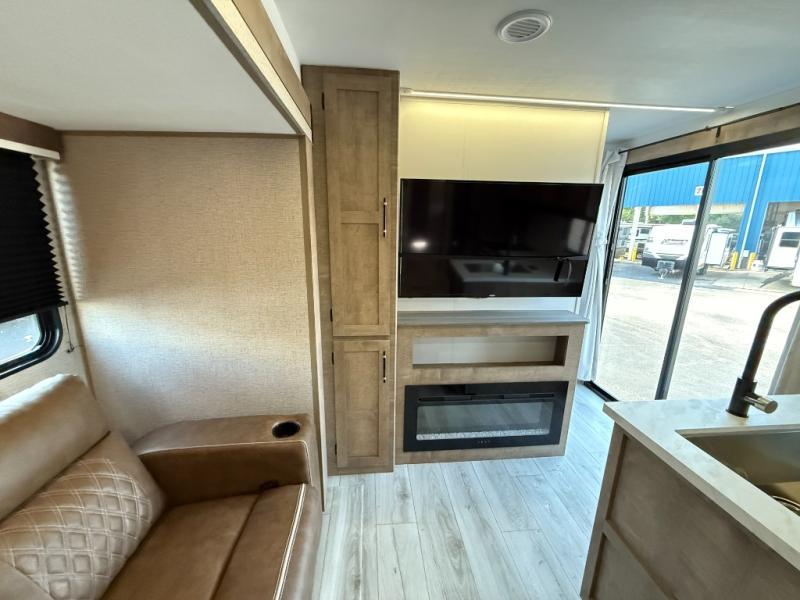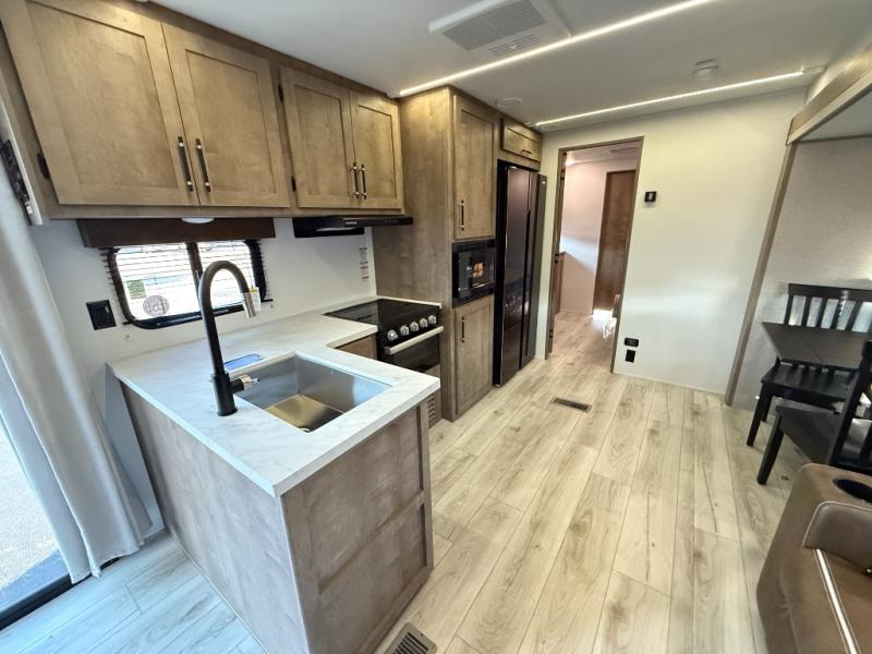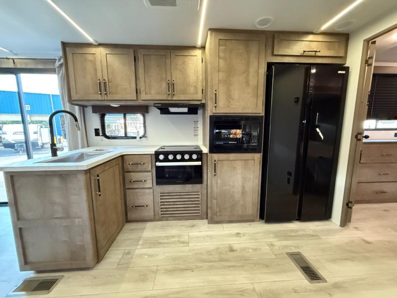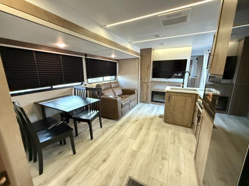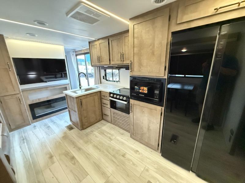 You can't go wrong with this spacious destination travel trailer in tow! Once you arrive at your destination, you can put out the 20' power awning and relax with a cold drink. The full kitchen includes all the appliances needed to make lunch, and you can dine at the flex lounge or relax on the tri-fold sofa. An entertainment center with a fireplace will make this space feel more like home, and the large slide gives the dog space to nap on the floor. The master bedroom towards the back includes a queen bed slide, dual closets and a TV, plus a full rear bath for added convenience. You'll find the second full bath up front by the second bedroom, along with a king bed slide, a spacious closet, plus washer and dryer prep if you choose to add these appliances.