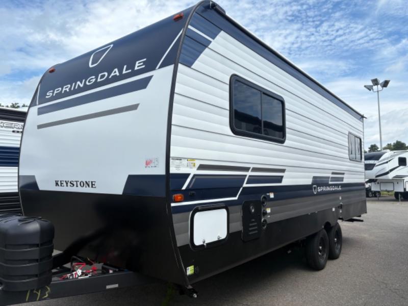 The Springdale Classic travel trailers by Keystone will provide you and your family many great outdoor experiences and it will also be kind to your pocketbook. Each one is constructed with a walkable roof and an I-beam frame with stamped steel cross-members and outriggers for added strength. There are also heavy duty stabilizer jacks and power tongue jacks outside, along with an XL entry assist handle for added convenience. Each travel trailer includes LED lighting, bedside outlets, and blackout night shades inside that will provide you with more privacy at night.