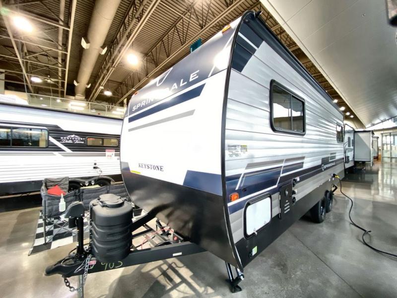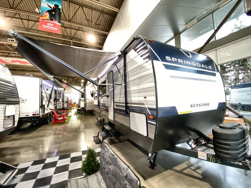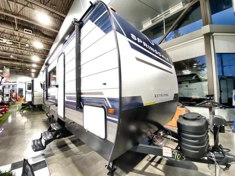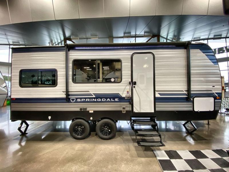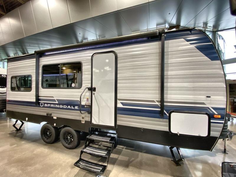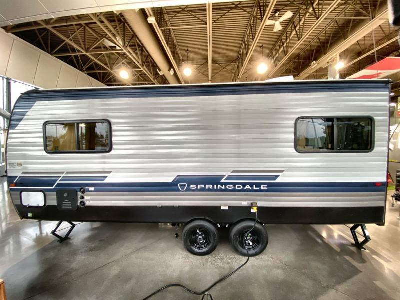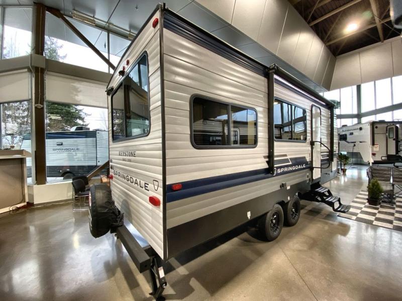 The Springdale Classic travel trailers by Keystone will provide you and your family many great outdoor experiences and it will also be kind to your pocketbook. Each one is constructed with a walkable roof and an I-beam frame with stamped steel cross-members and outriggers for added strength. There are also heavy-duty stabilizer jacks and power tongue jacks outside, along with an XL entry assist handle for added convenience. Each travel trailer includes LED lighting, bedside outlets, and blackout night shades inside that will provide you with more privacy at night.