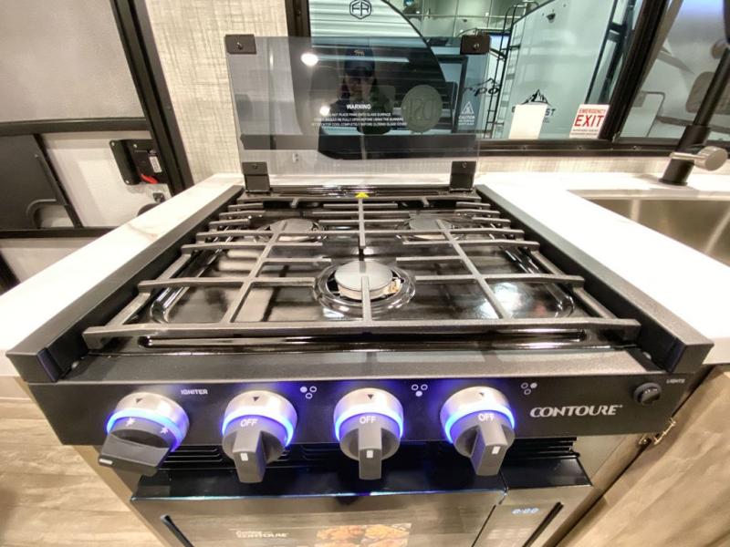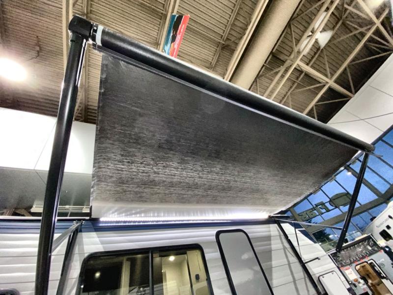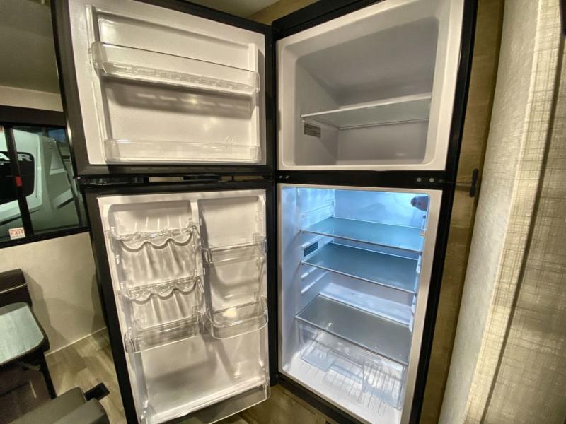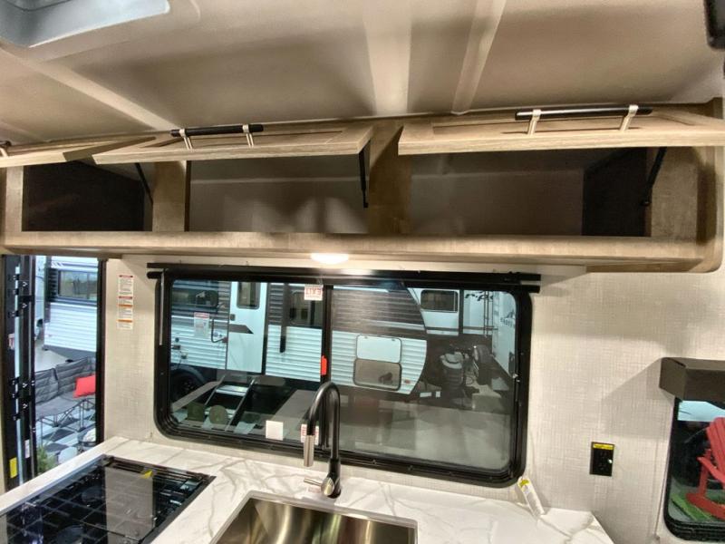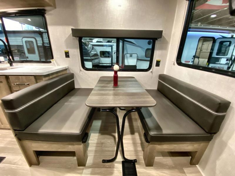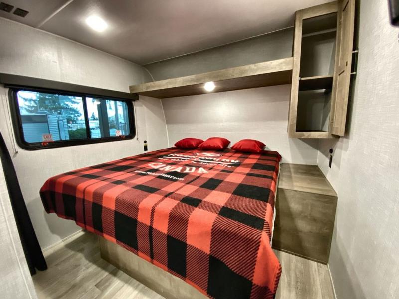 This trailer is perfect for your crew of four to six. There is a queen bed in the front bedroom, along with dual closets and nightstands to keep your things tidy. You can dine each day on the booth dinette, relax on the sofa, and house additional guests here at night. The kitchen includes everything you need to prepare meals each day, including a gas range, microwave, and a 10-cu. ft. 12V refrigerator for cold items. And the full bath on board lets you stay clean throughout each camping trip!