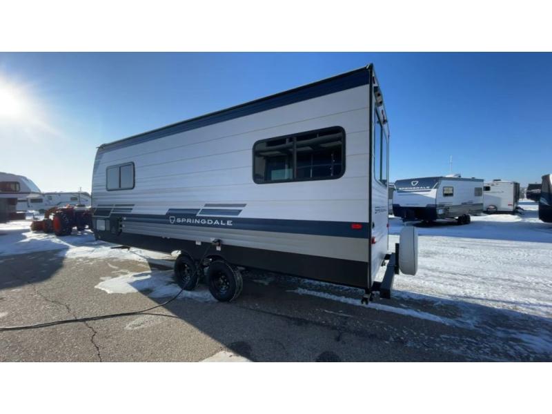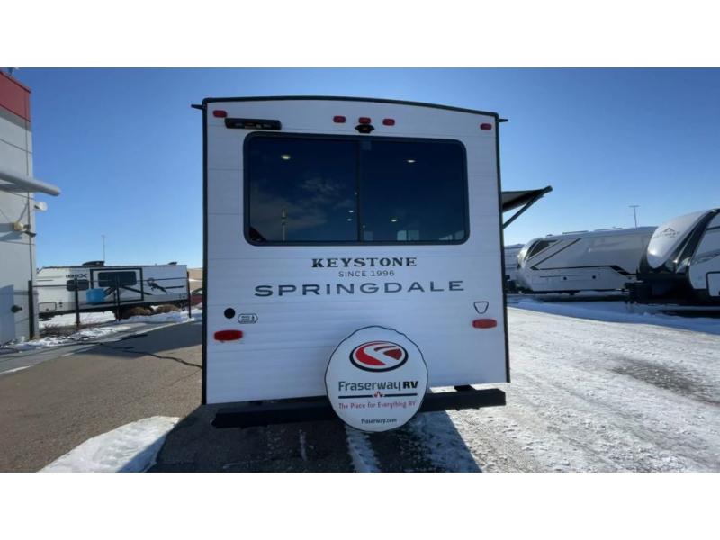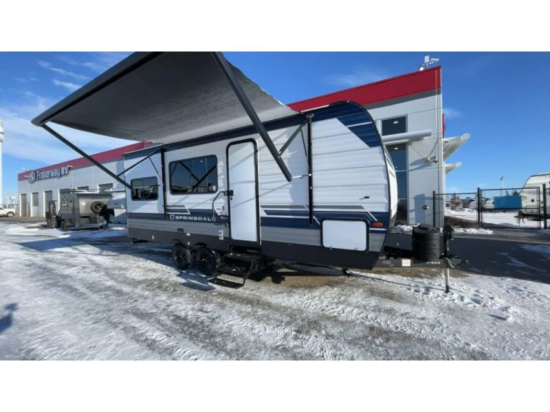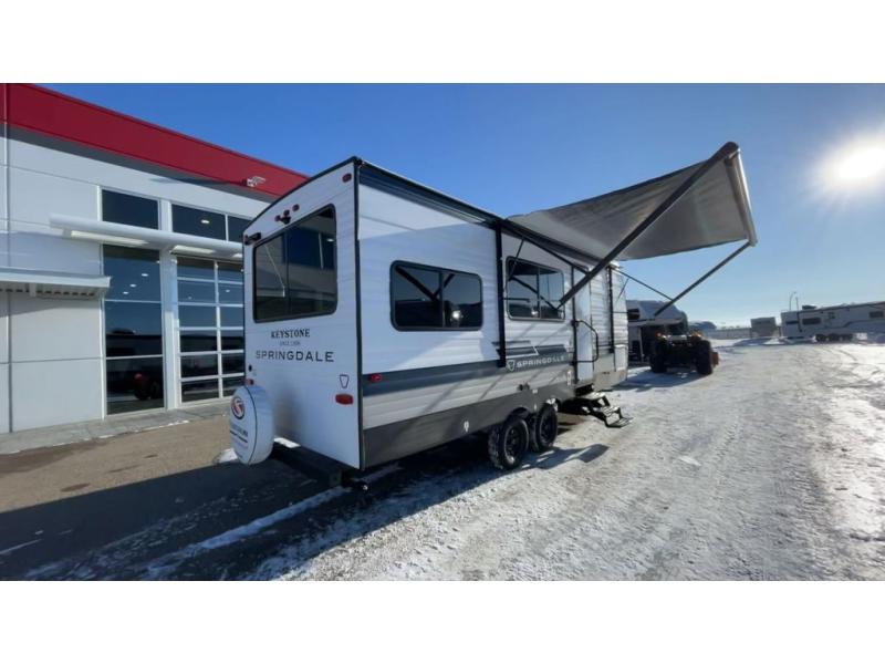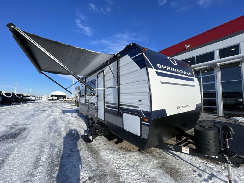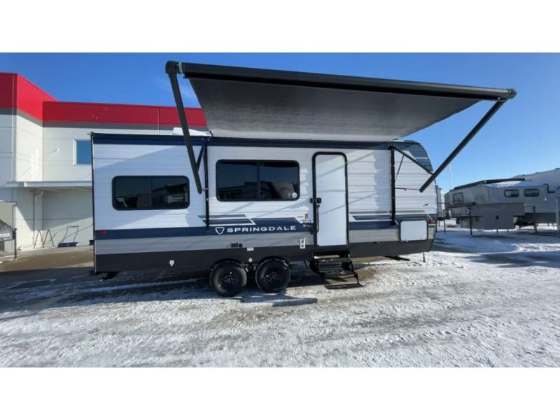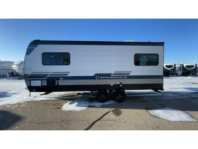 The Springdale Classic travel trailers by Keystone will provide you and your family many great outdoor experiences and it will also be kind to your pocketbook. Each one is constructed with a walkable roof and an I-beam frame with stamped steel cross-members and outriggers for added strength. There are also heavy-duty stabilizer jacks and power tongue jacks outside, along with an XL entry assist handle for added convenience. Each travel trailer includes LED lighting, bedside outlets, and blackout night shades inside that will provide you with more privacy at night.