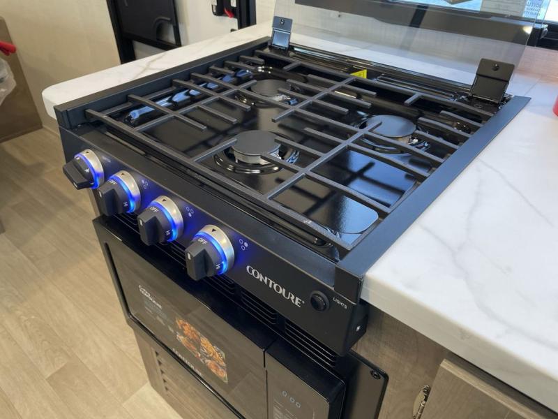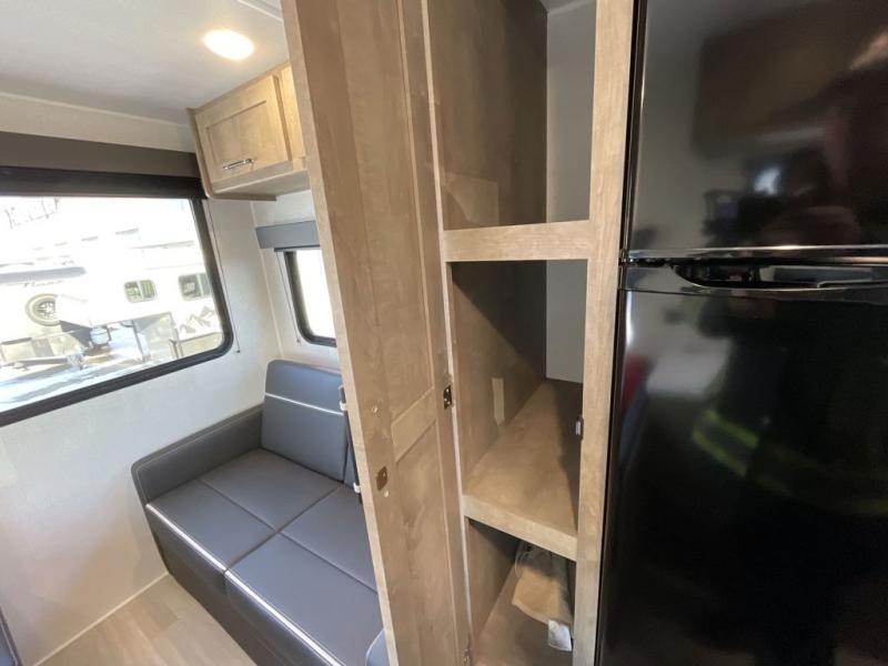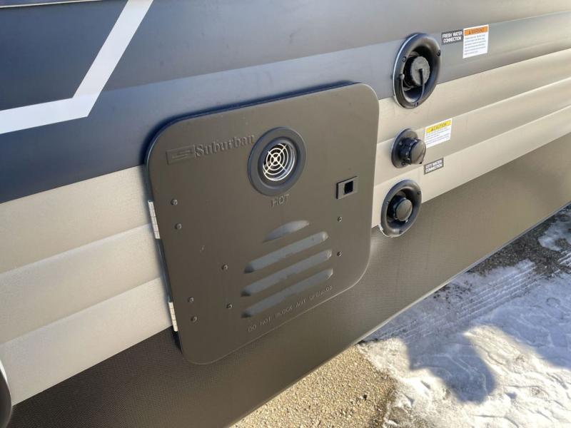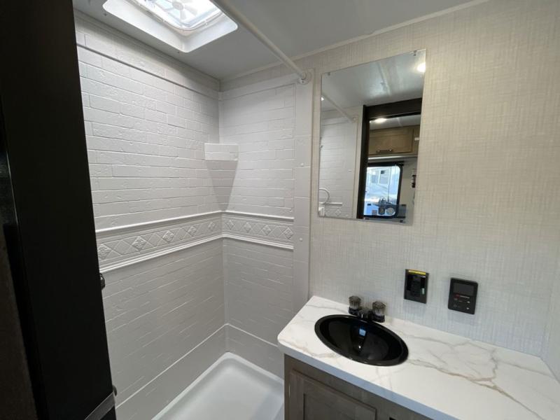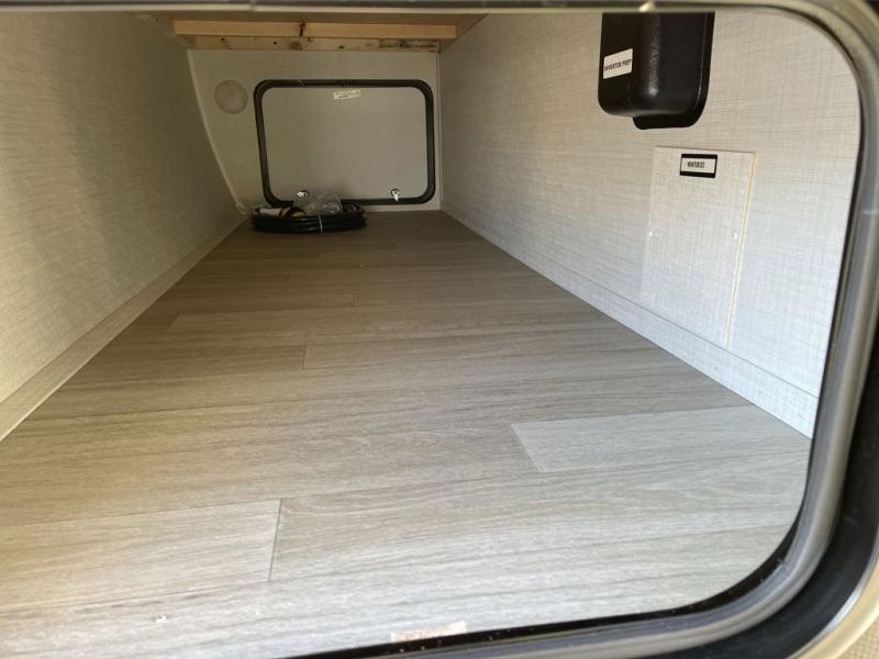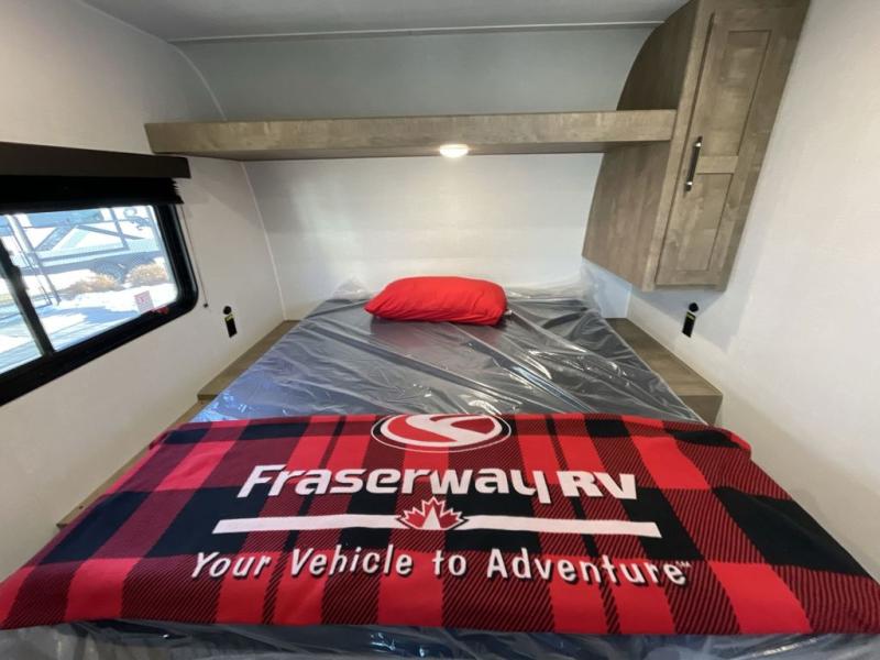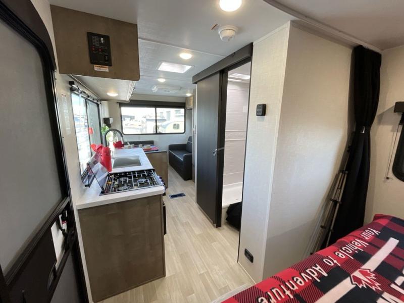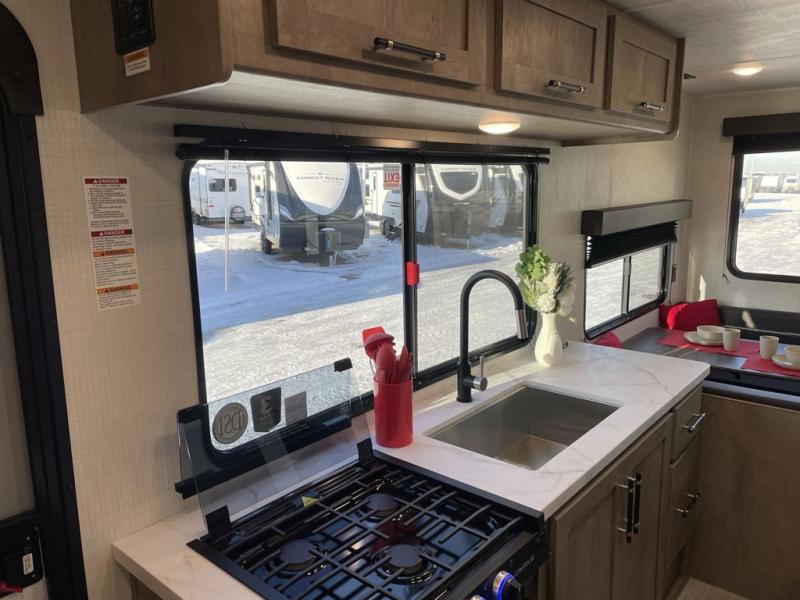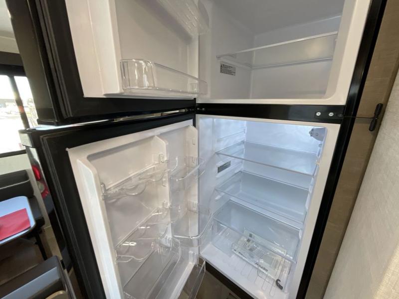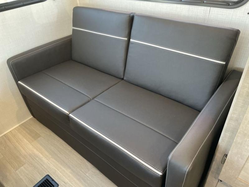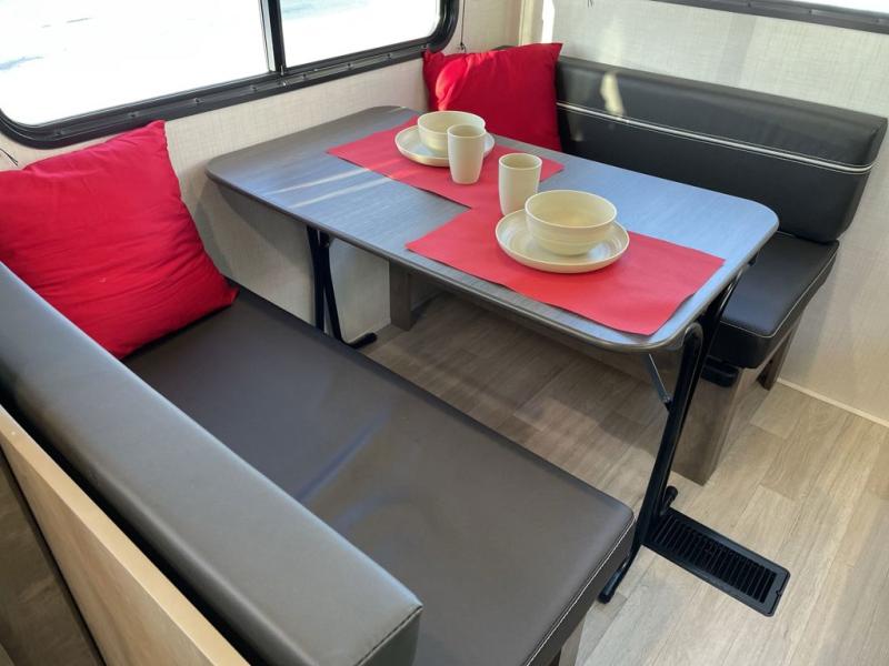 This trailer is perfect for your crew of four to six. There is a queen bed in the front bedroom, along with dual closets and nightstands to keep your things tidy. You can dine each day on the booth dinette, relax on the sofa, and house additional guests here at night. The kitchen includes everything you need to prepare meals each day, including a gas range, microwave, and a 10-cu. ft. 12V refrigerator for cold items. And the full bath on board lets you stay clean throughout each camping trip!