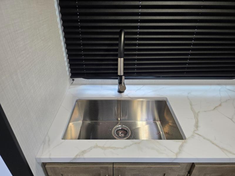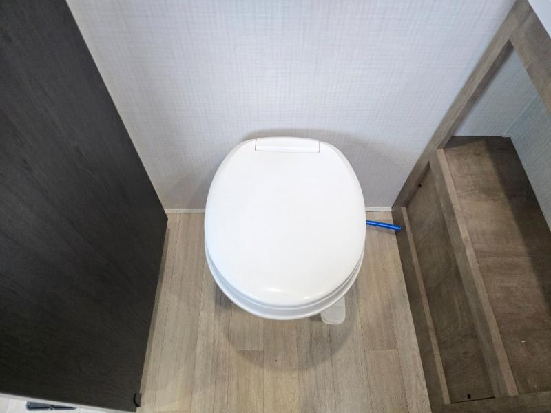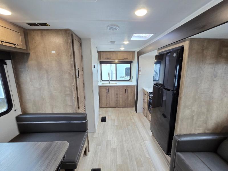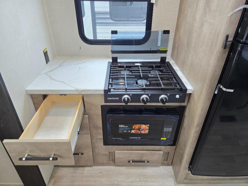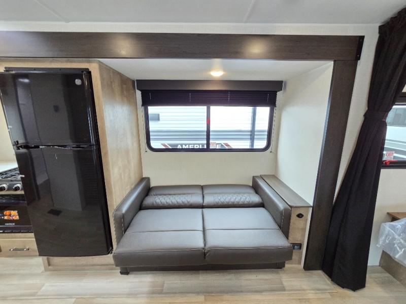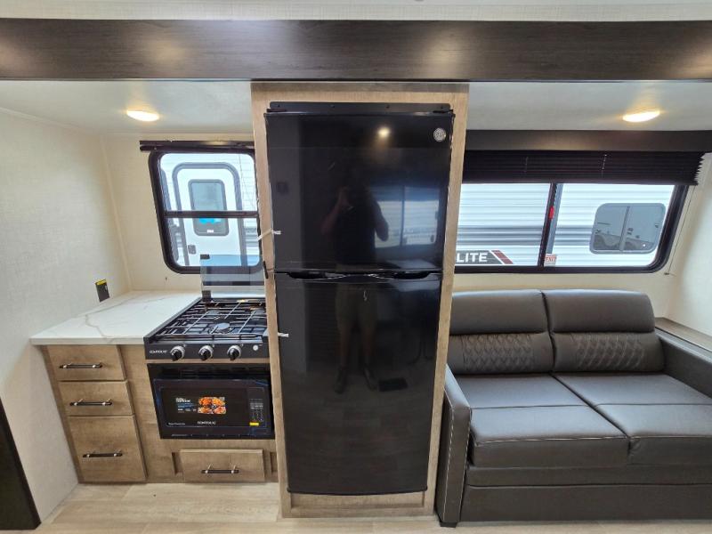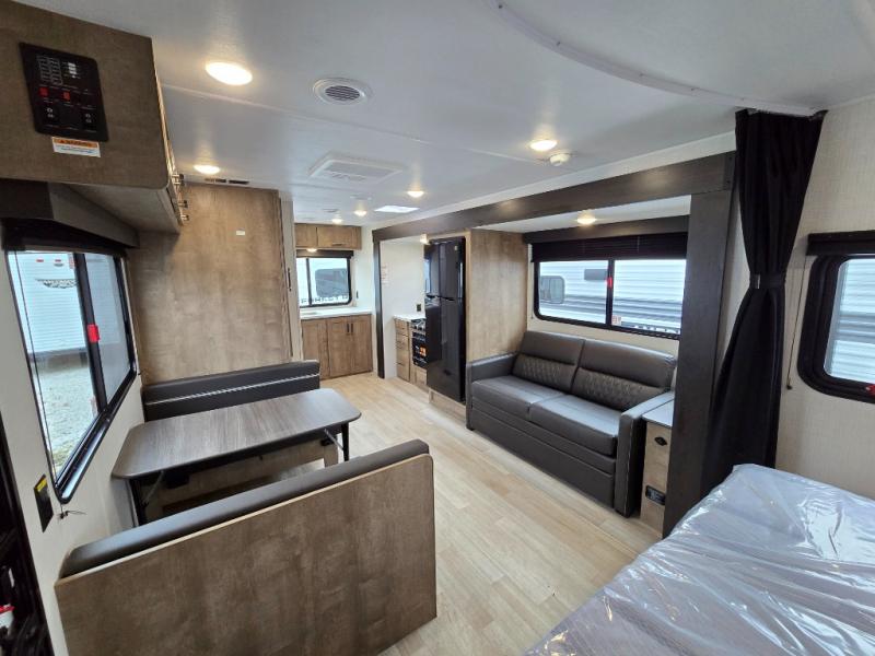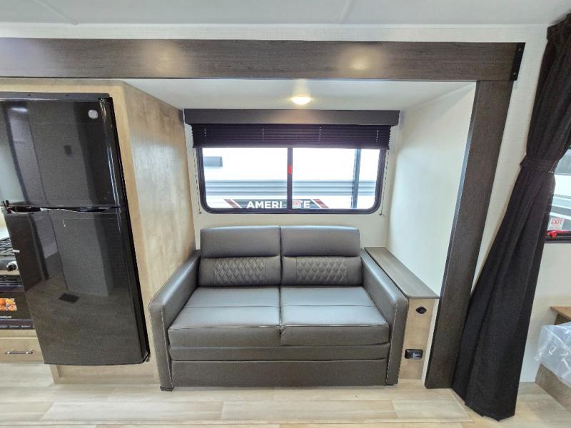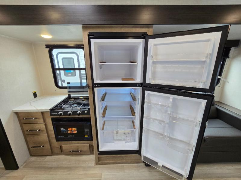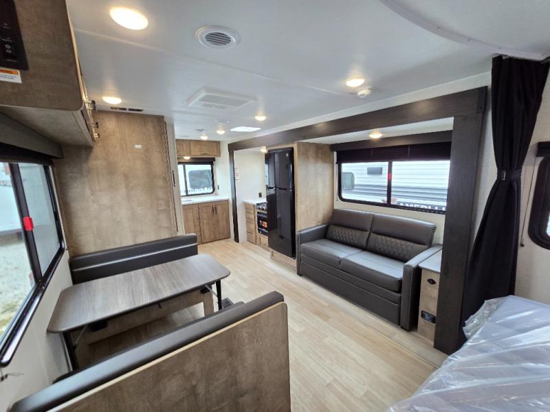You'll love the added space in this travel trailer thanks to the large slide out. Here, you'll find the sofa with an end table, plus the 12V refrigerator and three burner gas range. There is kitchen counter space in the rear corner, and you'll find the full bath in the other rear corner for easy use. The front queen bed includes a privacy curtain for when you have guests staying over on the sofa and booth dinette, plus there are dual bedside closets and nightstands for your things!