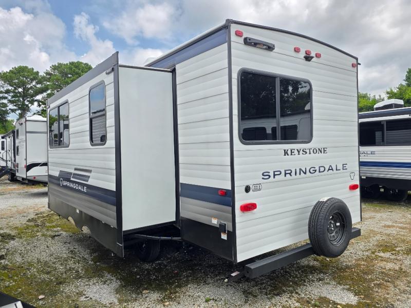 The Springdale Classic travel trailers by Keystone will provide you and your family many great outdoor experiences and it will also be kind to your pocketbook. Each one is constructed with a walkable roof and an I-beam frame with stamped steel cross-members and outriggers for added strength. There are also heavy duty stabilizer jacks and power tongue jacks outside, along with an XL entry assist handle for added convenience. Each travel trailer includes LED lighting, bedside outlets, and blackout night shades inside that will provide you with more privacy at night.