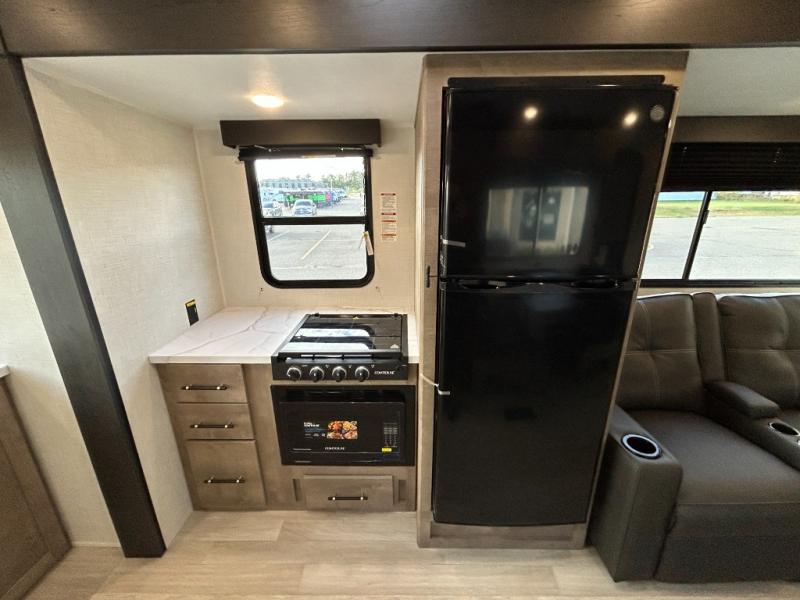 You'll love the added space in this travel trailer thanks to the large slide out. Here, you'll find the sofa with an end table, plus the 12V refrigerator and three burner gas range. There is kitchen counter space in the rear corner, and you'll find the full bath in the other rear corner for easy use. The front queen bed includes a privacy curtain for when you have guests staying over on the sofa and booth dinette, plus there are dual bedside closets and nightstands for your things!