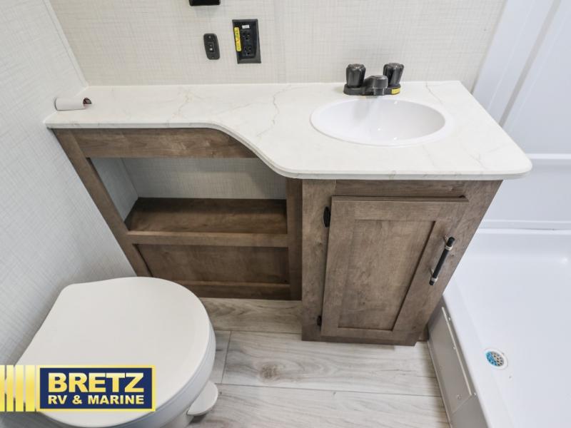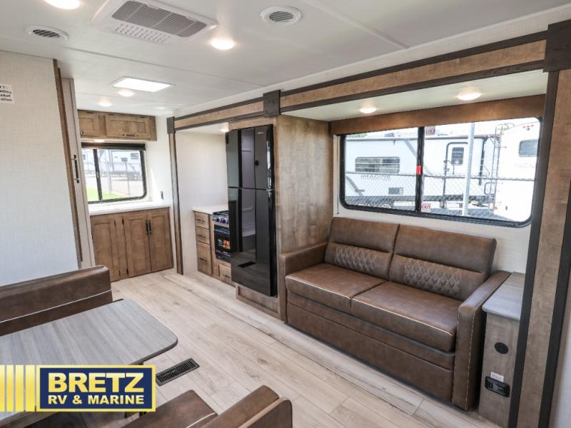 You'll love the added space in this travel trailer thanks to the large slide out. Here, you'll find the sofa with an end table, plus the 12V refrigerator and three burner gas range. There is kitchen counter space in the rear corner, and you'll find the full bath in the other rear corner for easy use. The front queen bed includes a privacy curtain for when you have guests staying over on the sofa and booth dinette, plus there are dual bedside closets and nightstands for your things!
