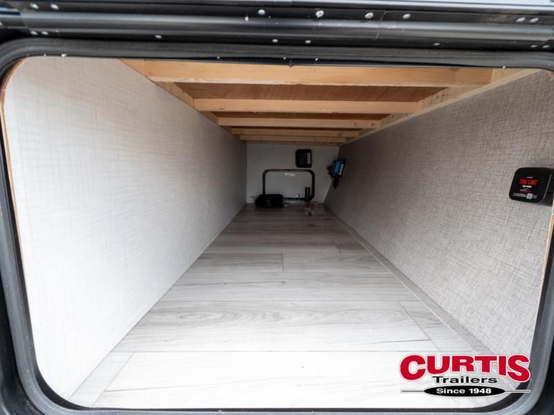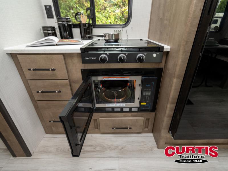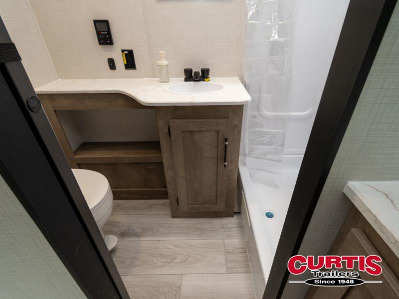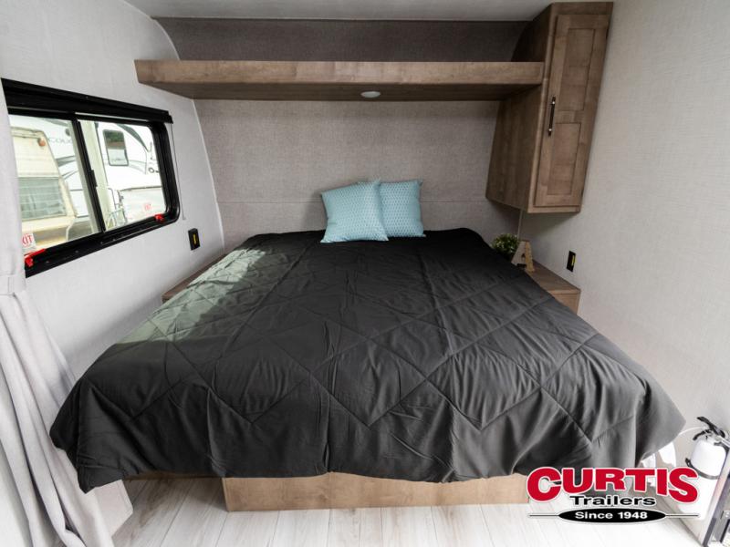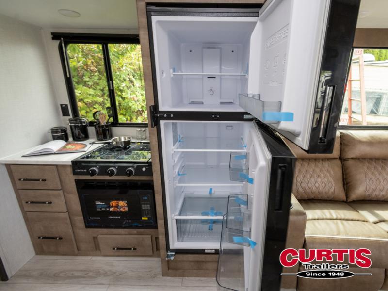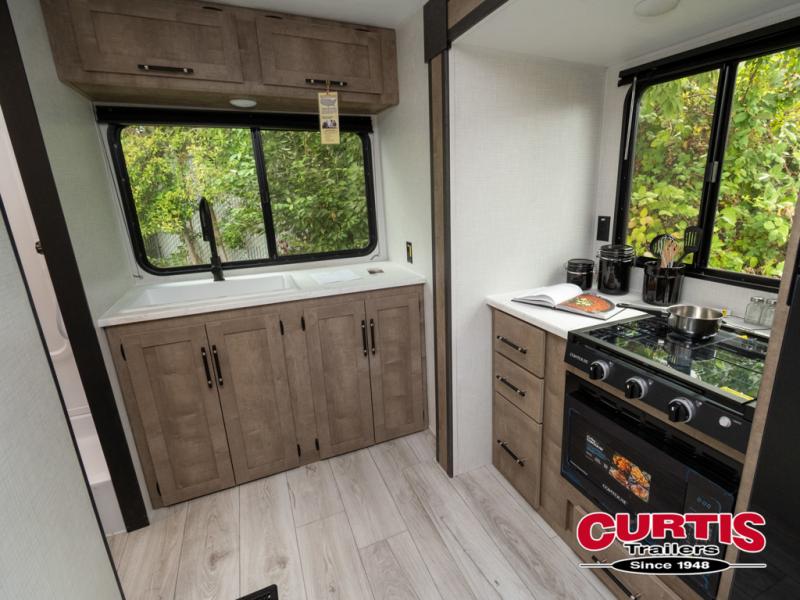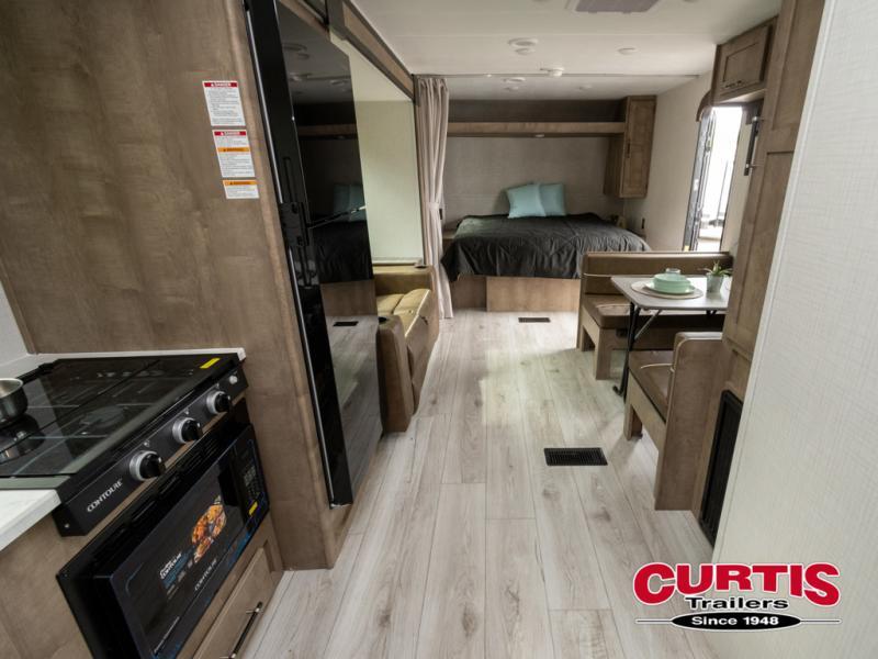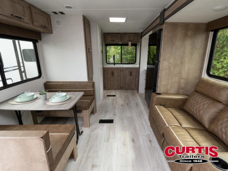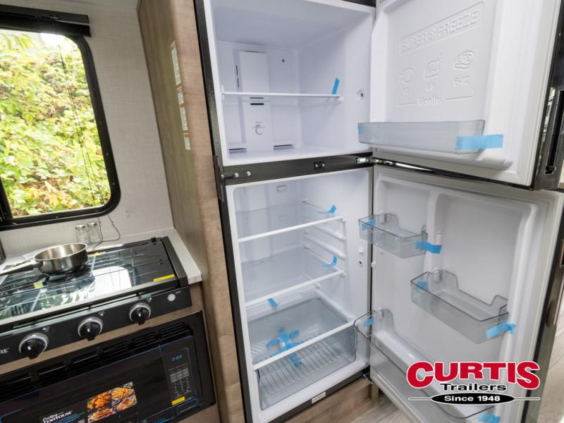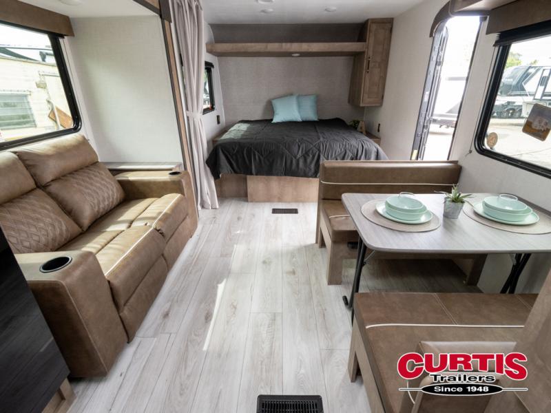 You'll love the added space in this travel trailer thanks to the large slide out. Here, you'll find the sofa with an end table, plus the 12V refrigerator and three burner gas range. There is kitchen counter space in the rear corner, and you'll find the full bath in the other rear corner for easy use. The front queen bed includes a privacy curtain for when you have guests staying over on the sofa and booth dinette, plus there are dual bedside closets and nightstands for your things!