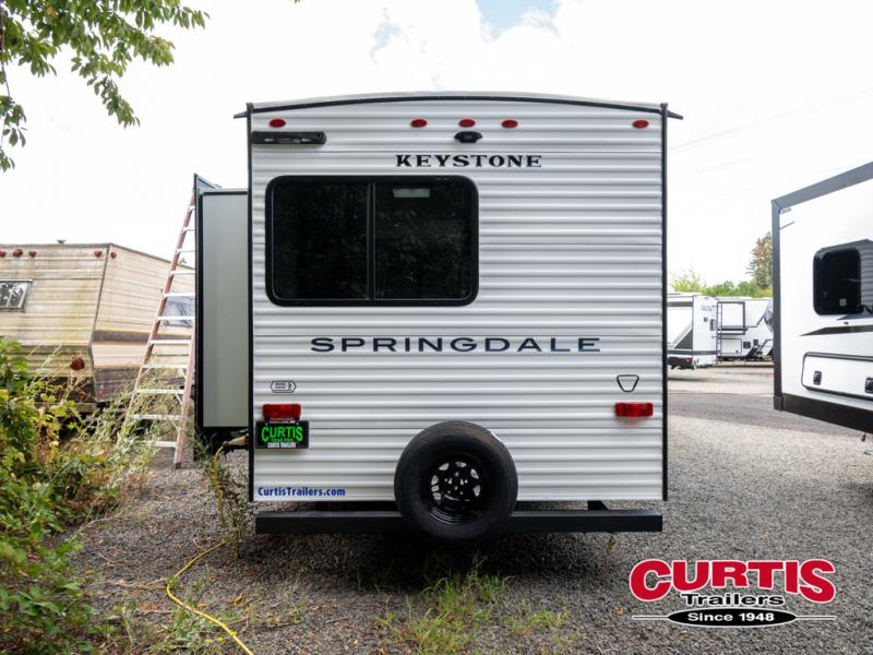 The Springdale Classic travel trailers by Keystone will provide you and your family many great outdoor experiences and it will also be kind to your pocketbook. Each one is constructed with a walkable roof and an I-beam frame with stamped steel cross-members and outriggers for added strength. There are also heavy duty stabilizer jacks and power tongue jacks outside, along with an XL entry assist handle for added convenience. Each travel trailer includes LED lighting, bedside outlets, and blackout night shades inside that will provide you with more privacy at night.