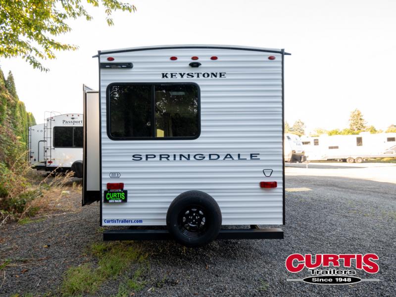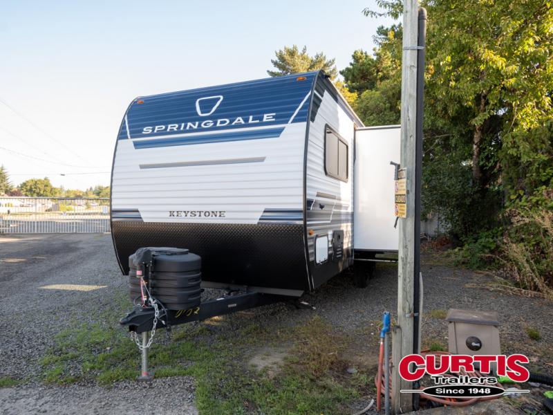 The Springdale Classic travel trailers by Keystone will provide you and your family many great outdoor experiences and it will also be kind to your pocketbook. Each one is constructed with a walkable roof and an I-beam frame with stamped steel cross-members and outriggers for added strength. There are also heavy duty stabilizer jacks and power tongue jacks outside, along with an XL entry assist handle for added convenience. Each travel trailer includes LED lighting, bedside outlets, and blackout night shades inside that will provide you with more privacy at night.