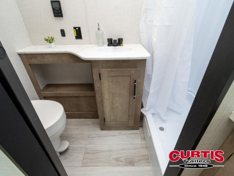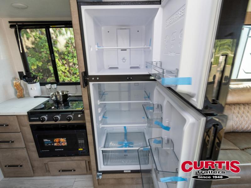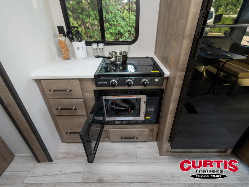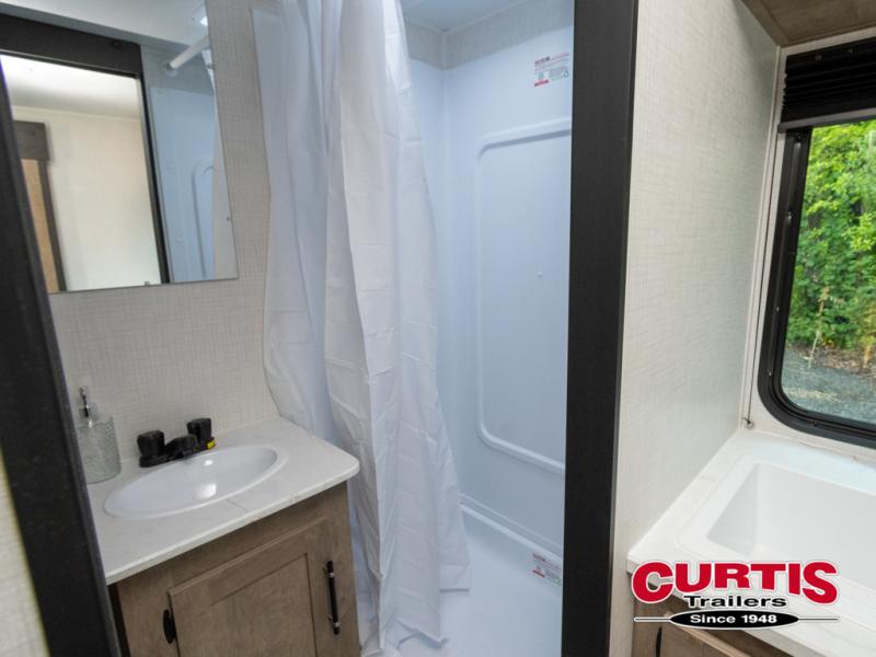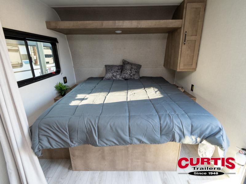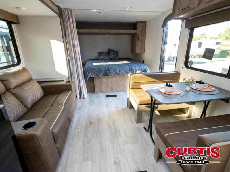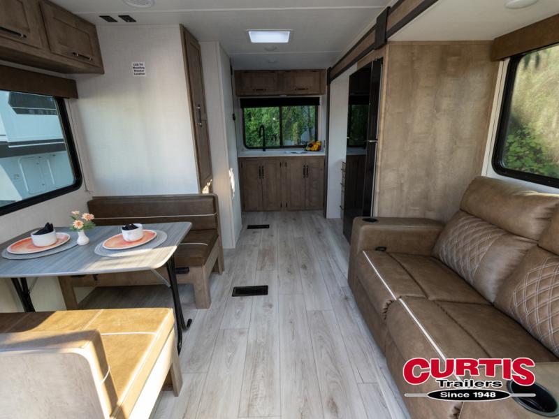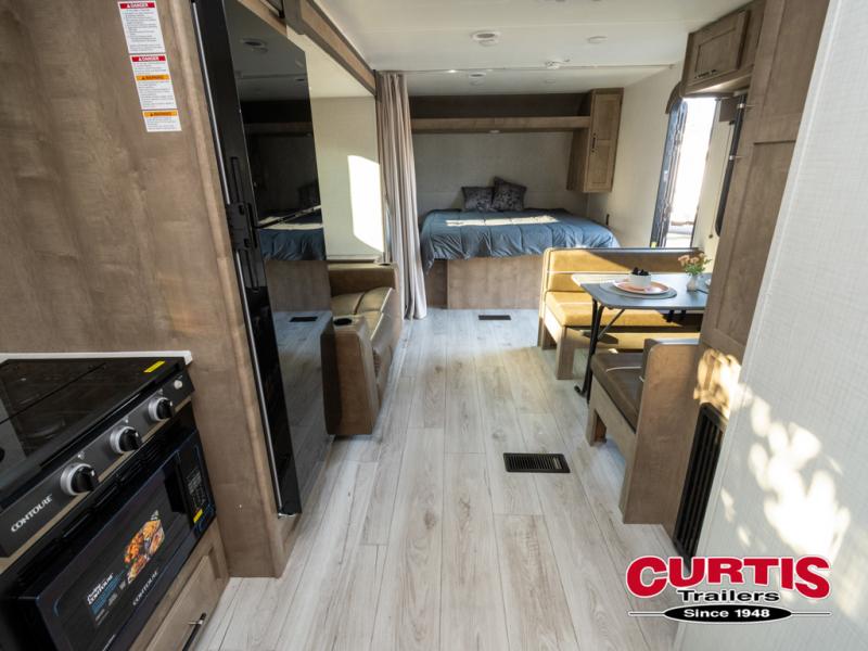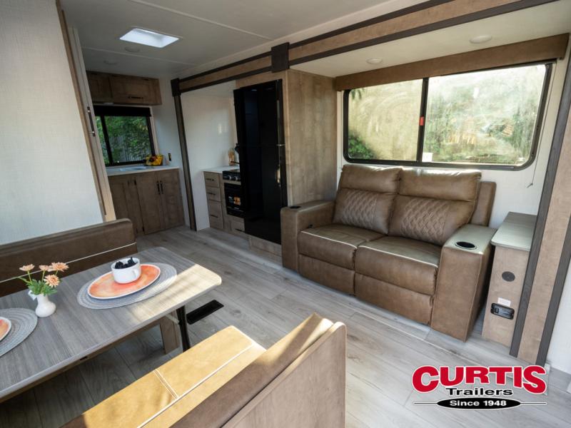 You'll love the added space in this travel trailer thanks to the large slide out. Here, you'll find the sofa with an end table, plus the 12V refrigerator and three burner gas range. There is kitchen counter space in the rear corner, and you'll find the full bath in the other rear corner for easy use. The front queen bed includes a privacy curtain for when you have guests staying over on the sofa and booth dinette, plus there are dual bedside closets and nightstands for your things!