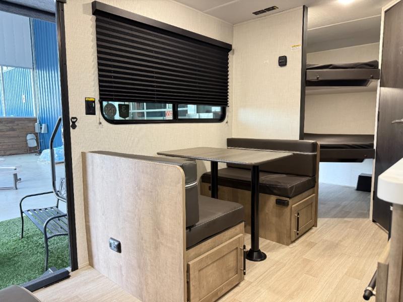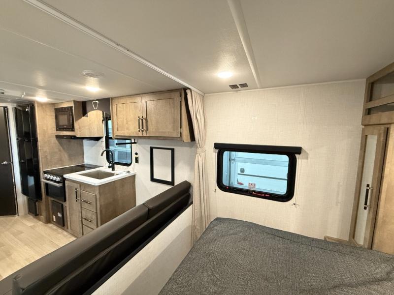 Plan fun trips at the campground in this travel trailer with double-size bunks for your guests or little ones, plus a front bedroom with a walk-around Olympic RV queen bed! The dual bedside wardrobes and overhead shelf will keep your personal belongings organized, and the exterior pass-through will be perfect for fishing poles and camp gear. A full kitchen includes a three-burner cooktop and an air fryer microwave to cook your best meals, and a booth dinette provides a place to dine at. There is also a sofa with an end table where you can enjoy your morning coffee at.