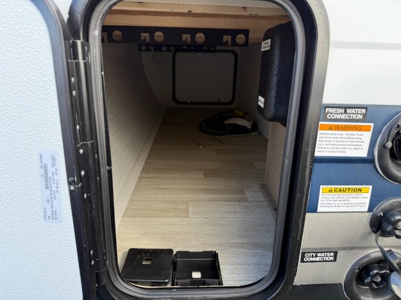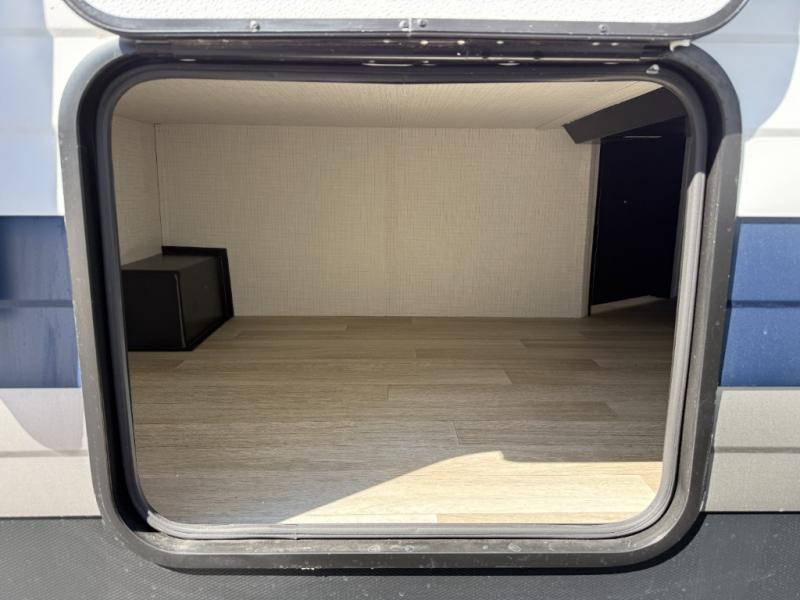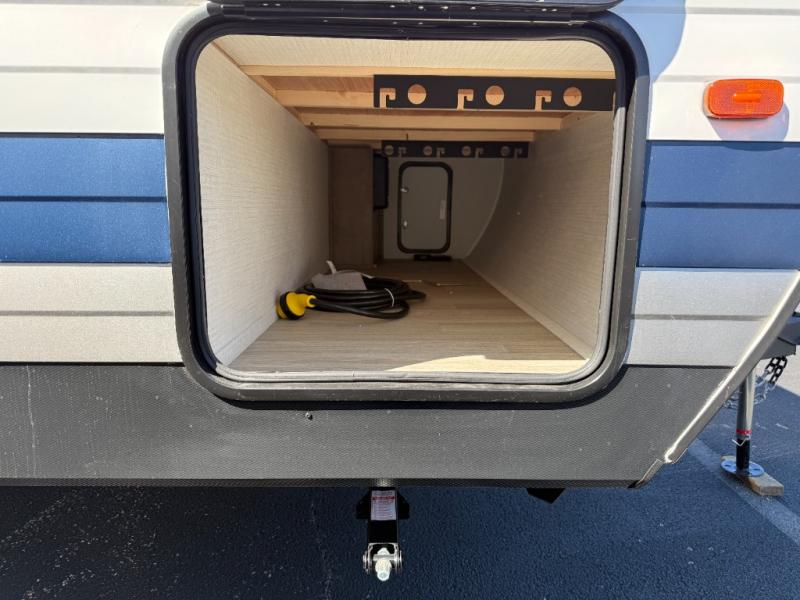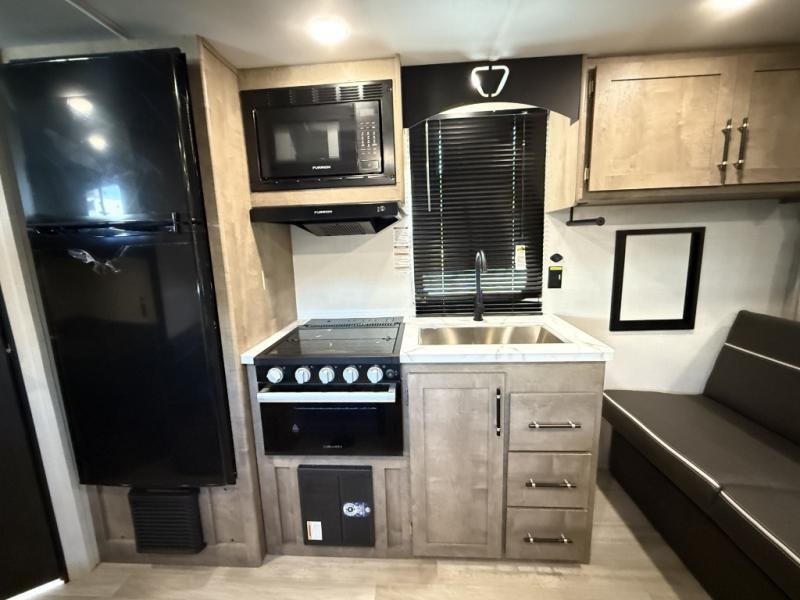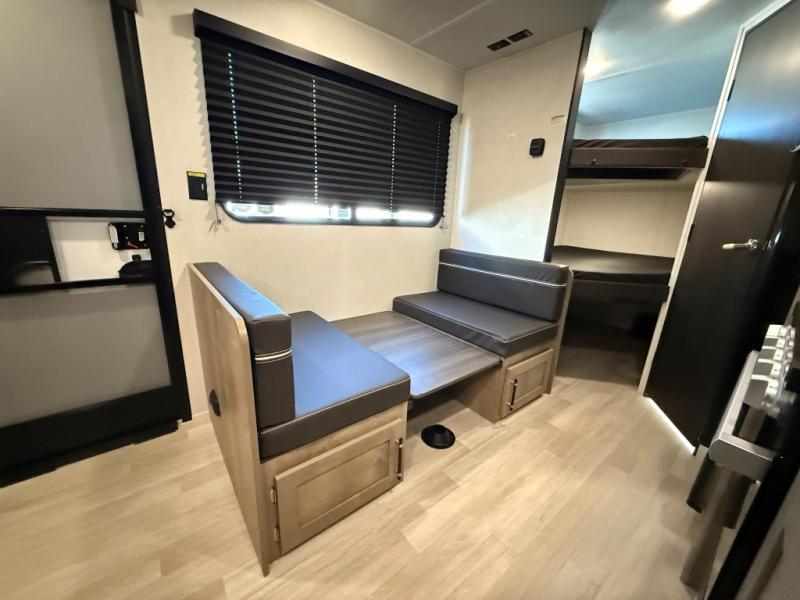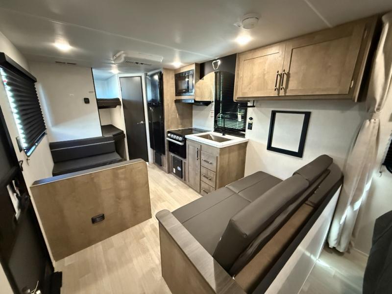 Plan fun trips at the campground in this travel trailer with double-size bunks for your guests or little ones, plus a front bedroom with a walk-around Olympic RV queen bed! The dual bedside wardrobes and overhead shelf will keep your personal belongings organized, and the exterior pass-through will be perfect for fishing poles and camp gear. A full kitchen includes a three-burner cooktop and an air fryer microwave to cook your best meals, and a booth dinette provides a place to dine at. There is also a sofa with an end table where you can enjoy your morning coffee at.