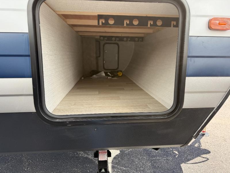 Plan fun trips at the campground in this travel trailer with double-size bunks for your guests or little ones, plus a front bedroom with a walk-around Olympic RV queen bed! The dual bedside wardrobes and overhead shelf will keep your personal belongings organized, and the exterior pass-through will be perfect for fishing poles and camp gear. A full kitchen includes a three-burner cooktop and an air fryer microwave to cook your best meals, and a booth dinette provides a place to dine at. There is also a sofa with an end table where you can enjoy your morning coffee at.