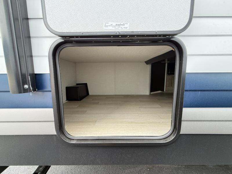 Plan fun trips at the campground in this travel trailer with double-size bunks for your guests or little ones, plus a front bedroom with a walk-around Olympic RV queen bed! The dual bedside wardrobes and overhead shelf will keep your personal belongings organized, and the exterior pass-through will be perfect for fishing poles and camp gear. A full kitchen includes a three-burner cooktop and an air fryer microwave to cook your best meals, and a booth dinette provides a place to dine at. There is also a sofa with an end table where you can enjoy your morning coffee at.