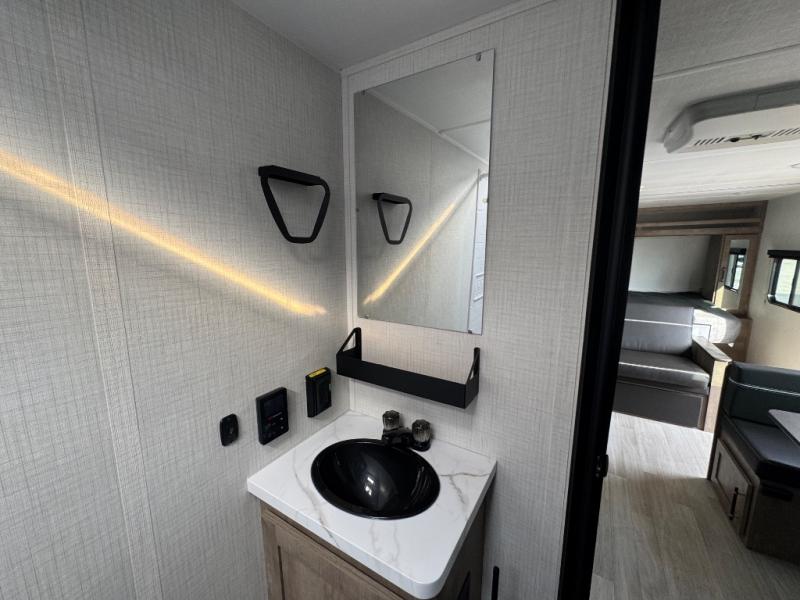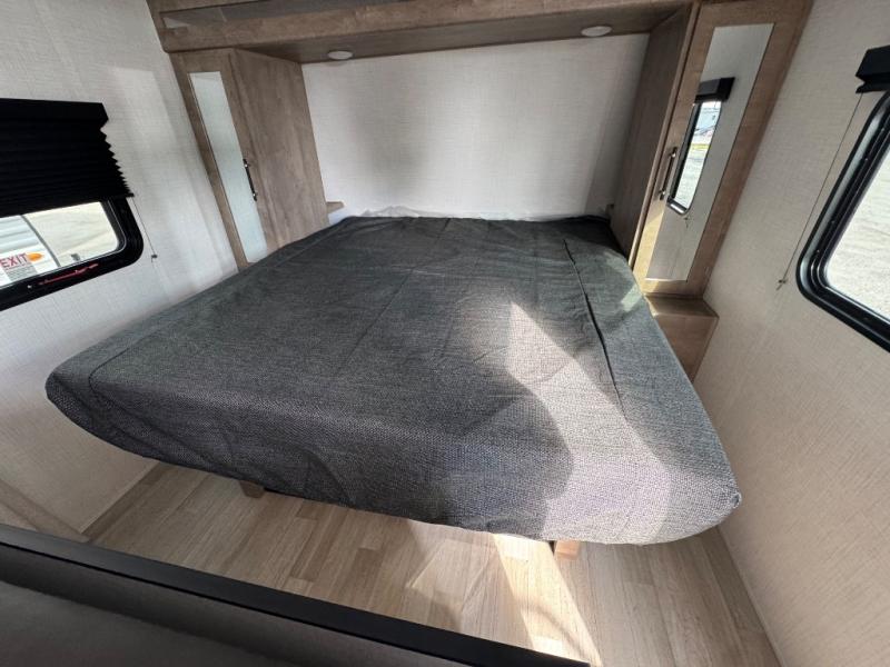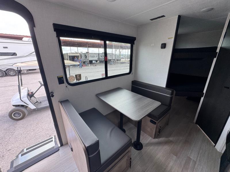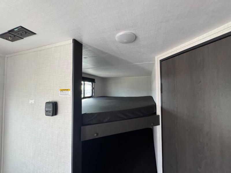 Plan fun trips at the campground in this travel trailer with double-size bunks for your guests or little ones, plus a front bedroom with a walk-around Olympic RV queen bed! The dual bedside wardrobes and overhead shelf will keep your personal belongings organized, and the exterior pass-through will be perfect for fishing poles and camp gear. A full kitchen includes a three-burner cooktop and an air fryer microwave to cook your best meals, and a booth dinette provides a place to dine at. There is also a sofa with an end table where you can enjoy your morning coffee at.