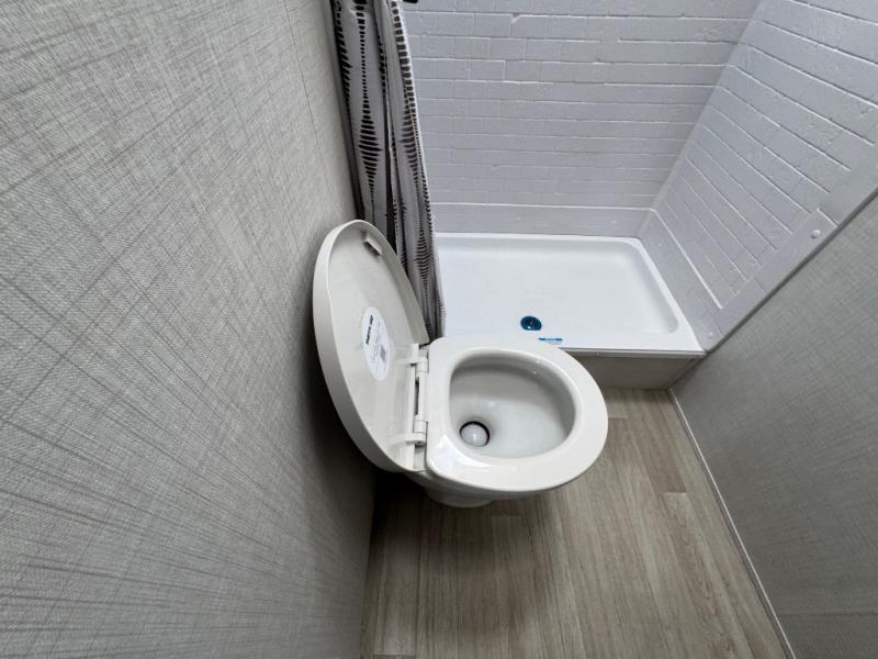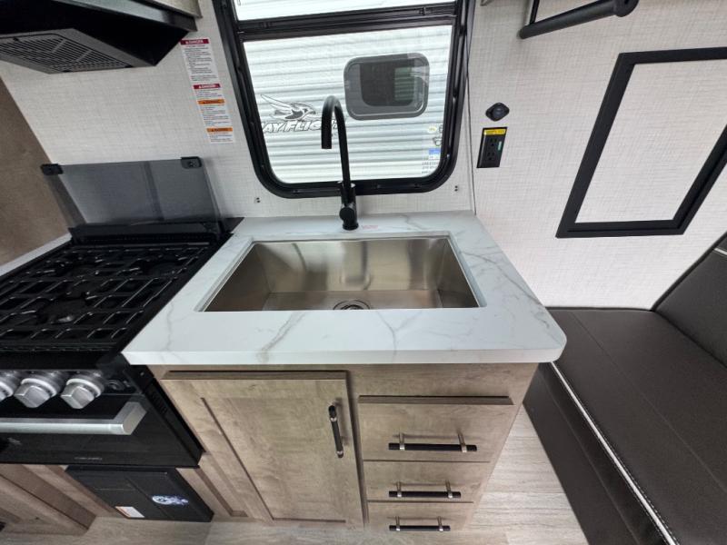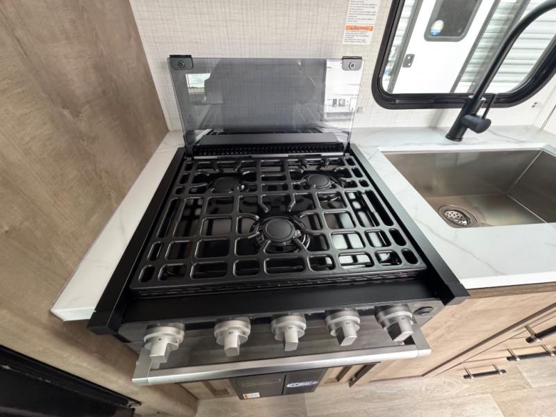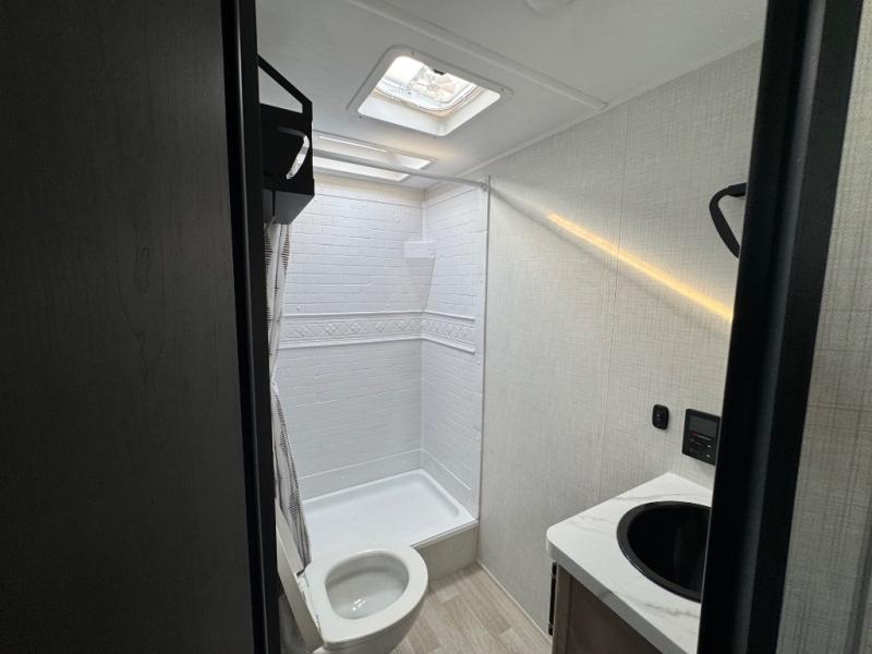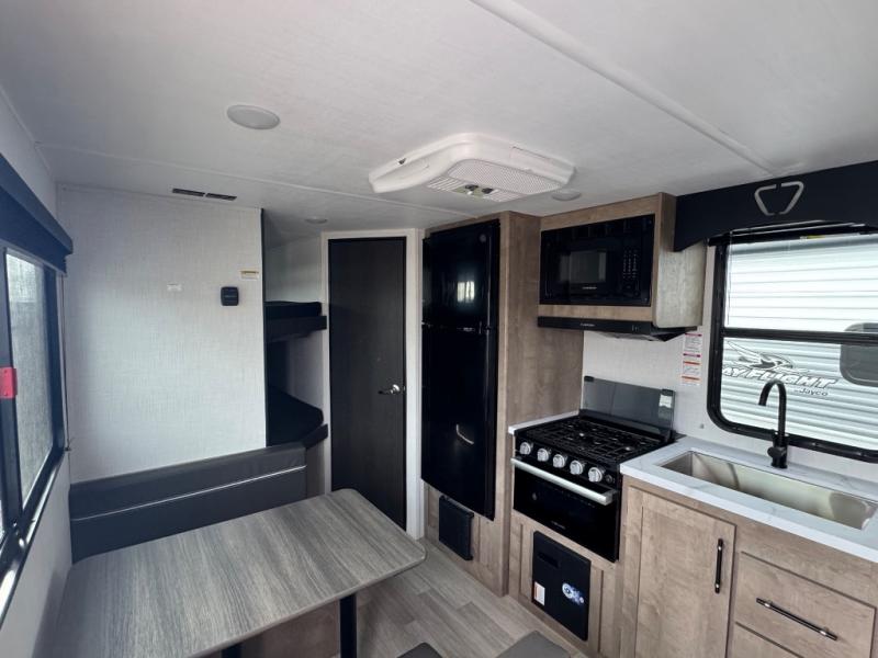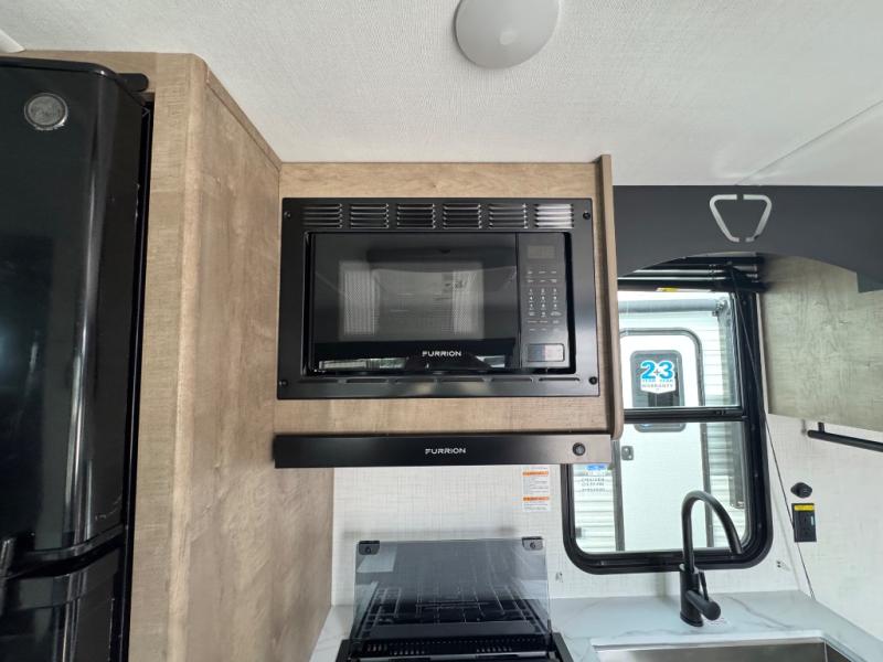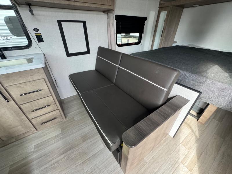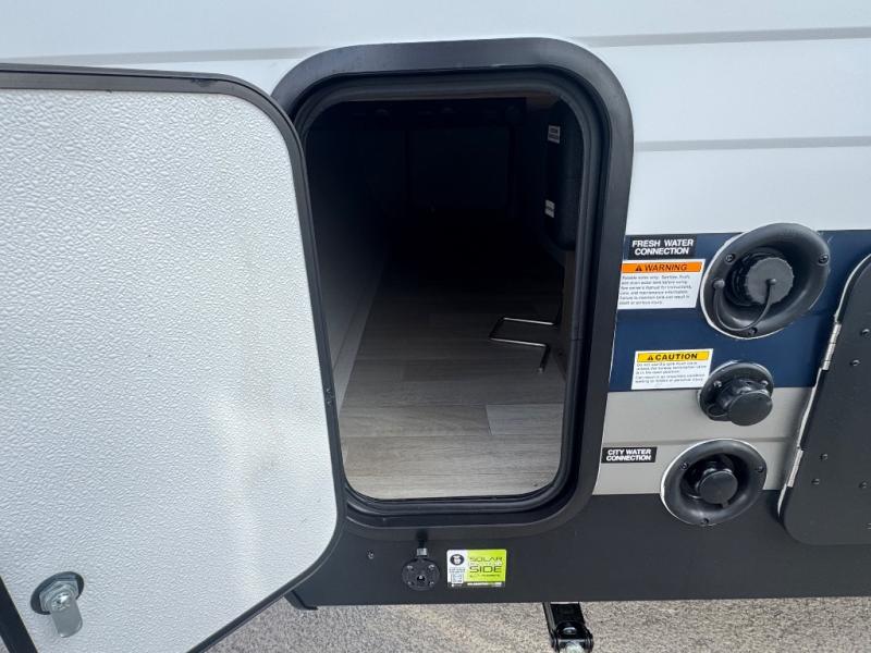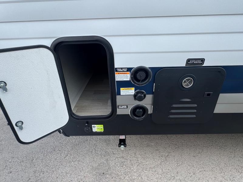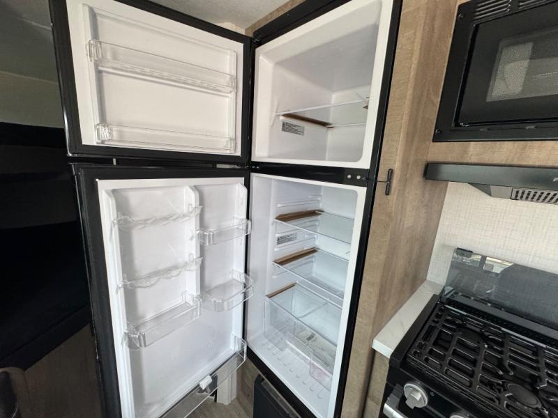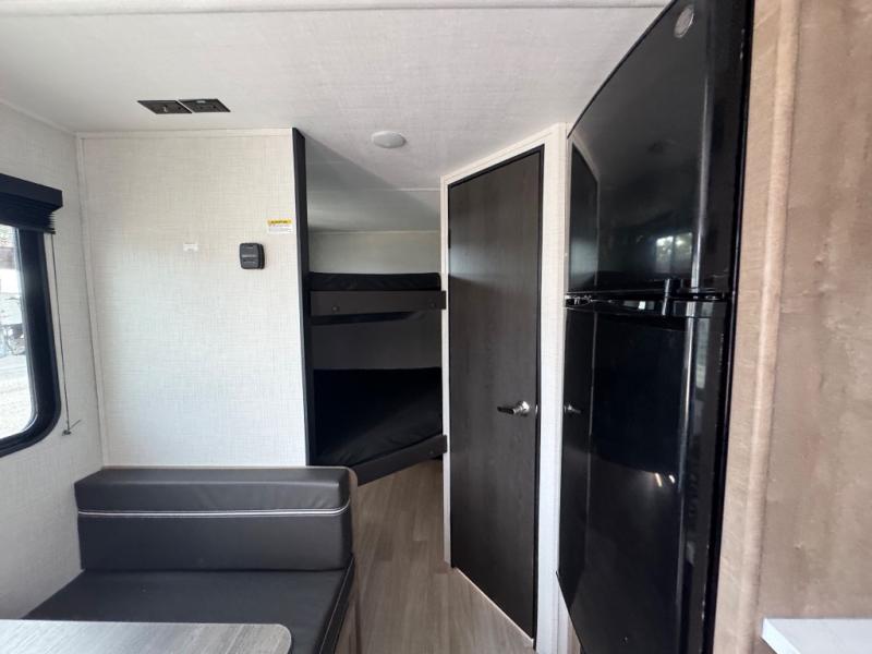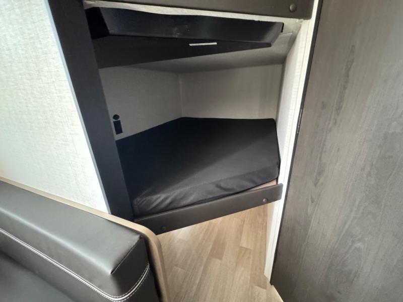 Plan fun trips at the campground in this travel trailer with double-size bunks for your guests or little ones, plus a front bedroom with a walk-around Olympic RV queen bed! The dual bedside wardrobes and overhead shelf will keep your personal belongings organized, and the exterior pass-through will be perfect for fishing poles and camp gear. A full kitchen includes a three-burner cooktop and an air fryer microwave to cook your best meals, and a booth dinette provides a place to dine at. There is also a sofa with an end table where you can enjoy your morning coffee at.