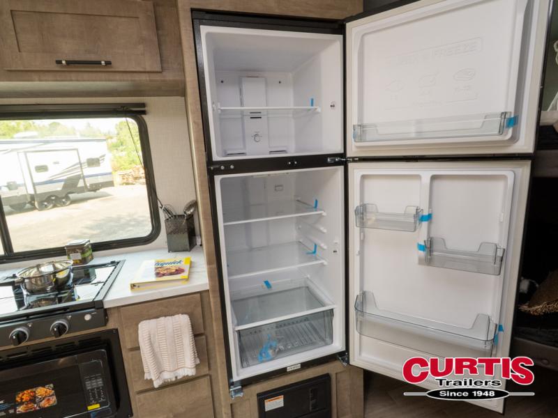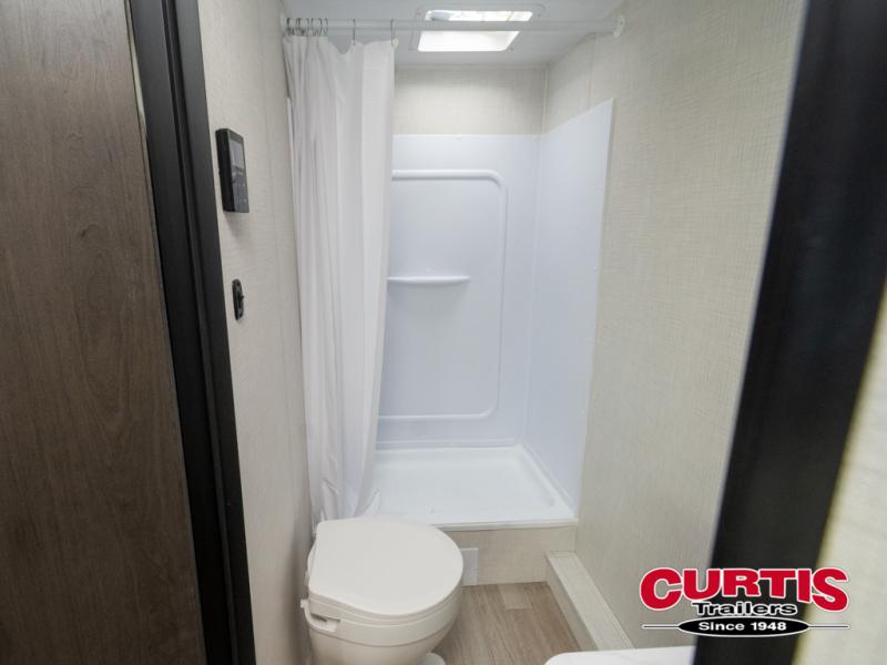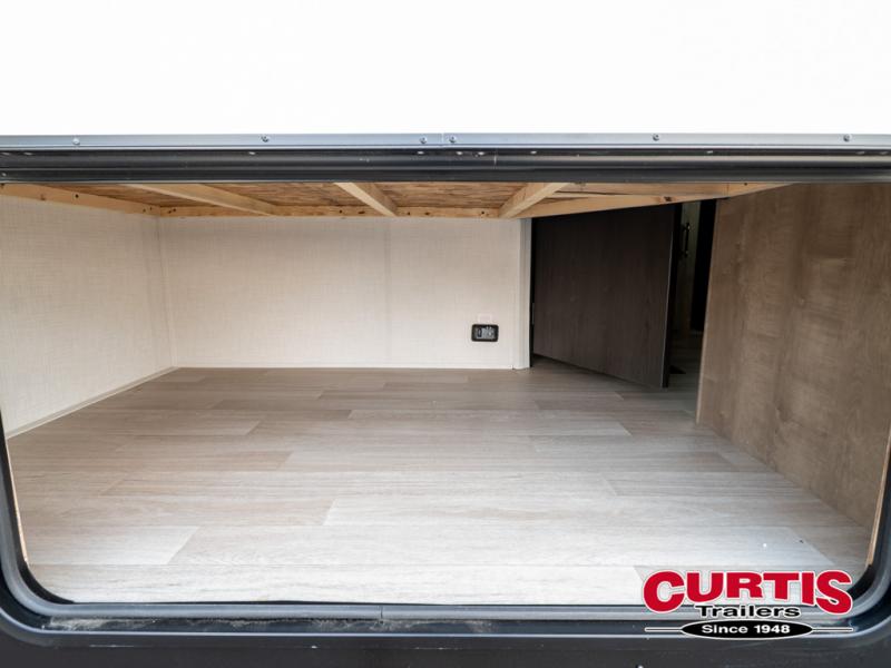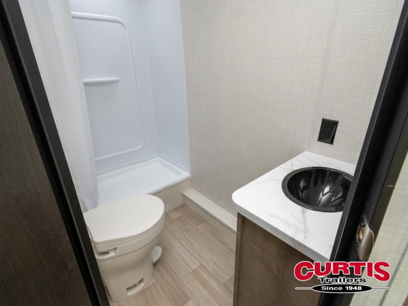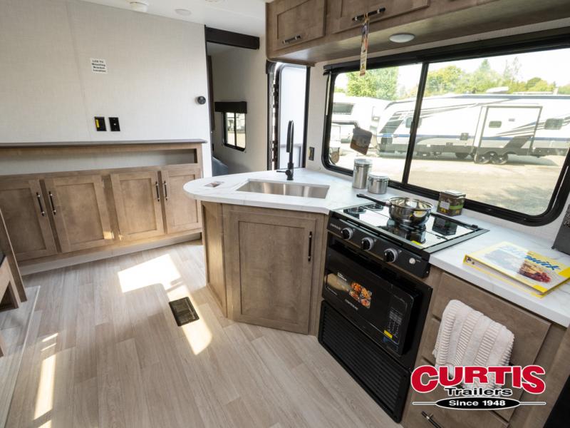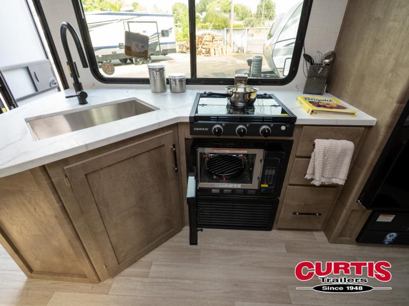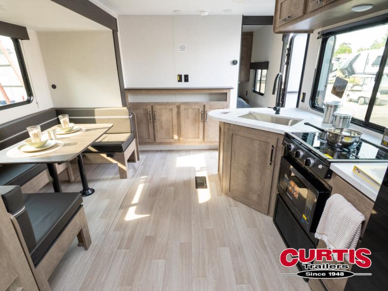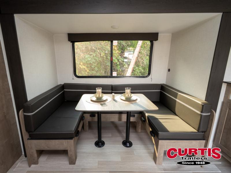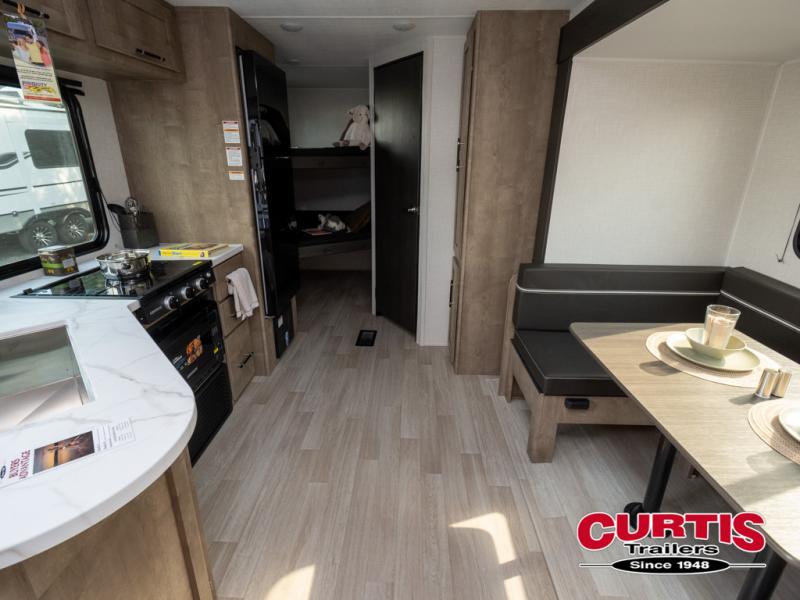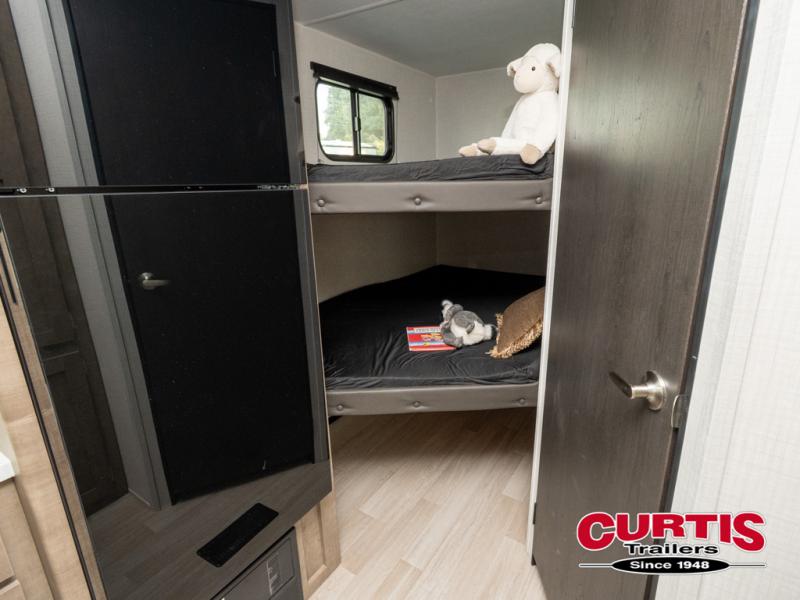 This bunkhouse travel trailer has room for your whole crowd! Enjoy the rear bunks or flip up the bottom one for more space. The front bedroom has a sliding door for privacy, plus dual closets and night stands. The kitchen features a three-burner range and 10 cu. ft. 12V refrigerator. Everyone will gather at the U-shape dinette. An entertainment center is standard and prepped for a TV. There is a front pass-through for housing all of your outdoor gear, as well as additional protection from the elements.