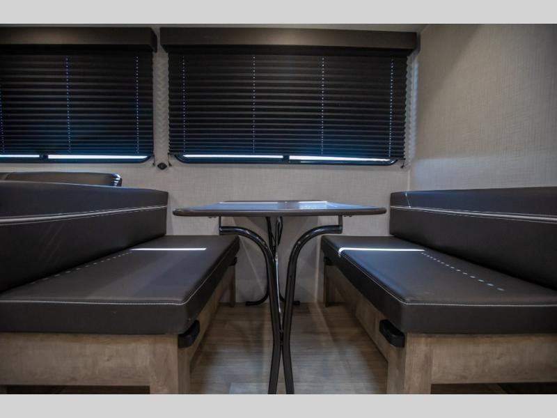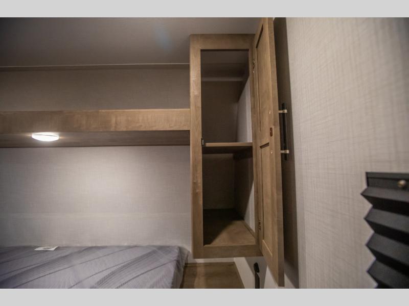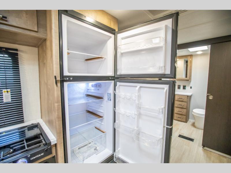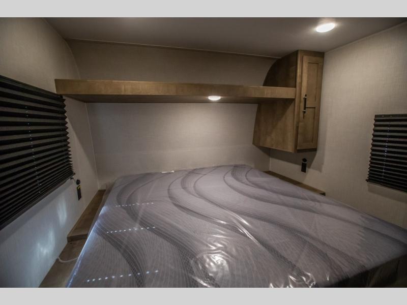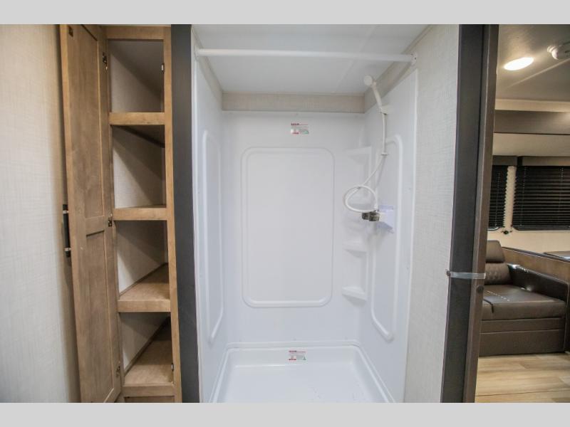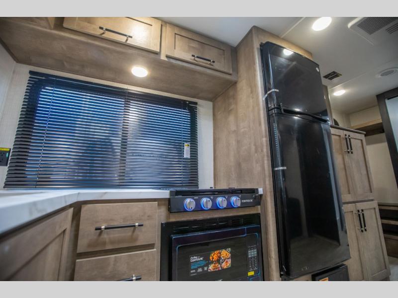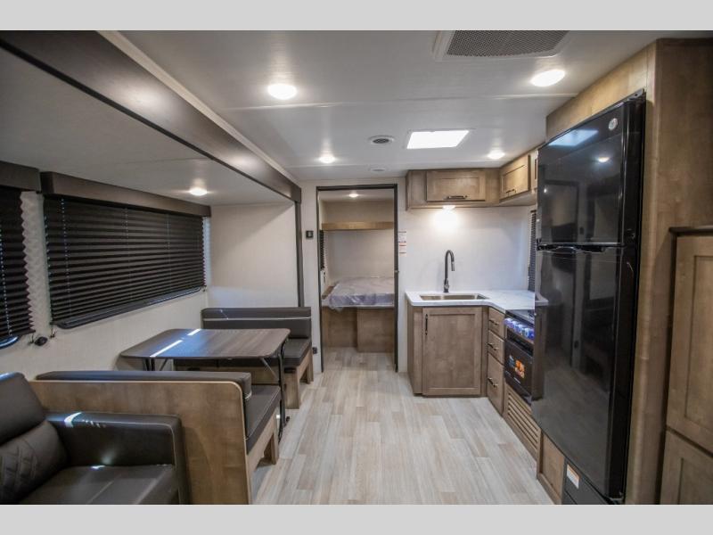 You'll feel right at home wherever you decide to camp in this travel trailer. The large slide out in the combined kitchen and living area gives your crew plenty of space to move about, plus there is a booth dinette and sofa for comfy seating and sleeping spaces. A full kitchen, compete with three burner cooktop and 10 cu. ft. 12V refrigerator will let you cook and store food for the whole week. Head to the full rear bath that includes a spacious vanity, a shower, toilet, and linen closet for clean towels. And when you're ready to catch some zzz's, the queen bed in the front private bedroom is sure to bring comfort!