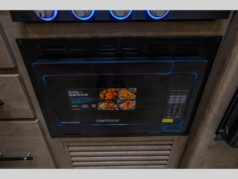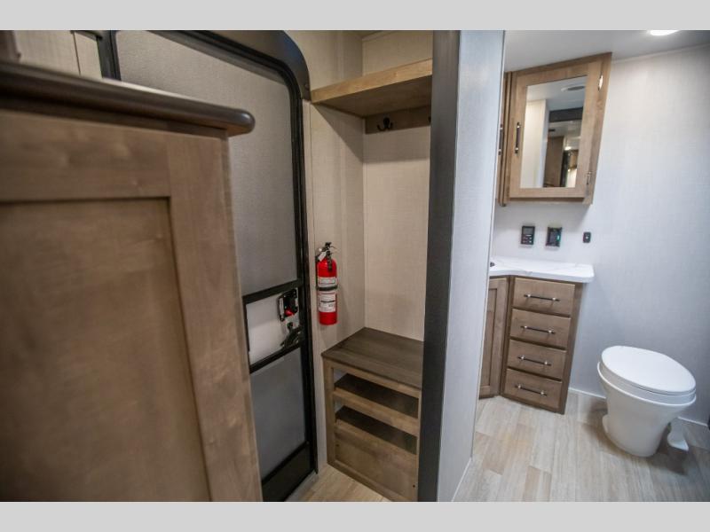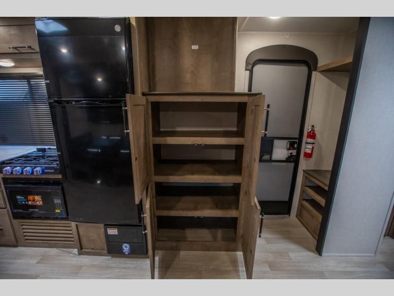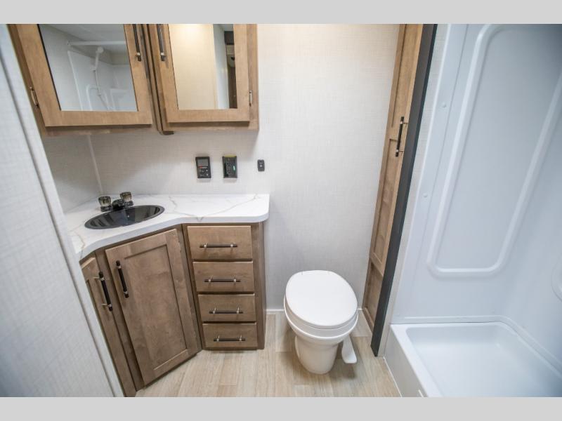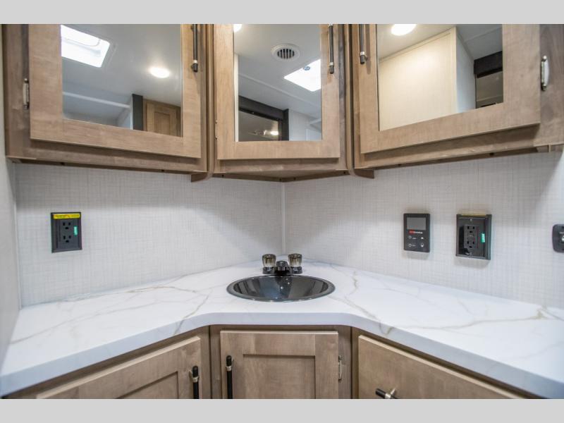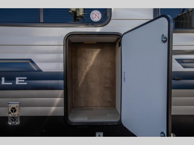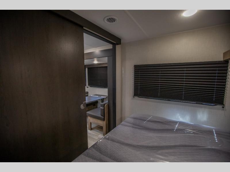 You'll feel right at home wherever you decide to camp in this travel trailer. The large slide out in the combined kitchen and living area gives your crew plenty of space to move about, plus there is a booth dinette and sofa for comfy seating and sleeping spaces. A full kitchen, compete with three burner cooktop and 10 cu. ft. 12V refrigerator will let you cook and store food for the whole week. Head to the full rear bath that includes a spacious vanity, a shower, toilet, and linen closet for clean towels. And when you're ready to catch some zzz's, the queen bed in the front private bedroom is sure to bring comfort!