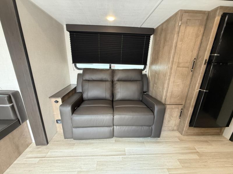 Trips to the lake just got easier in this dual entry travel trailer. You can enter in through the rear living area or the front master bedroom, and a queen bed will be calling your name after a tiring day. Don't forget to clean up in the walk-through bath before heading to bed! The chef of your group can make breakfast on the three burner gas cooktop, while the others set plates around the rear U-shaped dinette. There is also a sofa slide out for additional seating spaces, and both of these pieces of furniture will double as your guests' sleeping space at night. After breakfast is cleaned up, grab your fishing poles from the exterior pass-thru storage and head down to the water!