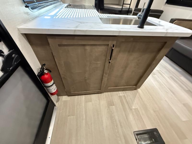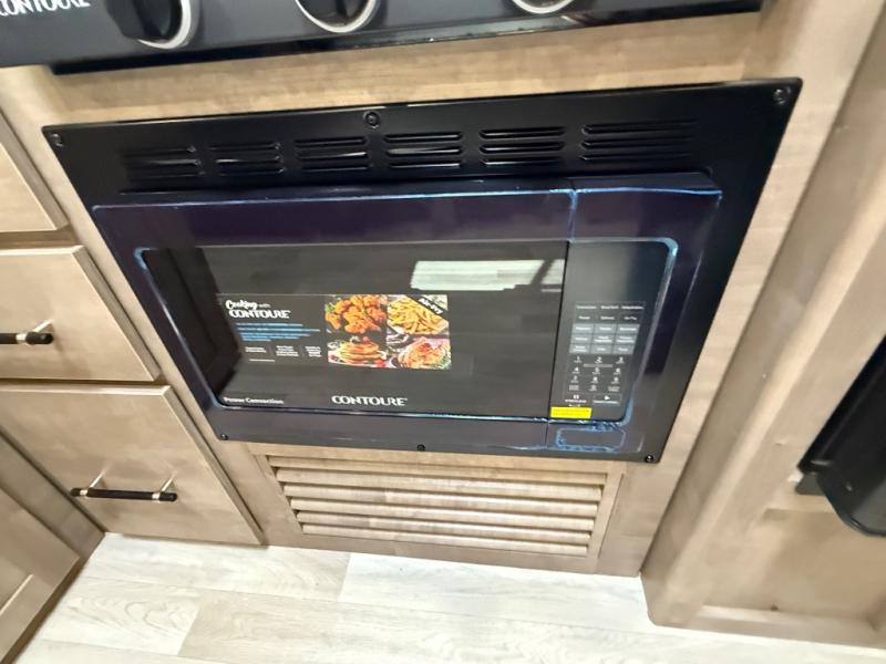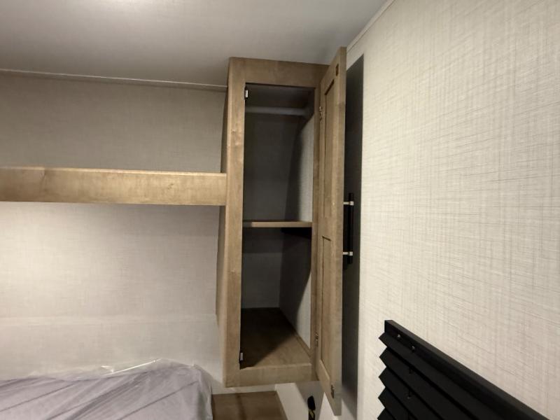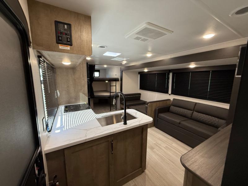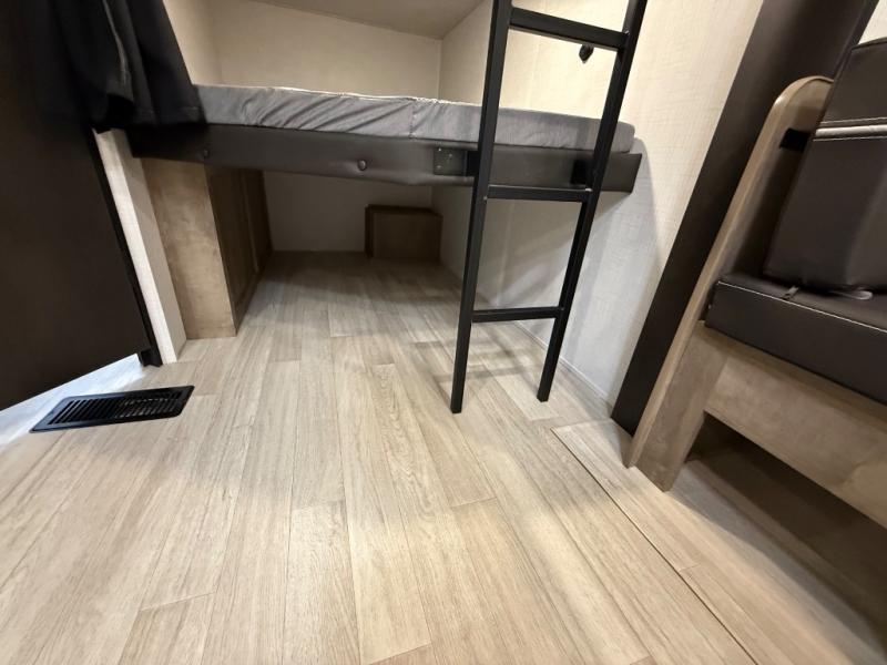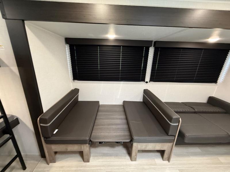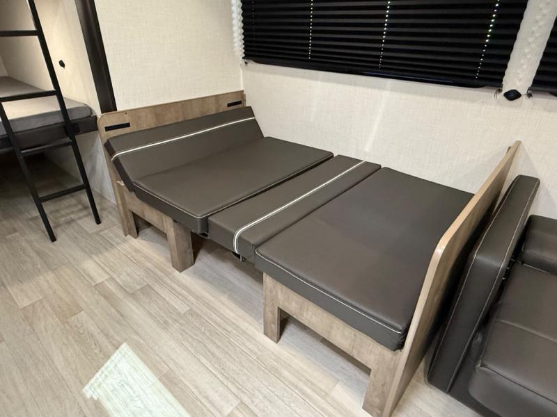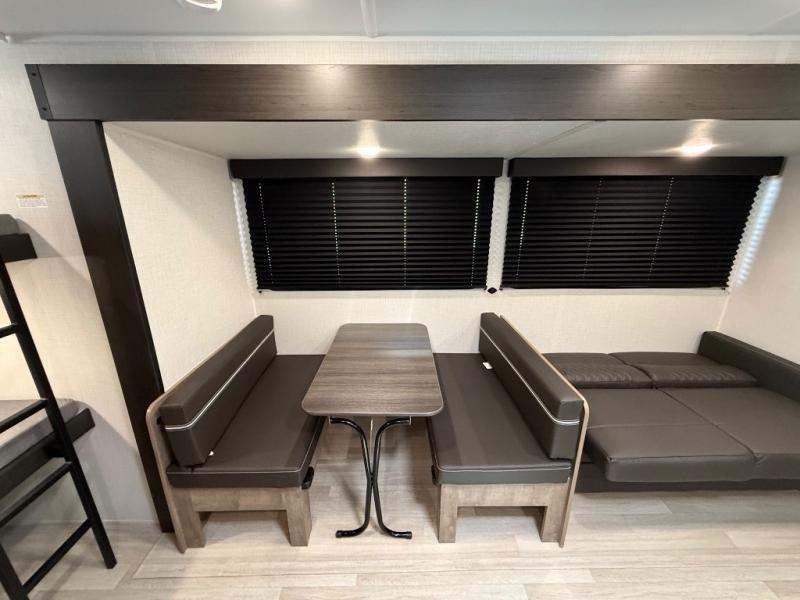You'll have additional space to stretch out in this travel trailer for eight to ten! Within the slide you'll find the booth dinette and sofa that will be perfect for meal times, relaxing, and sleeping more guests, and there is an entertainment with TV prep for movie nights. The little ones will love the double-size bunks, and the full bath is close by for easy nighttime use. You'll have the front private bedroom with a queen bed all to yourselves, plus there are dual closets and nightstands for your things. This model also includes an exterior pass-through storage outside and a 16' power awning for protection against the sun!