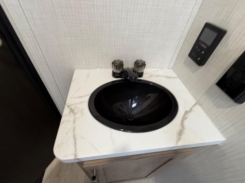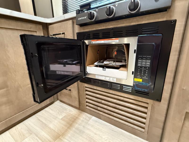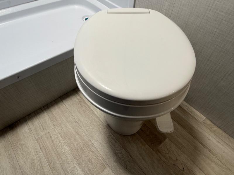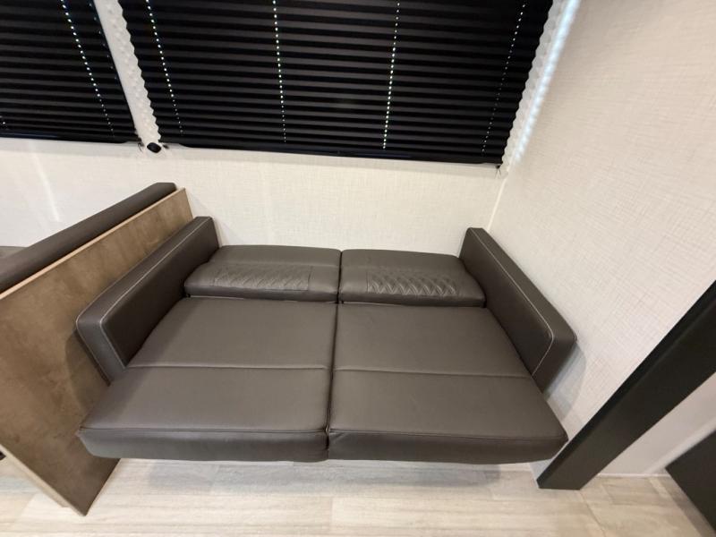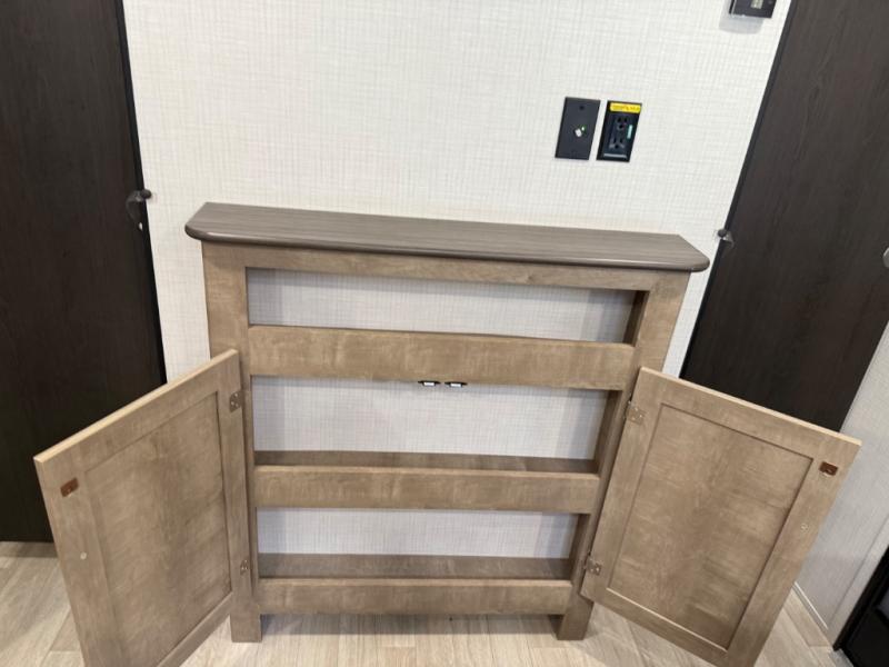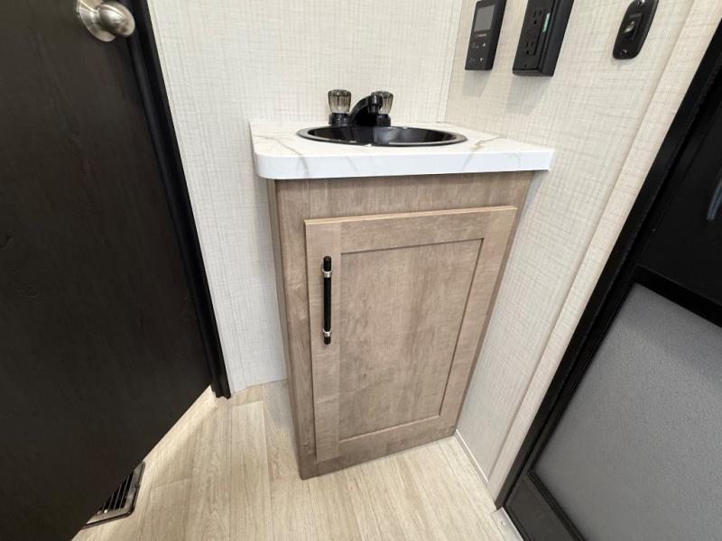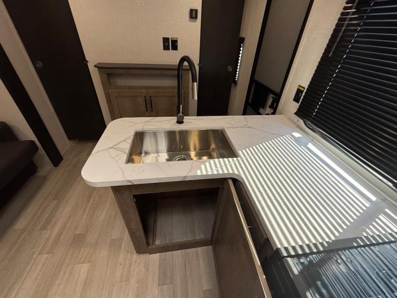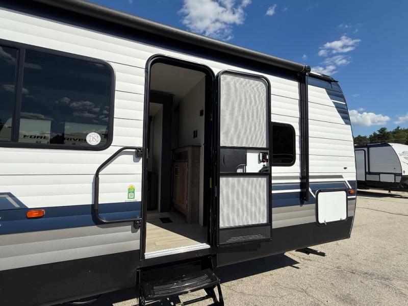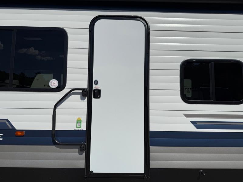 You'll have additional space to stretch out in this travel trailer for eight to ten! Within the slide you'll find the booth dinette and sofa that will be perfect for meal times, relaxing, and sleeping more guests, and there is an entertainment with TV prep for movie nights. The little ones will love the double-size bunks, and the full bath is close by for easy nighttime use. You'll have the front private bedroom with a queen bed all to yourselves, plus there are dual closets and nightstands for your things. This model also includes an exterior pass-through storage outside and a 16' power awning for protection against the sun!