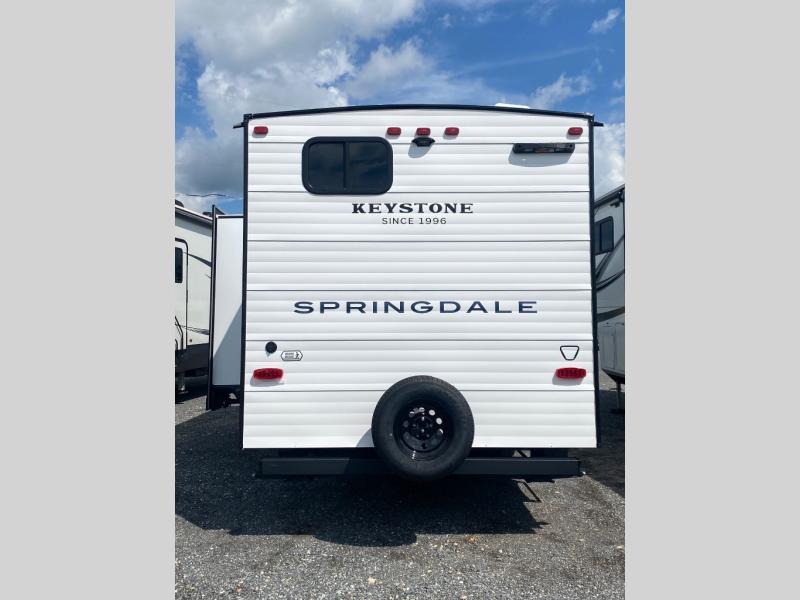 The Springdale Classic travel trailers by Keystone will provide you and your family many great outdoor experiences and it will also be kind to your pocketbook. Each one is constructed with an aluminum exterior, a walkable roof, and an I-beam frame with stamped steel cross-members and outriggers for added strength. There are also heavy duty stabilizer jacks and power tongue jacks outside, along with an XL entry assist handle for added convenience. Each travel trailer includes LED lighting, bedside outlets, and blackout night shades inside that will provide you with more privacy at night.