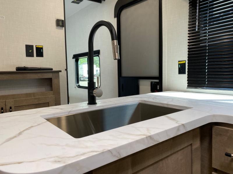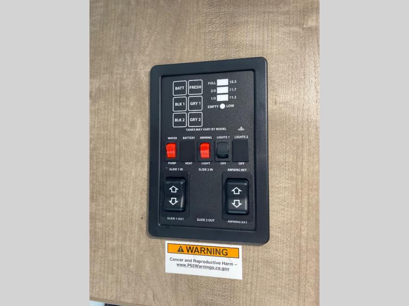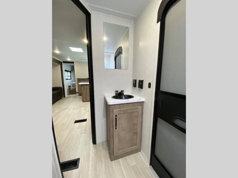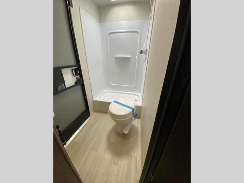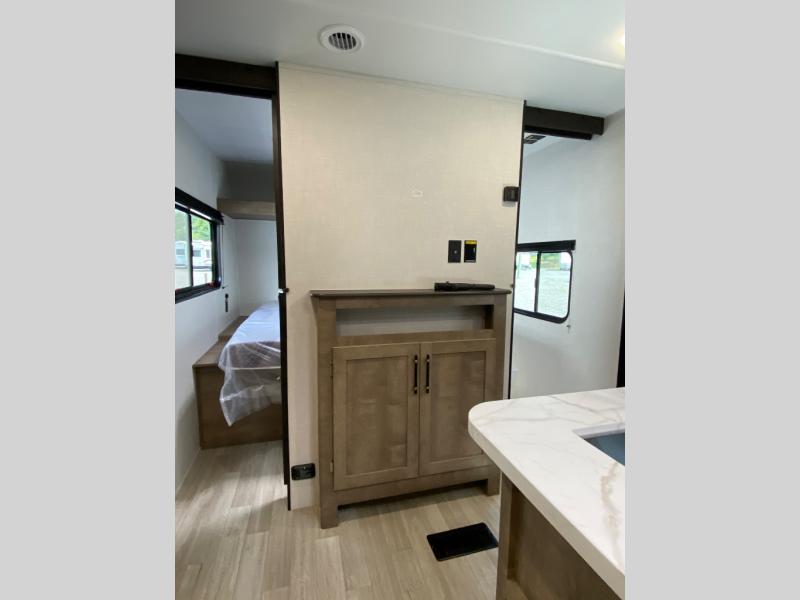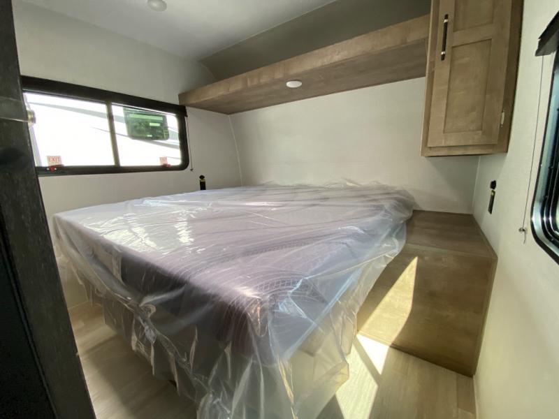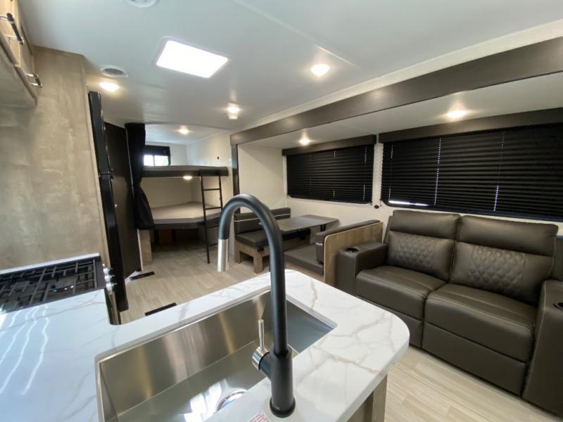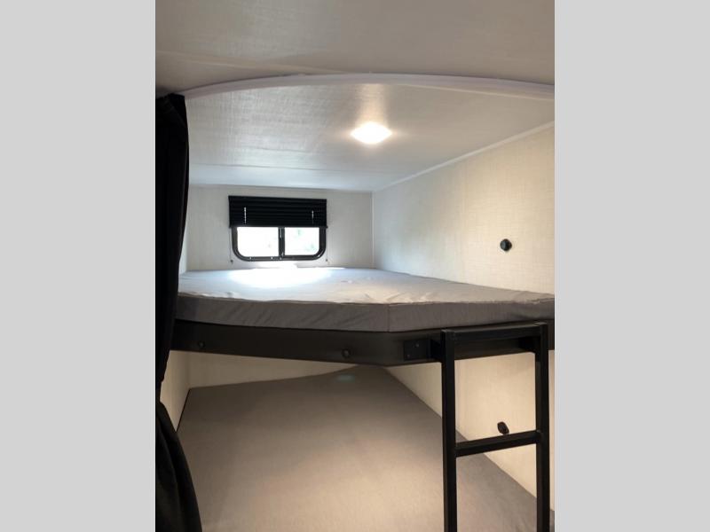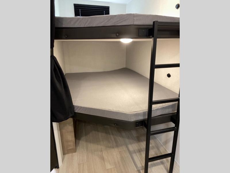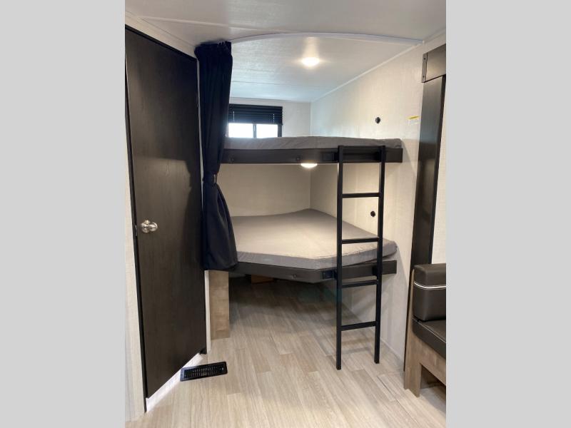You'll have additional space to stretch out in this travel trailer for eight to ten! Within the slide you'll find the booth dinette and sofa that will be perfect for meal times, relaxing, and sleeping more guests, and there is an entertainment with TV prep for movie nights. The little ones will love the double-size bunks, and the full bath is close by for easy nighttime use. You'll have the front private bedroom with a queen bed all to yourselves, plus there are dual closets and nightstands for your things. This model also includes an exterior pass-through storage outside and a 16' power awning for protection against the sun!