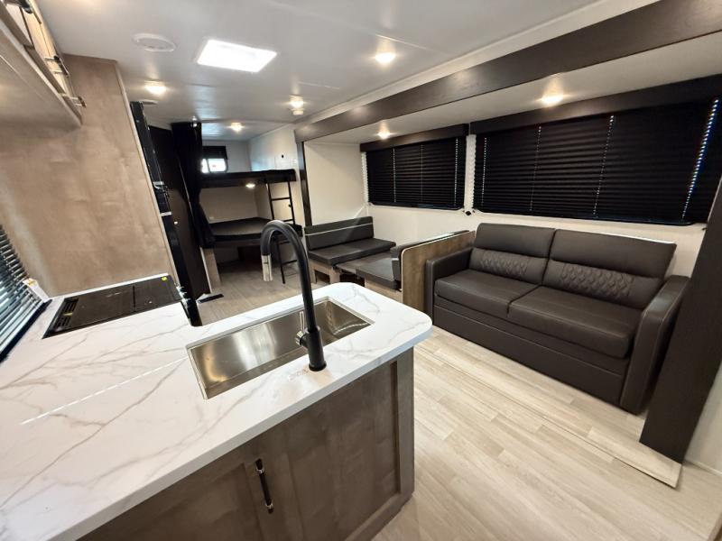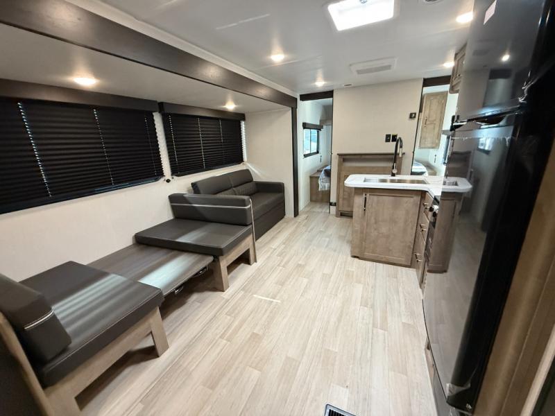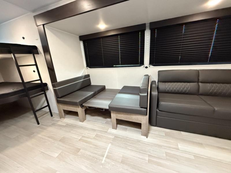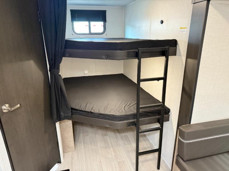 You'll have additional space to stretch out in this travel trailer for eight to ten! Within the slide you'll find the booth dinette and sofa that will be perfect for meal times, relaxing, and sleeping more guests, and there is an entertainment with TV prep for movie nights. The little ones will love the double-size bunks, and the full bath is close by for easy nighttime use. You'll have the front private bedroom with a queen bed all to yourselves, plus there are dual closets and nightstands for your things. This model also includes an exterior pass-through storage outside and a 16' power awning for protection against the sun!