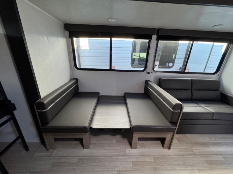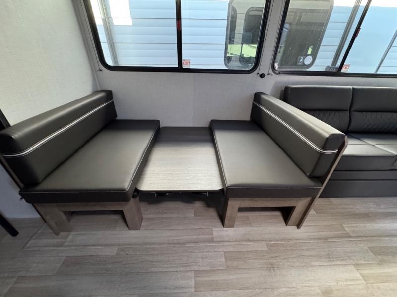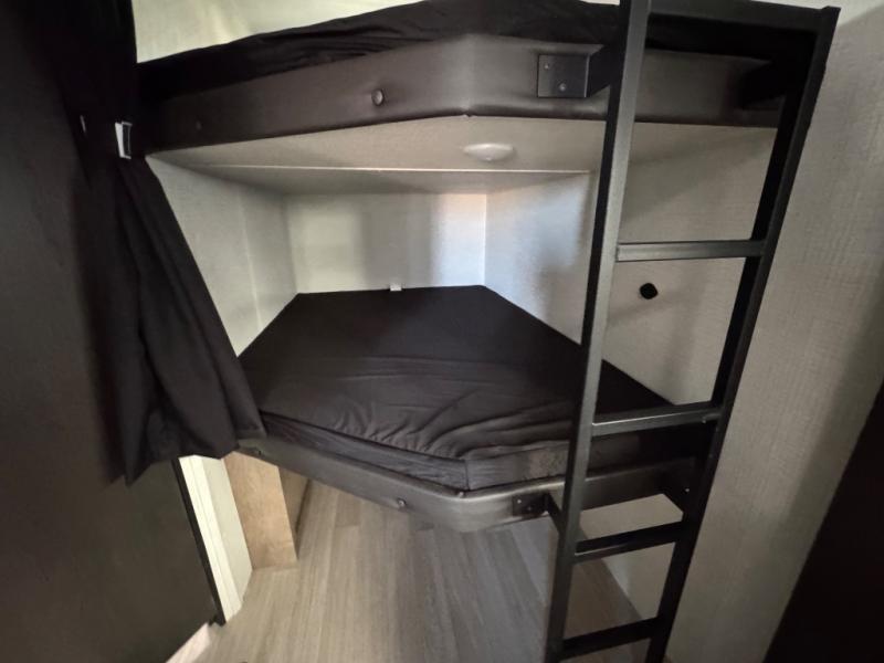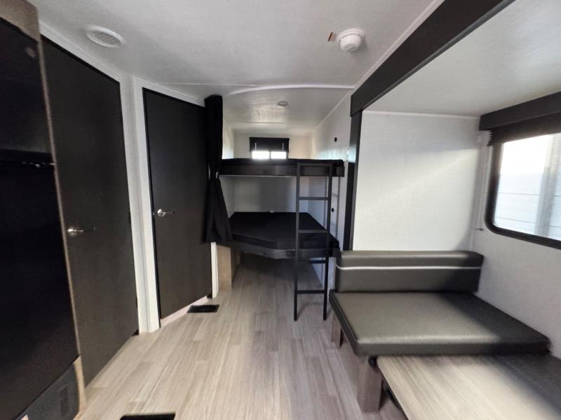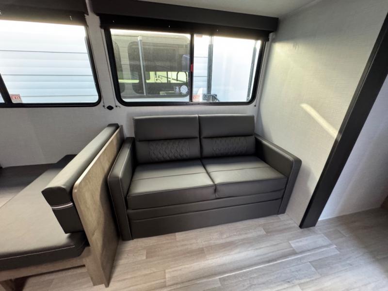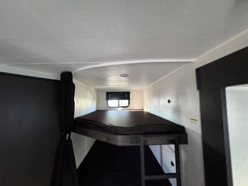 You'll have additional space to stretch out in this travel trailer for eight to ten! Within the slide you'll find the booth dinette and sofa that will be perfect for meal times, relaxing, and sleeping more guests, and there is an entertainment with TV prep for movie nights. The little ones will love the double-size bunks, and the full bath is close by for easy nighttime use. You'll have the front private bedroom with a queen bed all to yourselves, plus there are dual closets and nightstands for your things. This model also includes an exterior pass-through storage outside and a 16' power awning for protection against the sun!