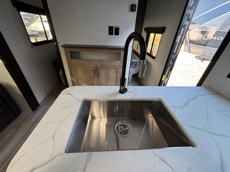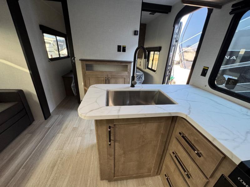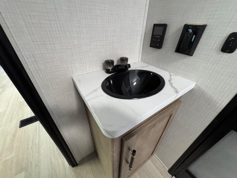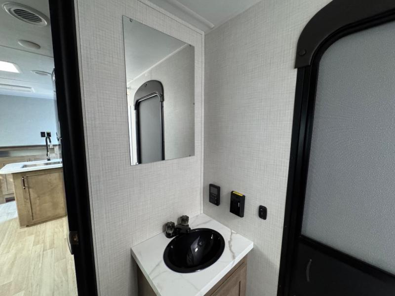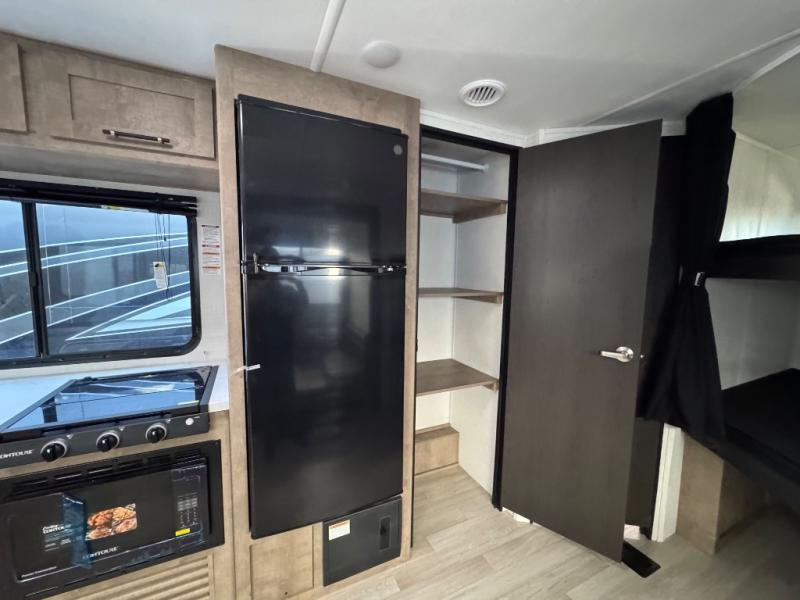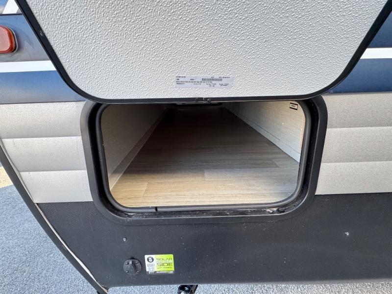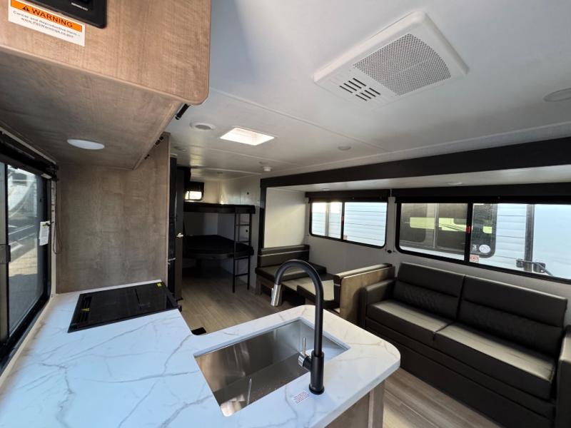 You'll have additional space to stretch out in this travel trailer for eight to ten! Within the slide you'll find the booth dinette and sofa that will be perfect for meal times, relaxing, and sleeping more guests, and there is an entertainment with TV prep for movie nights. The little ones will love the double-size bunks, and the full bath is close by for easy nighttime use. You'll have the front private bedroom with a queen bed all to yourselves, plus there are dual closets and nightstands for your things. This model also includes an exterior pass-through storage outside and a 16' power awning for protection against the sun!