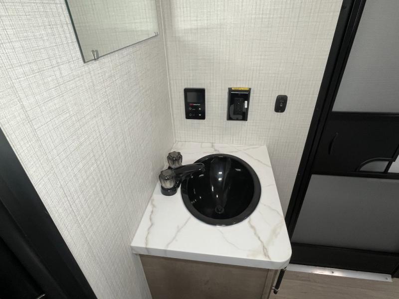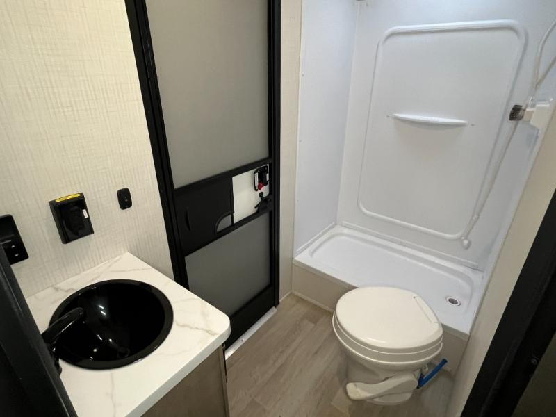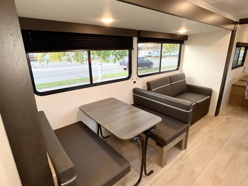 You'll have additional space to stretch out in this travel trailer for eight to ten! Within the slide you'll find the booth dinette and sofa that will be perfect for mealtimes, relaxing, and sleeping more guests, and there is an entertainment with TV prep for movie nights. The little ones will love the double-size bunks, and the full bath is close by for easy nighttime use, and one of the dual entry doors is found here for convenience. You'll have the front private bedroom with a queen bed all to yourselves, plus there are dual closets and nightstands for your things. This model also includes an exterior pass-through storage outside and a 16' power awning for protection against the sun!