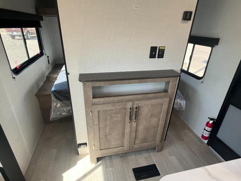 You'll have additional space to stretch out in this travel trailer for eight to ten! Within the slide you'll find the booth dinette and sofa that will be perfect for mealtimes, relaxing, and sleeping more guests, and there is an entertainment with TV prep for movie nights. The little ones will love the double-size bunks, and the full bath is close by for easy nighttime use, and one of the dual entry doors is found here for convenience. You'll have the front private bedroom with a queen bed all to yourselves, plus there are dual closets and nightstands for your things. This model also includes an exterior pass-through storage outside and a 16' power awning for protection against the sun!