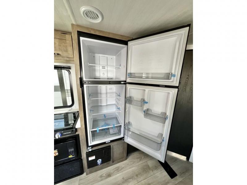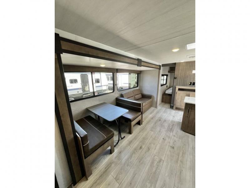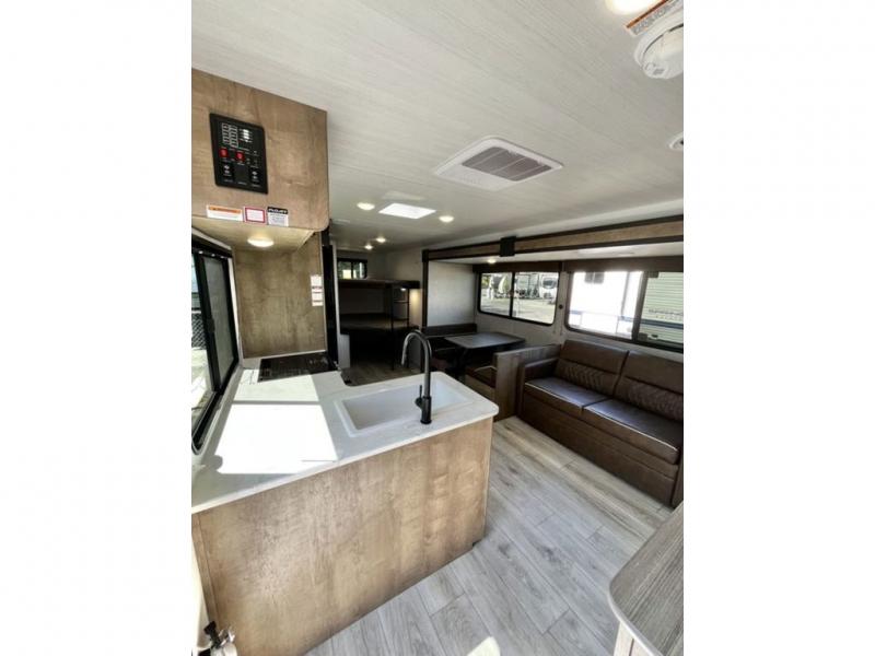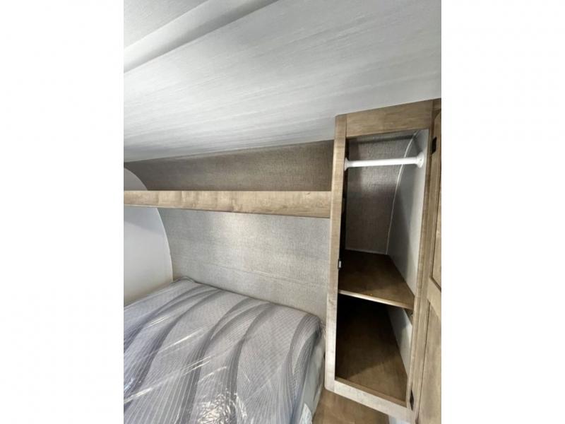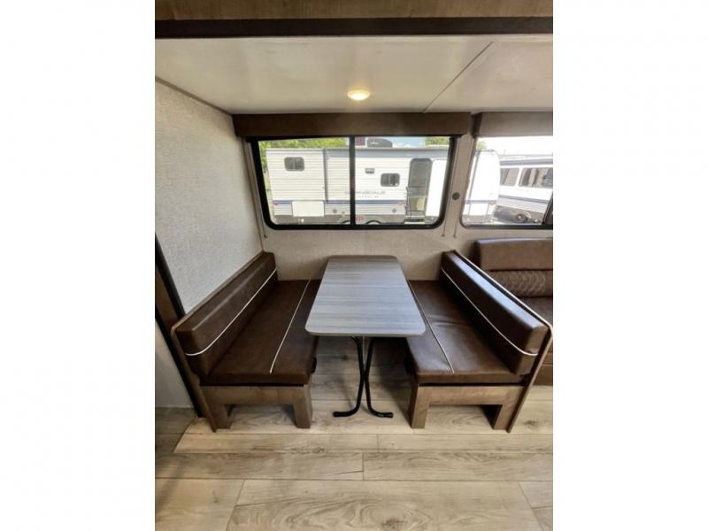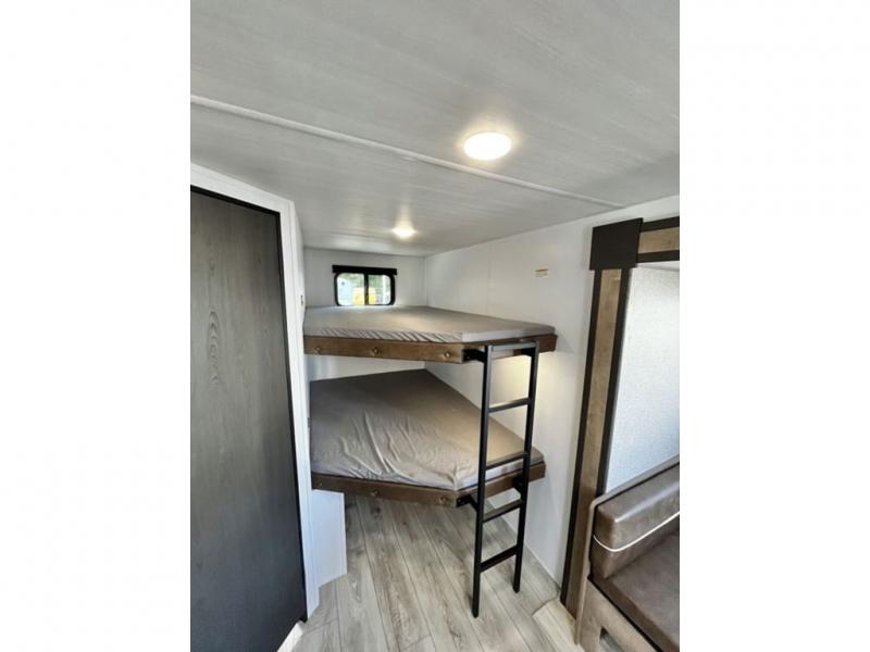 You'll have additional space to stretch out in this travel trailer for eight to ten! Within the slide you'll find the booth dinette and sofa that will be perfect for meal times, relaxing, and sleeping more guests, and there is an entertainment with TV prep for movie nights. The little ones will love the double-size bunks, and the full bath is close by for easy nighttime use. You'll have the front private bedroom with a queen bed all to yourselves, plus there are dual closets and nightstands for your things. This model also includes an exterior pass-through storage outside and a 16' power awning for protection against the sun!