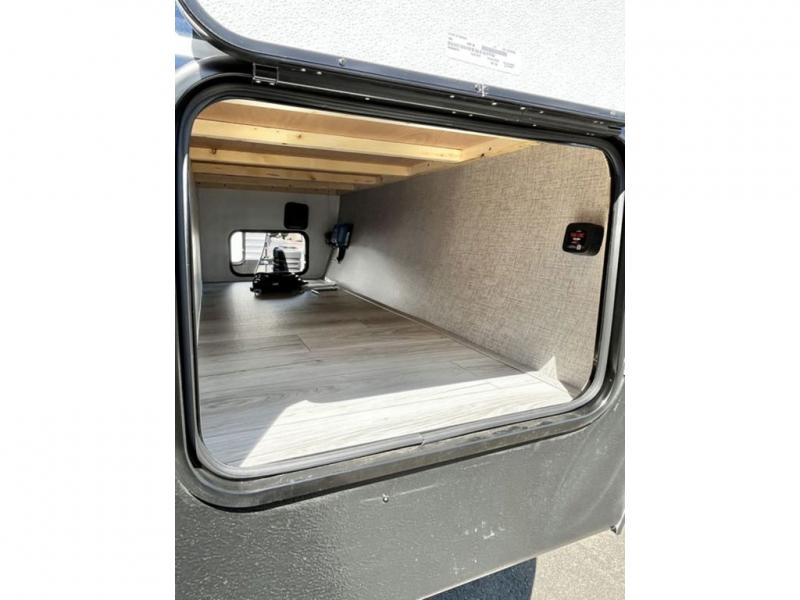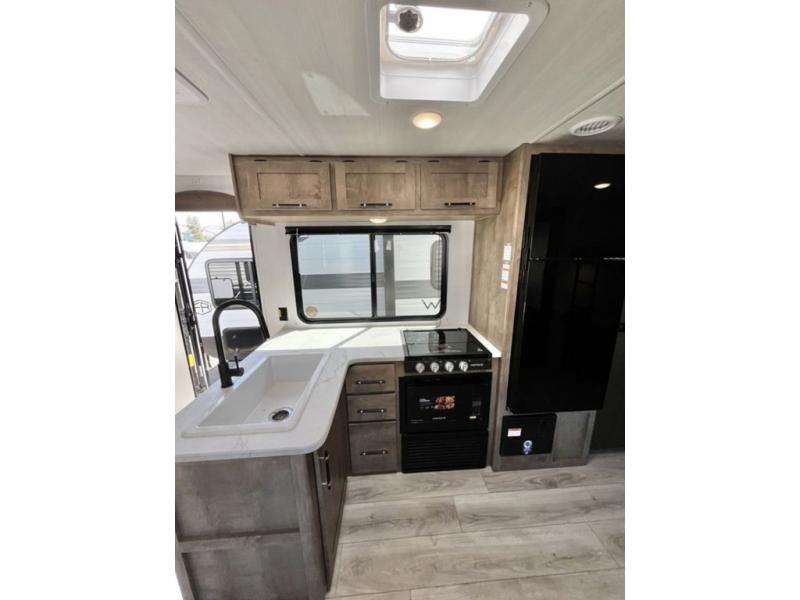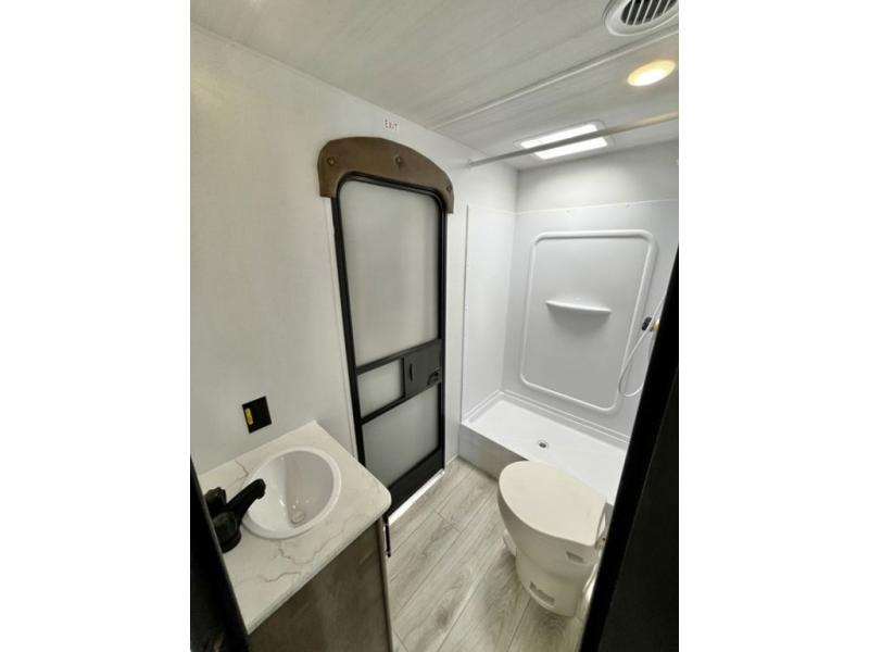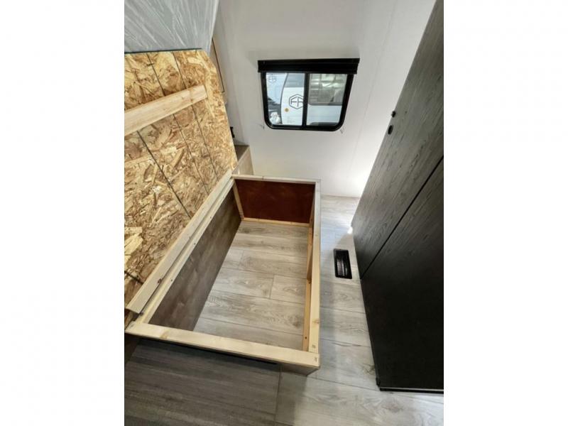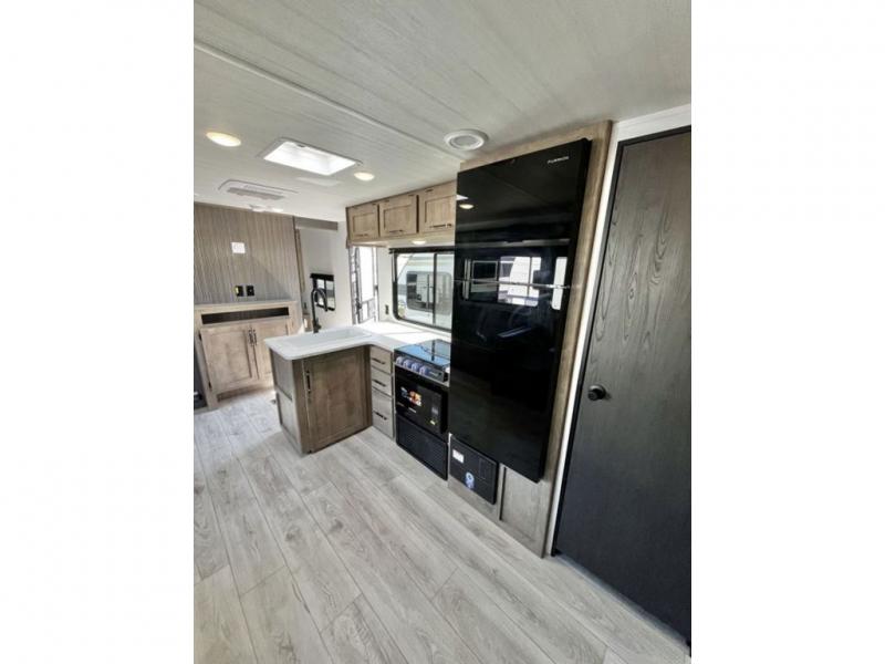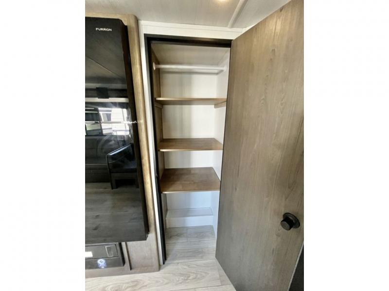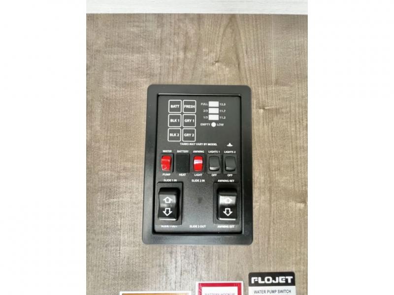 You'll have additional space to stretch out in this travel trailer for eight to ten! Within the slide you'll find the booth dinette and sofa that will be perfect for meal times, relaxing, and sleeping more guests, and there is an entertainment with TV prep for movie nights. The little ones will love the double-size bunks, and the full bath is close by for easy nighttime use. You'll have the front private bedroom with a queen bed all to yourselves, plus there are dual closets and nightstands for your things. This model also includes an exterior pass-through storage outside and a 16' power awning for protection against the sun!