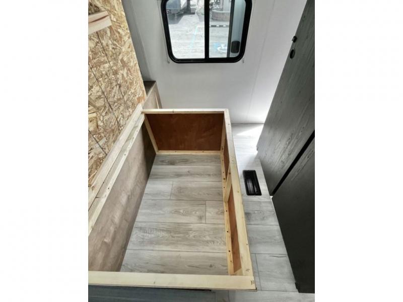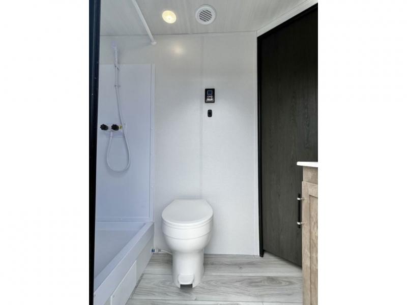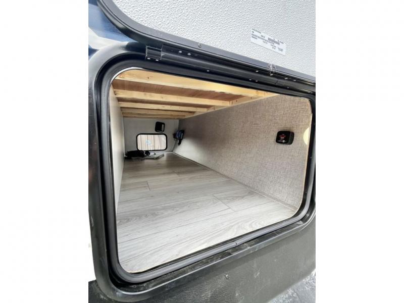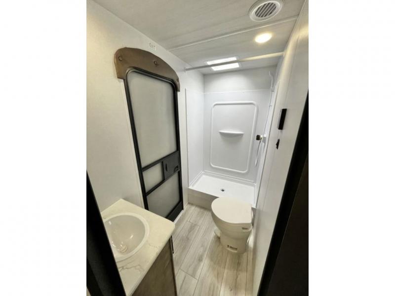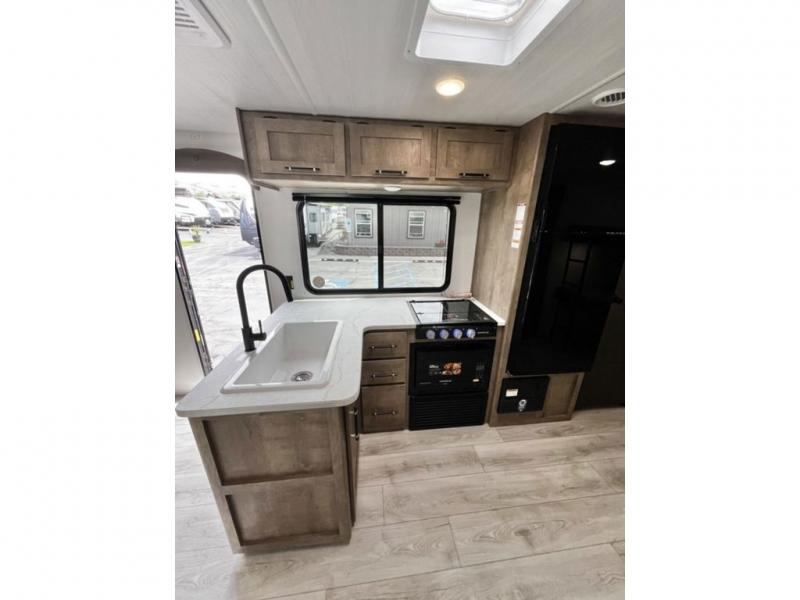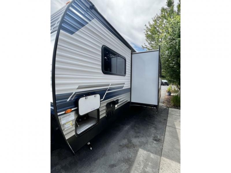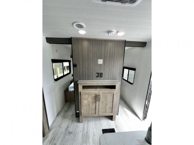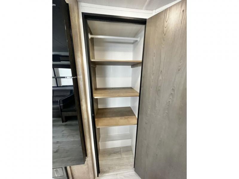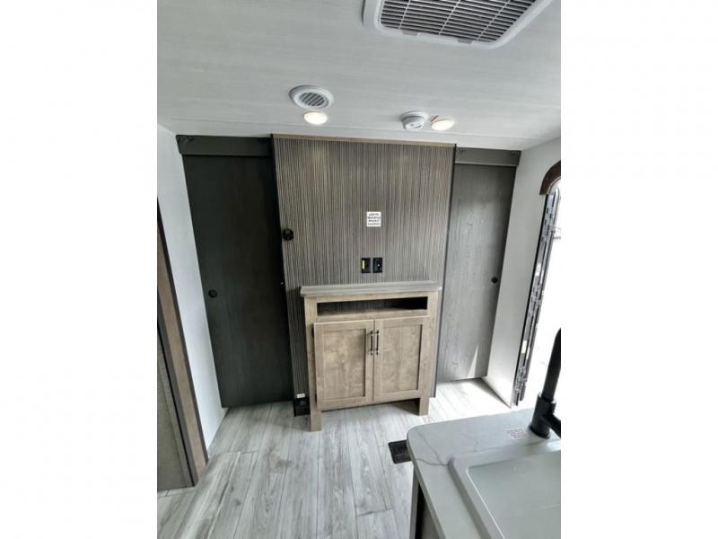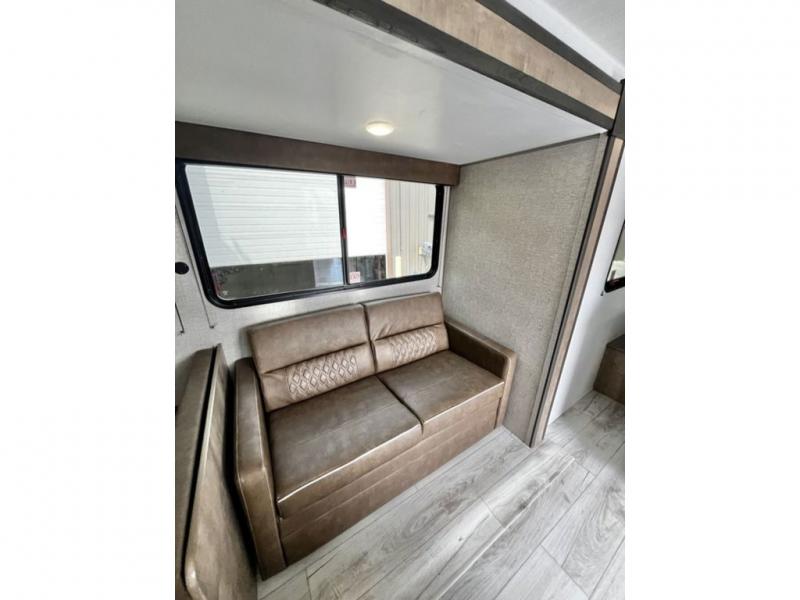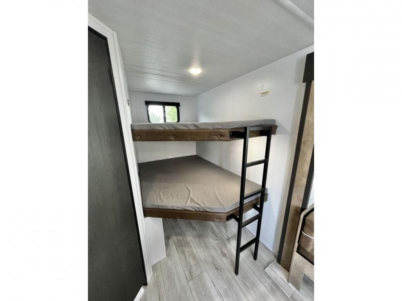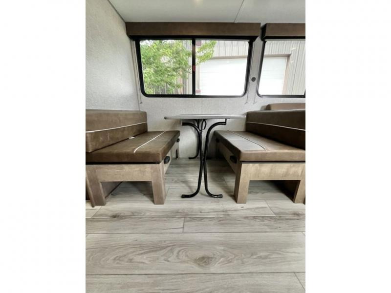 You'll have additional space to stretch out in this travel trailer for eight to ten! Within the slide you'll find the booth dinette and sofa that will be perfect for meal times, relaxing, and sleeping more guests, and there is an entertainment with TV prep for movie nights. The little ones will love the double-size bunks, and the full bath is close by for easy nighttime use. You'll have the front private bedroom with a queen bed all to yourselves, plus there are dual closets and nightstands for your things. This model also includes an exterior pass-through storage outside and a 16' power awning for protection against the sun!