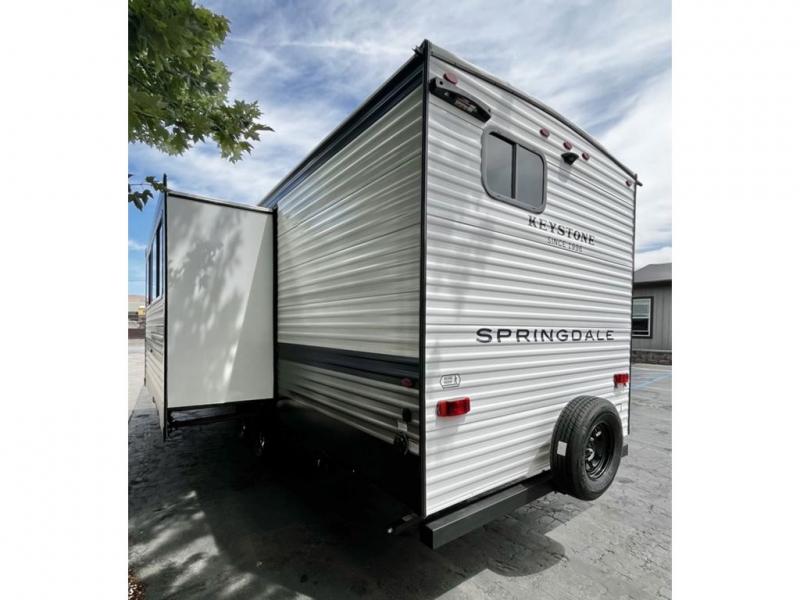 The Springdale Classic travel trailers by Keystone will provide you and your family many great outdoor experiences and it will also be kind to your pocketbook. Each one is constructed with an aluminum exterior, a walkable roof, and an I-beam frame with stamped steel cross-members and outriggers for added strength. There are also heavy duty stabilizer jacks and power tongue jacks outside, along with an XL entry assist handle for added convenience. Each travel trailer includes LED lighting, bedside outlets, and blackout night shades inside that will provide you with more privacy at night.