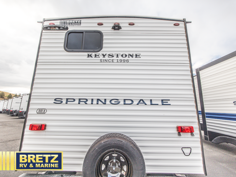 The Springdale Classic travel trailers by Keystone will provide you and your family many great outdoor experiences and it will also be kind to your pocketbook. Each one is constructed with an aluminum exterior, a walkable roof, and an I-beam frame with stamped steel cross-members and outriggers for added strength. There are also heavy duty stabilizer jacks and power tongue jacks outside, along with an XL entry assist handle for added convenience. Each travel trailer includes LED lighting, bedside outlets, and blackout night shades inside that will provide you with more privacy at night.