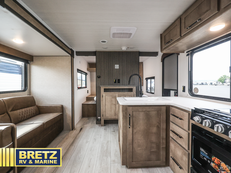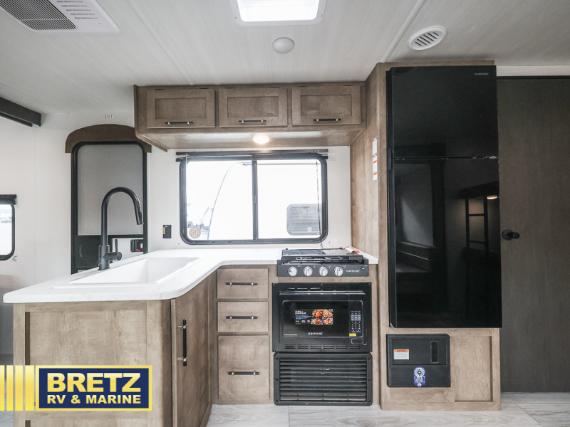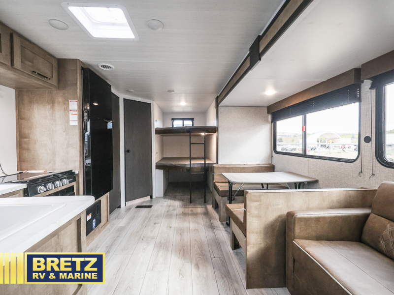 You'll have additional space to stretch out in this travel trailer for eight to ten! Within the slide you'll find the booth dinette and sofa that will be perfect for meal times, relaxing, and sleeping more guests, and there is an entertainment with TV prep for movie nights. The little ones will love the double-size bunks, and the full bath is close by for easy nighttime use. You'll have the front private bedroom with a queen bed all to yourselves, plus there are dual closets and nightstands for your things. This model also includes an exterior pass-through storage outside and a 16' power awning for protection against the sun!