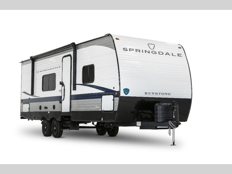 The Springdale Classic travel trailers by Keystone will provide you and your family many great outdoor experiences and it will also be kind to your pocketbook. Each one is constructed with an aluminum exterior, a walkable roof, and an I-beam frame with stamped steel cross-members and outriggers for added strength. There are also heavy duty stabilizer jacks and power tongue jacks outside, along with an XL entry assist handle for added convenience. Each travel trailer includes LED lighting, bedside outlets, and blackout night shades inside that will provide you with more privacy at night.