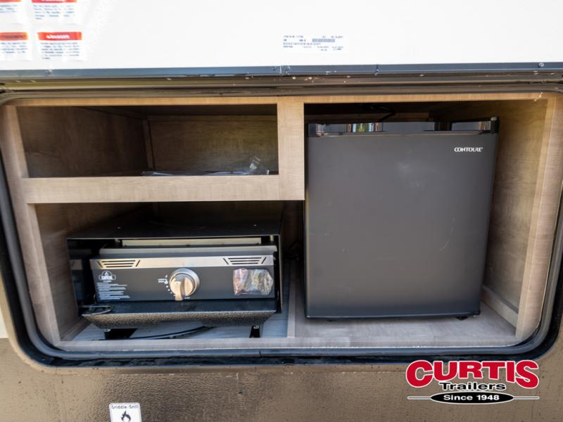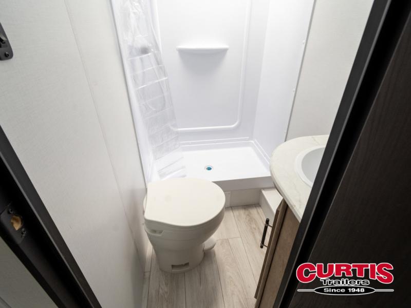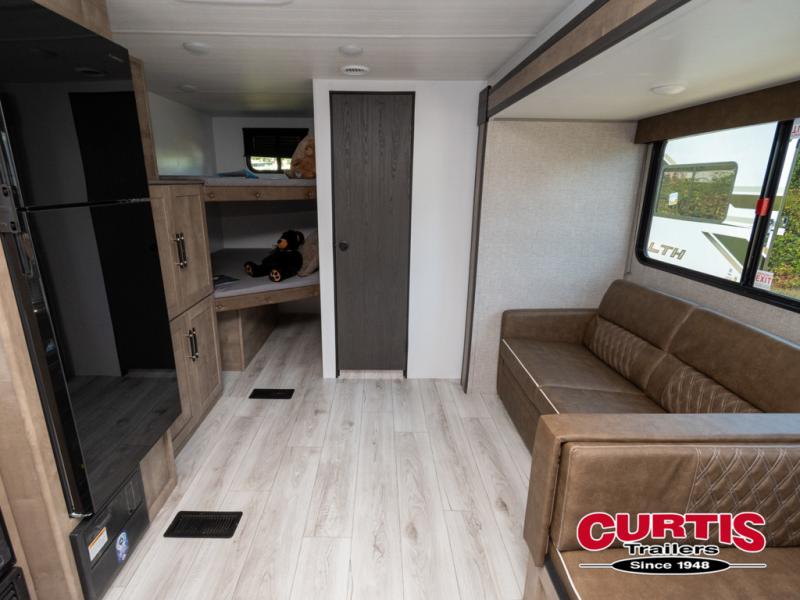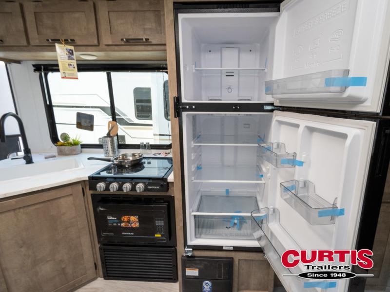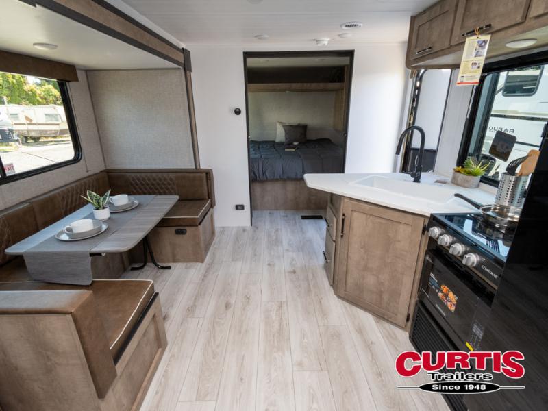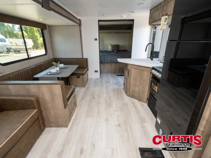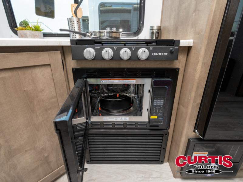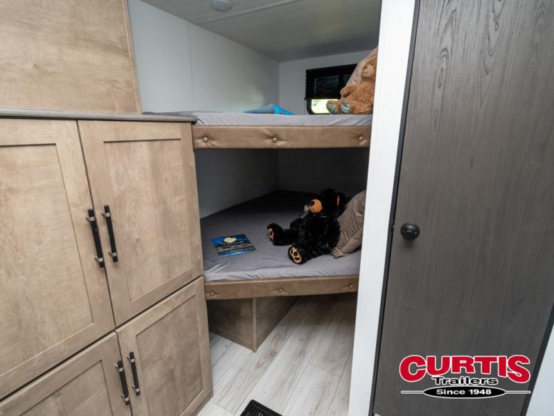 What could be better than camping with double-size bunks for guests? How about a front private bedroom for you, a full bath to clean up in, and a large slide out for maximum space! The chef of your group can prepare breakfast on the cooktop in the morning, or use the microwave if you're on the go. There is a U-shaped dinette to dine at, or you can take your plate outdoors to sit under the power awning.