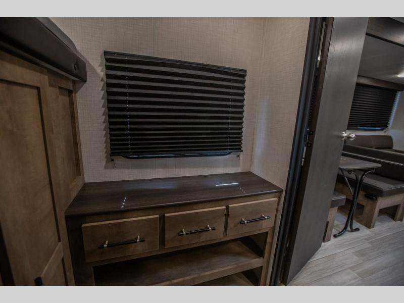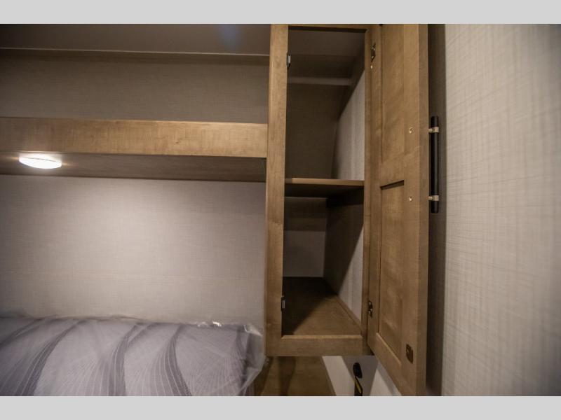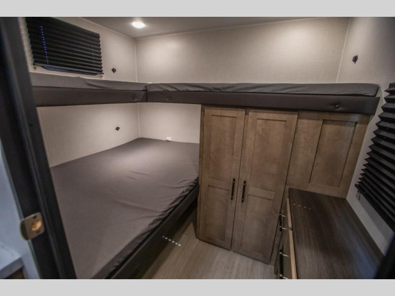 Camping with friends and family is easier than ever in this spacious trailer with a rear private bunkhouse! You'll find triple bunks in this room, along with two closets to keep everything tidy. The front private bedroom will feel just like home with its queen bed, plus dual closets and dual nightstands. Your crew can all gather in the main living area to relax on the sofa or play a game at the booth dinette, and there is even TV prep in this room if you enjoy movie nights. Head outdoors to relax under the 16' power awning.