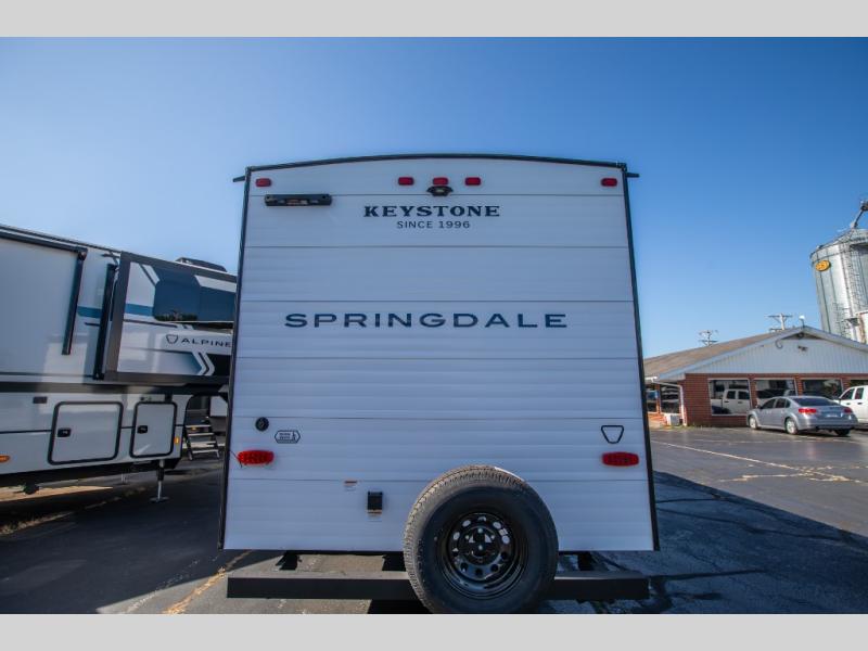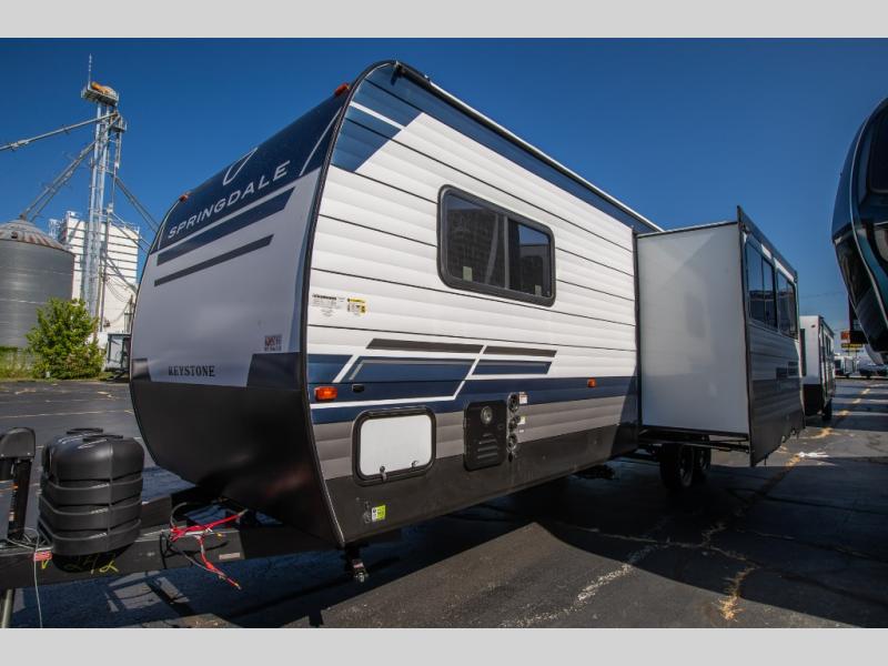 The Springdale Classic travel trailers by Keystone will provide you and your family many great outdoor experiences and it will also be kind to your pocketbook. Each one is constructed with an aluminum exterior, a walkable roof, and an I-beam frame with stamped steel cross-members and outriggers for added strength. There are also heavy duty stabilizer jacks and power tongue jacks outside, along with an XL entry assist handle for added convenience. Each travel trailer includes LED lighting, bedside outlets, and blackout night shades inside that will provide you with more privacy at night.
