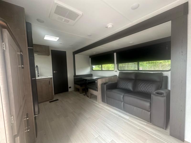 Camping with friends and family is easier than ever in this spacious trailer with a rear private bunkhouse! You'll find triple bunks in this room, along with two closets to keep everything tidy. The front private bedroom will feel just like home with its queen bed, plus dual closets and dual nightstands. Your crew can all gather in the main living area to relax on the sofa or play a game at the booth dinette, and there is even TV prep in this room if you enjoy movie nights. Head outdoors to relax under the 16' power awning.